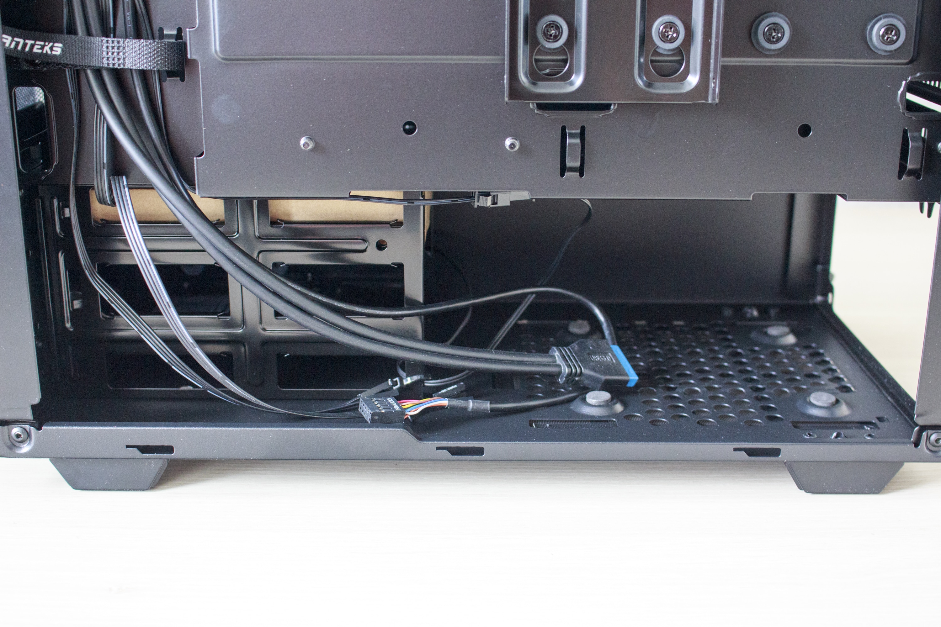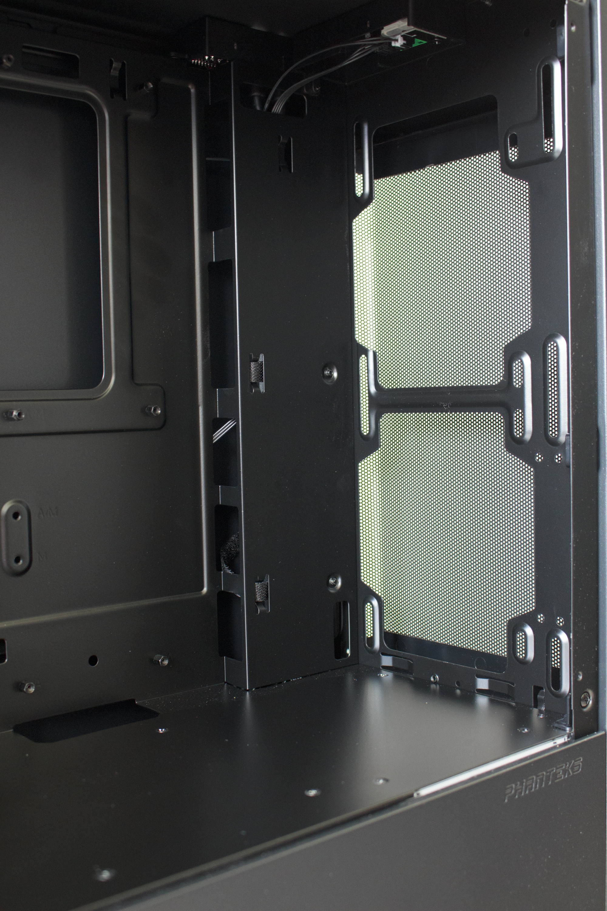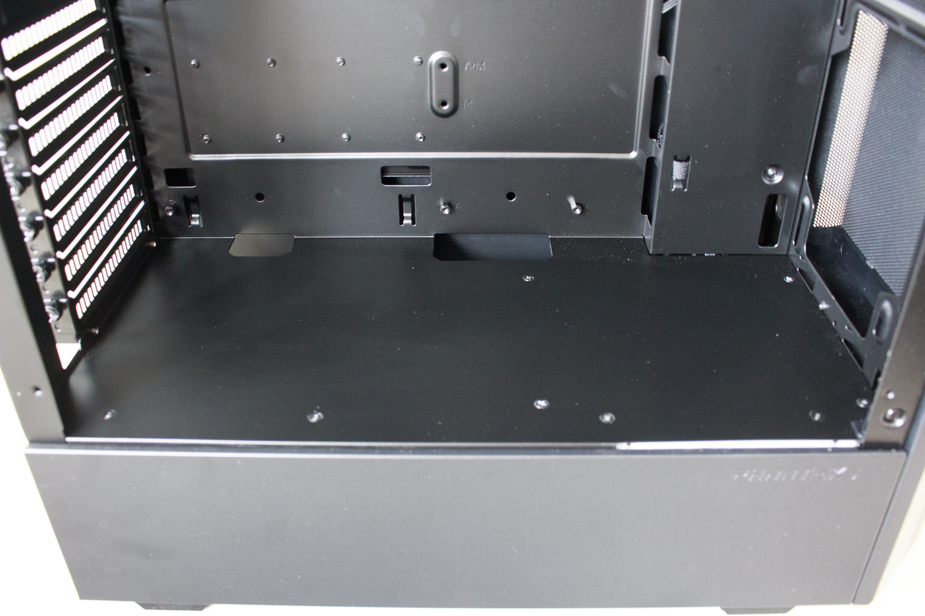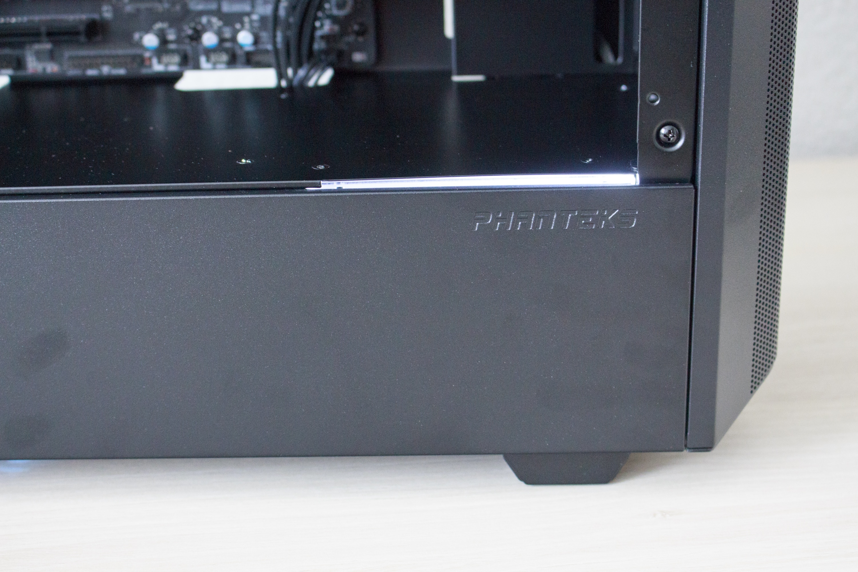Der Innenraum des Phanteks Eclipse P300 Air ist für heutige Standards klassisch gestaltet und wurde durch eine Netzteilabdeckung in zwei unterschiedliche Bereiche unterteilt. Unterhalb dieser Abdeckung verstecken sich das Netzteil und der HDD-Käfig für zwei 3,5″- bzw. 2,5″-Festplatten. Um die Verlegung von Kabeln zu erleichtern, befinden sich in der Netzteilabdeckung zwei Kabelmanagement-Öffnungen. Ansonsten ist der Tunnel komplett geschlossen und lässt keinen Blick auf den unten Bereich zu. Eine Eigenschaft die uns erst nach dem Anschalten des verbauten System aufgefallen ist, ist ein weißer LED-Streifen oberhalb des Phanteks-Schriftzuges. Dieser scheint leicht durch das Sidepanel, ist aber farblich nicht veränderbar.