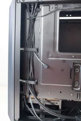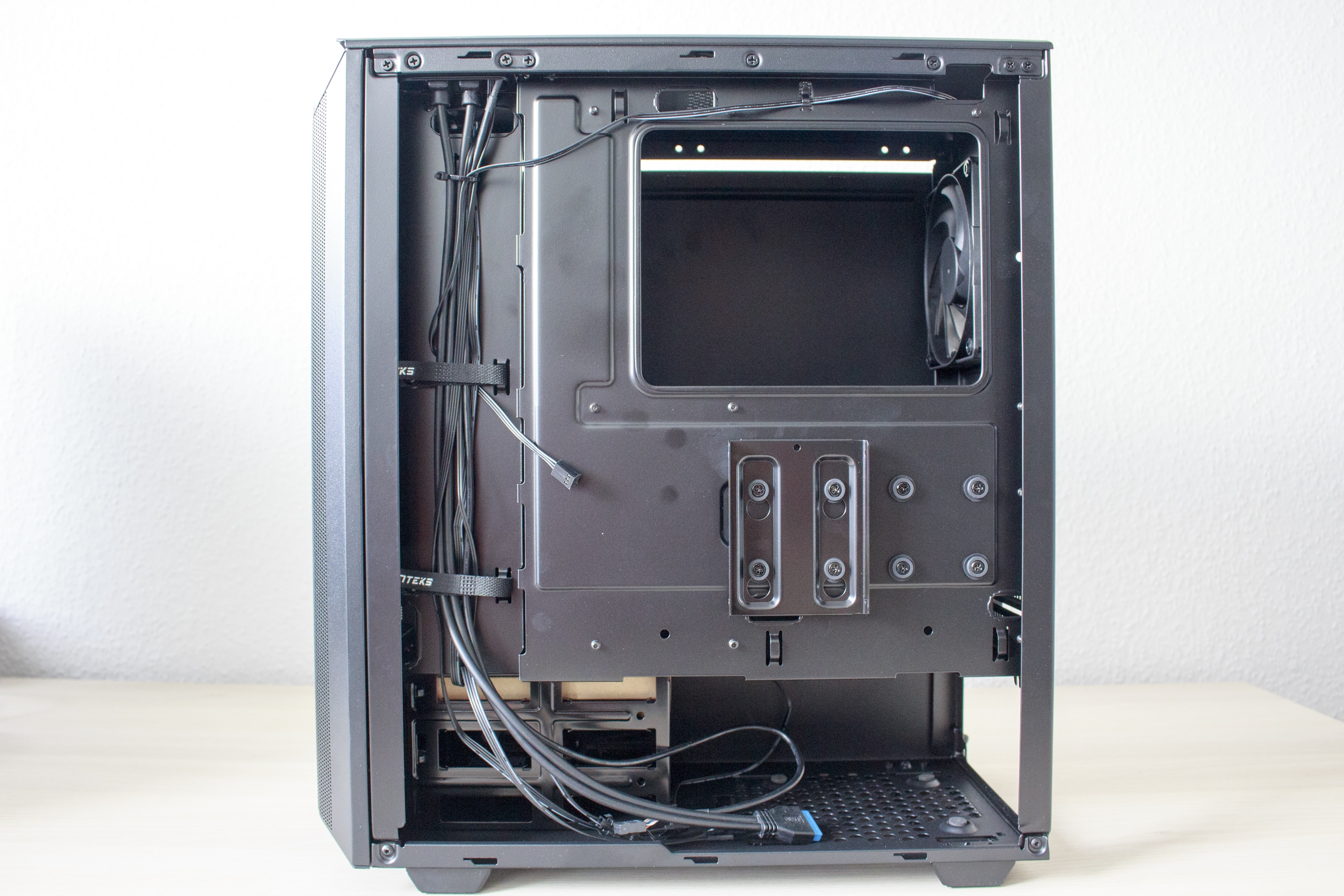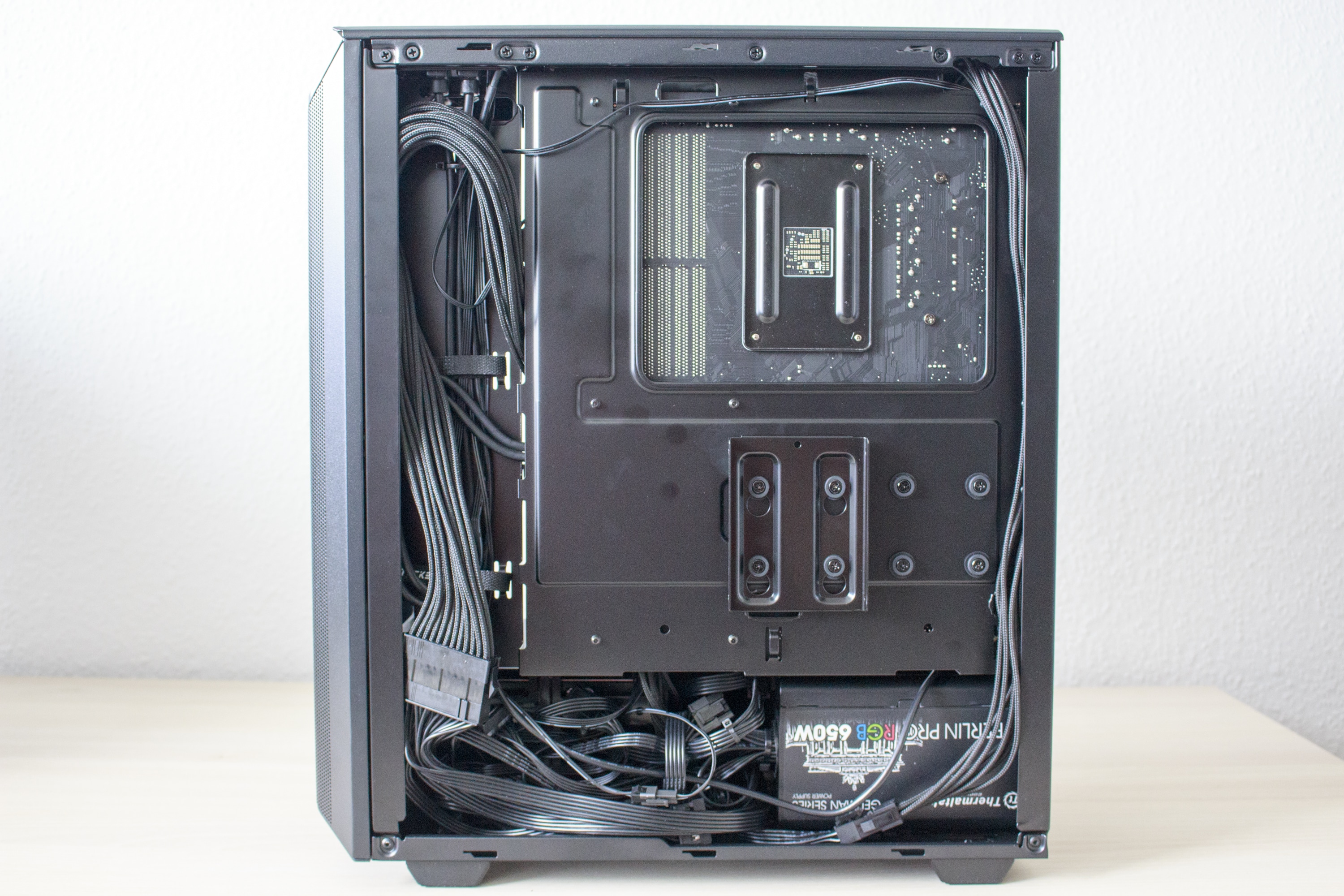 Werfen wir nun einen Blick auf die Rückseite. Zu finden sind hier diverse Haltepunkte für Kabelbinder und ein entkoppelter Rahmen für 2,5″-HDDs oder SSDs. Außerdem könnte ein zweiter, aber nicht im Lieferumfang enthaltener, HDD-Rahmen auf der Rückseite montiert werden. Im linken Bereich wurde ein Kabelmanagement-Kabel eingelassen und die komplett schwarzen I/O-Kabel wurden vorverlegt. Dazu hat Phanteks zwei praktische Klettstreifen verwendet.