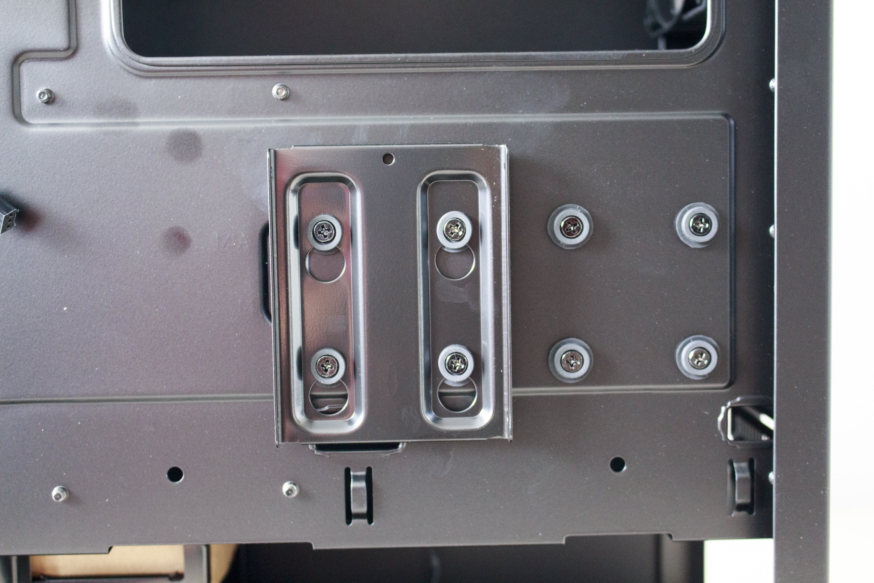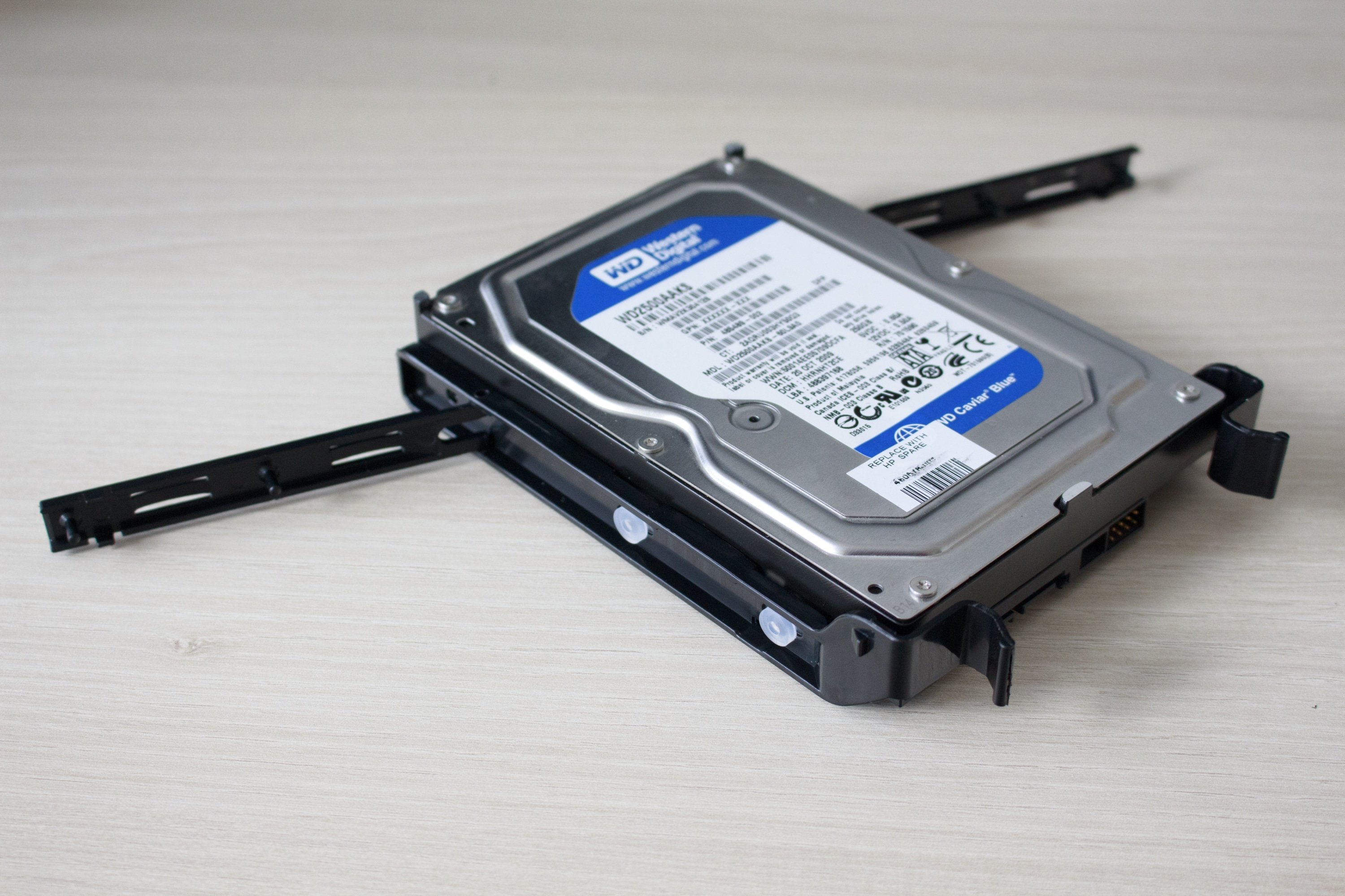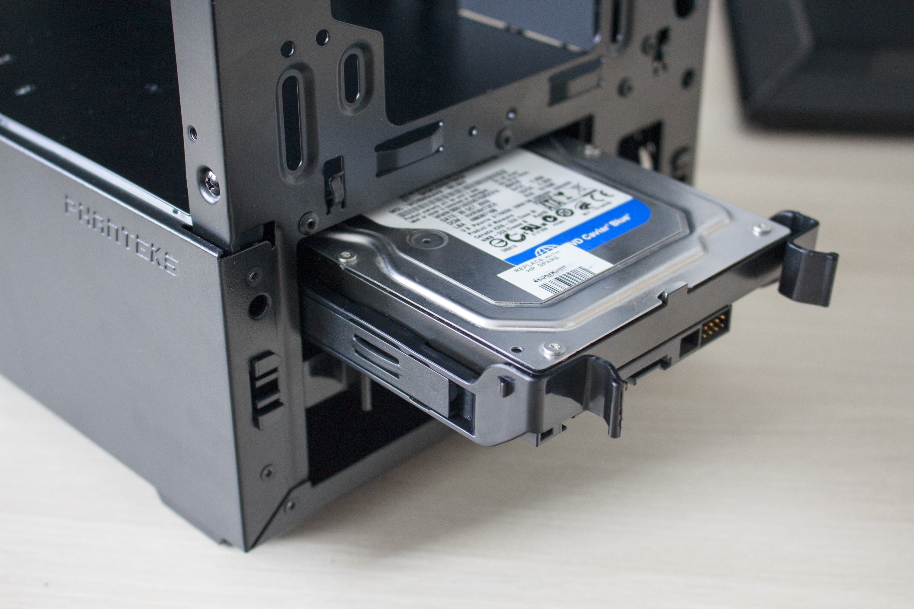 Die Montage der Datenträger am Rahmen erfordert im Fall der 2,5″-HDD die Verwendung eines Schraubendrehers. Der HDD-Tray kann anschließend jedoch werkzeuglos am Mainboard-Schlitten eingehängt werden. Die großen 3,5″-Festplatten können hingegen komplett ohne Werkzeug befestigt werden. Dazu werden die seitlichen Bügel am Rahmen aufgeklappt, die HDD wird eingelegt und zuletzt werden die Bügel wieder zugeklappt. Die Anschlüsse zeigen dann ebenfalls nach vorne. Um die Verkabelung zu erleichtern, hat der Hersteller zum Glück auch an eine entsprechende Öffnung gedacht.