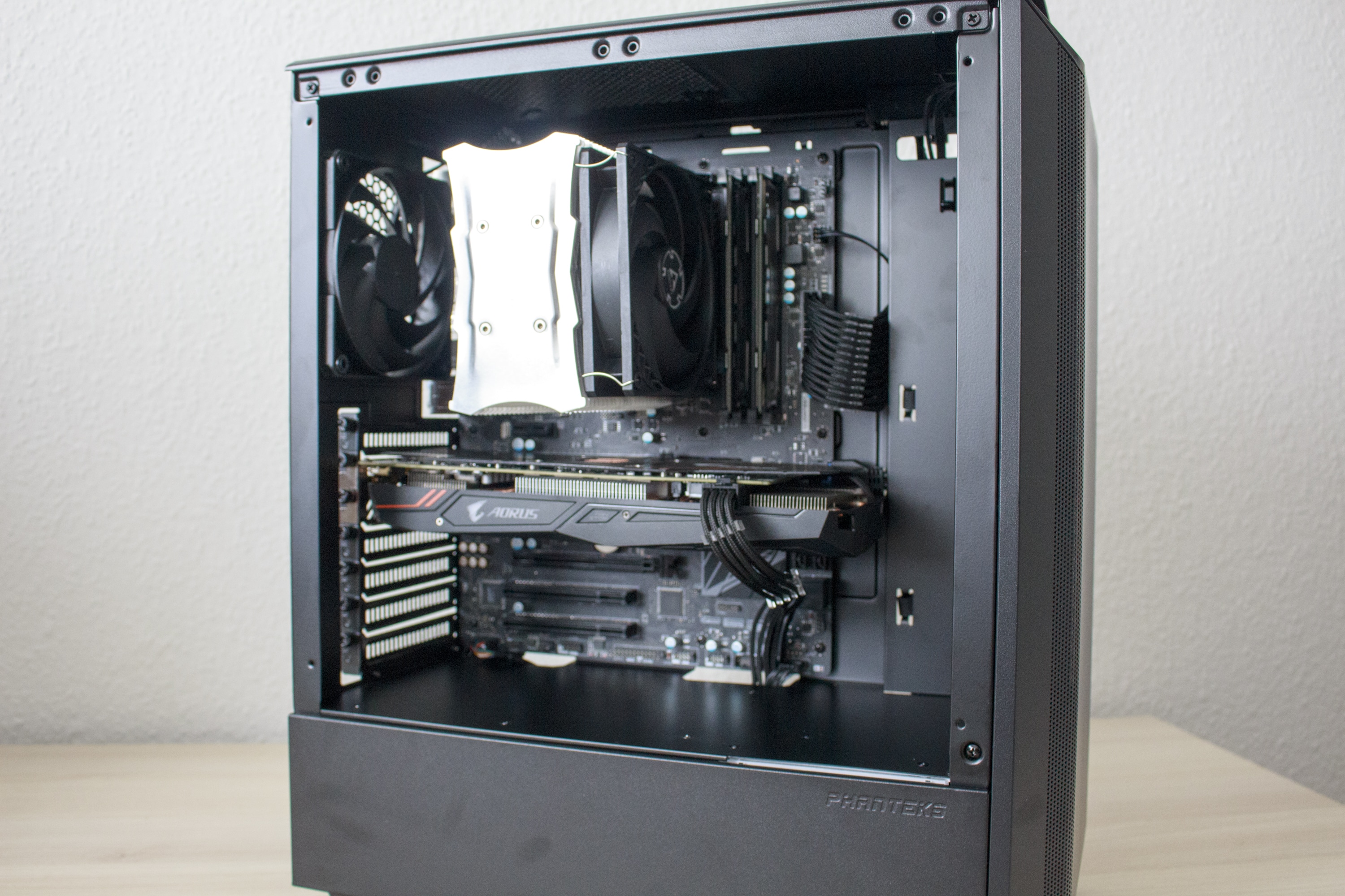Nun kommen wir zum Systemeinbau. Als Hardware verwenden wir einen AMD Ryzen 7 2700X* auf einem MSI B350 PC Mate mit 16GB Crucial Ballistix Sport LT grau DDR4-2666. Der Ryzen wird von einem EKL Alpenföhn Matterhorn Pure gekühlt. Für die Bildausgabe ist eine GTX 1060 6GB von Gigabte AORUS zuständig. Die Stromversorgung erledigt das nichtmodulare Berlin Pro RGB 650W mit RGB-Lüfter. Um die Verkabelung optisch noch etwas aufzuwerten, wurden zudem einzeln gesleevte Kabelverlängerungen von Phanteks verwendet.