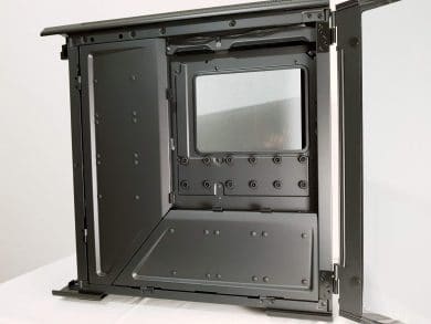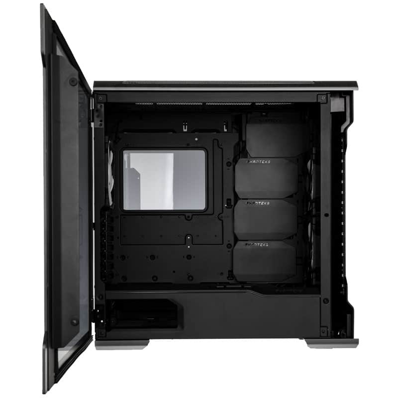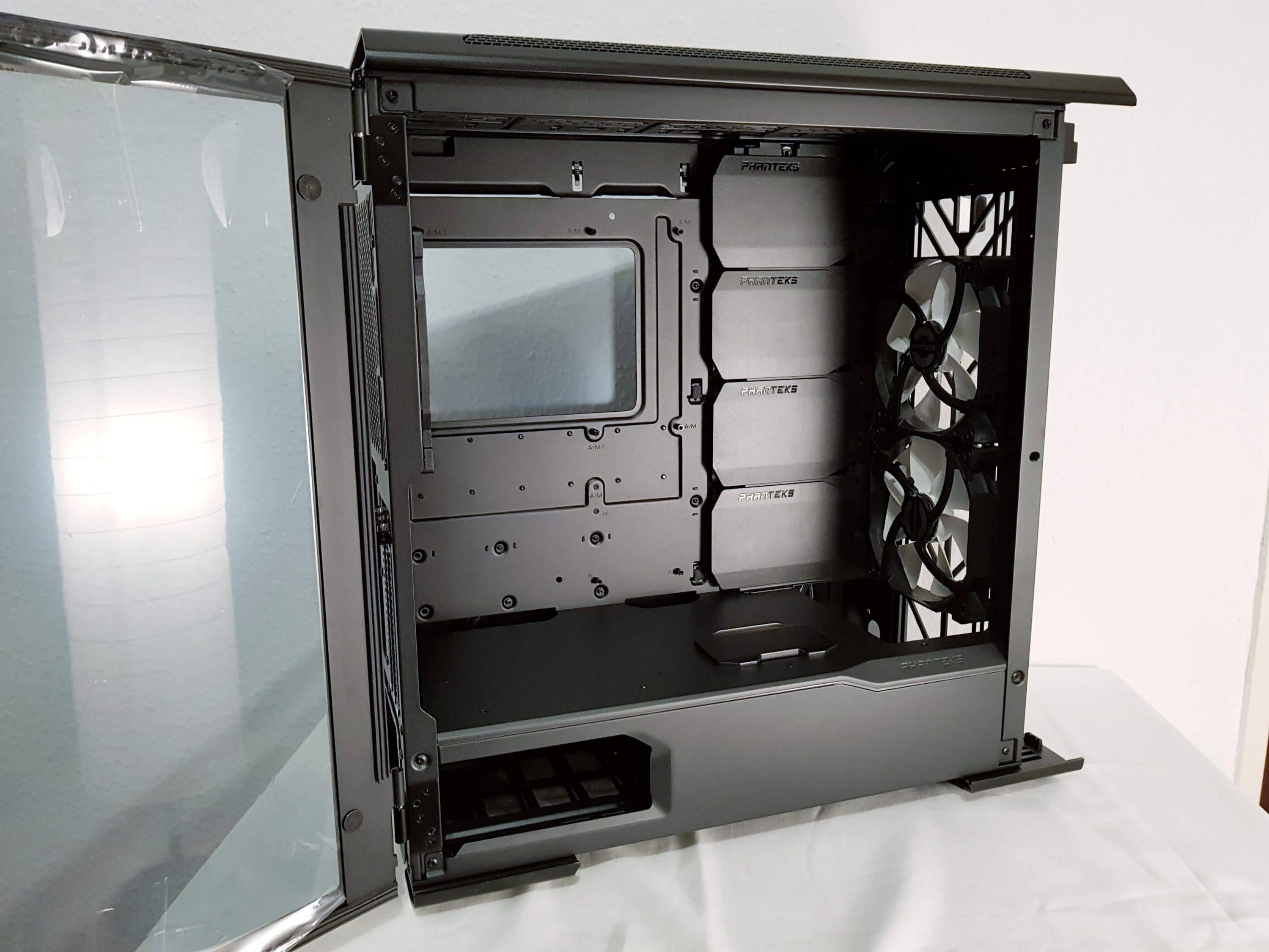 Der Phanteks Enthoo Evolv X Midi-Tower ist ein gelungenes Upgrade der beliebten Gehäuse-Serie. Die Hartglas-Seitenteile sitzen auf zwei Scharnieren und können nun bequem geöffnet werden, ohne irgendwelche Schrauben lösen zu müssen. Für den Systembau können die Türen auch komplett abgenommen werden. Über die Front können die Seitenteile zudem festgeschraubt werden, sodass diese zum Beispiel beim Transport zusätzlich gesichert werden können. An den Rändern der Seitenteile sorgen Gummidichtungen dafür, dass das Case komplett geschlossen ist, wodurch sich der Airflow verbessert. Magneten halten die Hartglas-Seitentüren geschlossen.