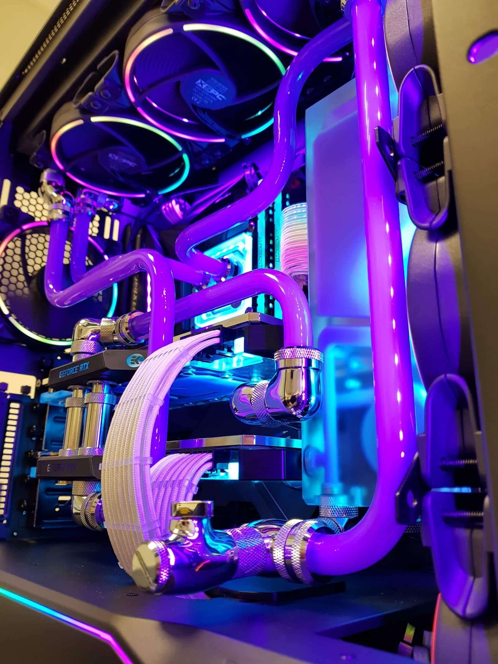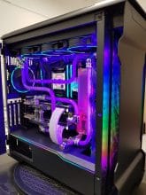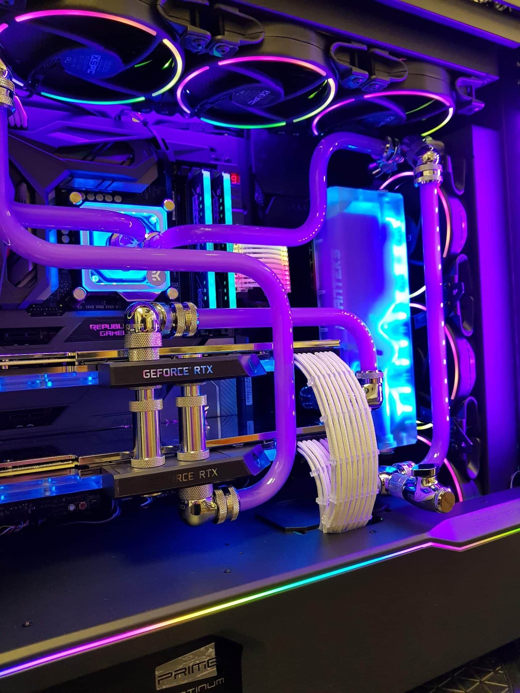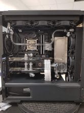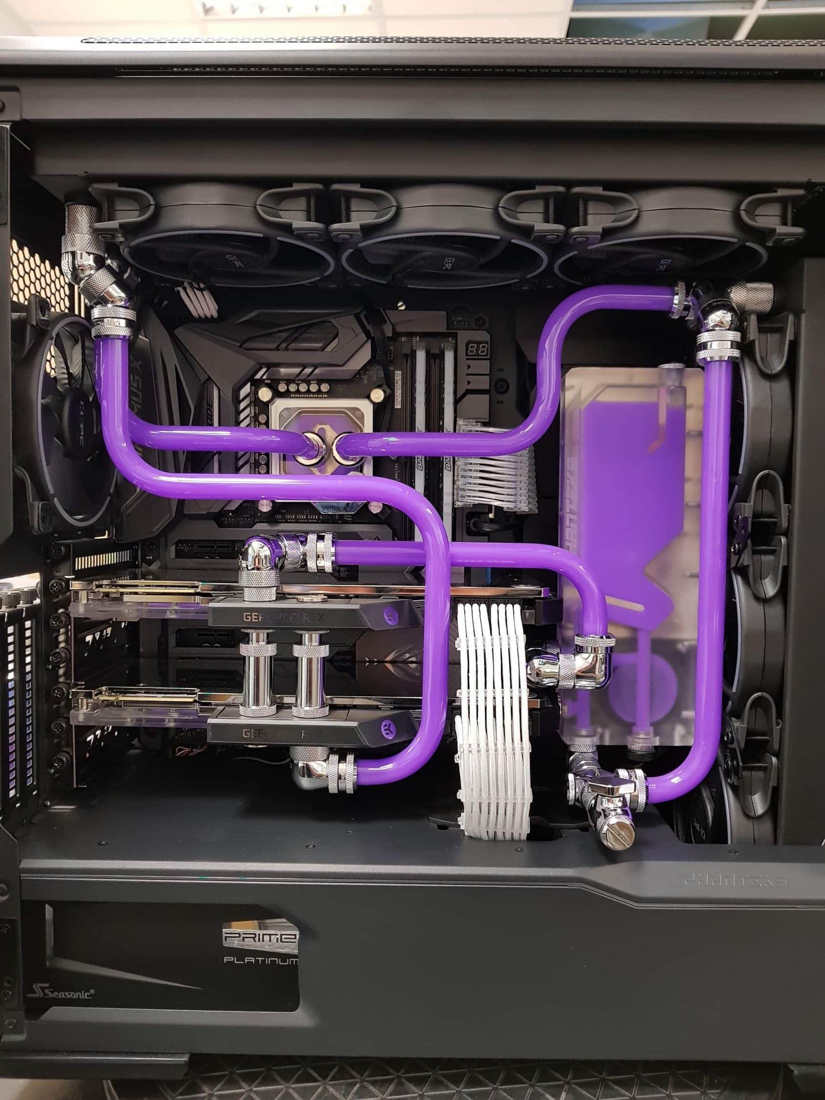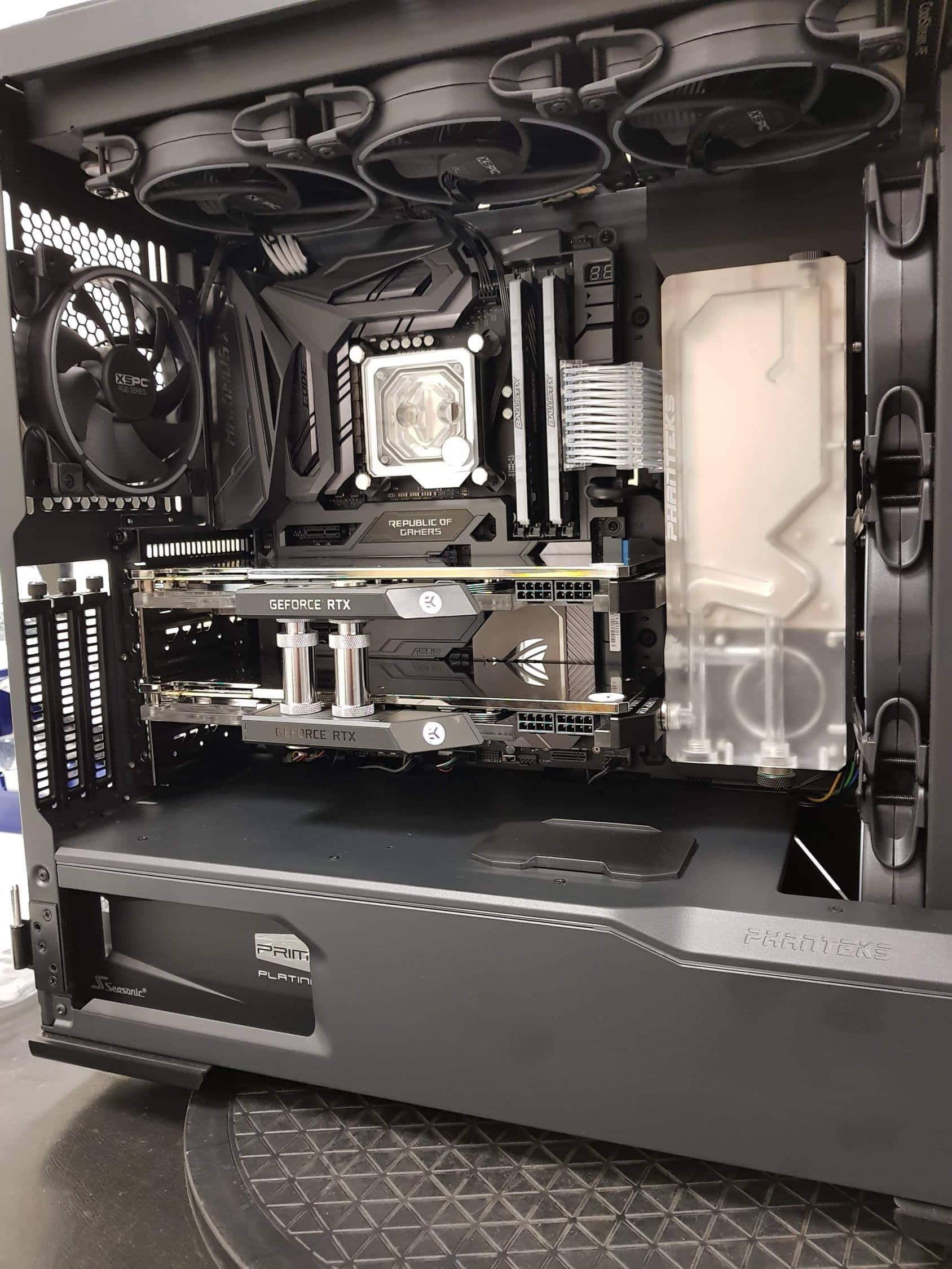 In das System habe ich einen auf 5,1 GHz übertakteten Intel Core i7-8086k Prozessor und zwei GeForce RTX 2080 Ti Grafikkarten eingebaut und alles mit genügende Kühlleistung in Form einer Custom-Wasserkühlung versehen. Was die Radiatoren eingeht, habe ich hier zwei 360-mm-Wärmetauscher, beide 38 mm dick, Vorne und Oben installiert. Nebenbei habe ich den Glacier R220 Ausgleichsbehälter von Phanteks genommen und in diesen eine DDC 3.2 PWM Elite Pumpe von EK Water Blocks installiert. Die Fittinge und Lüfter kommen von XSPC. Ich habe die folgende Hardware eingebaut: