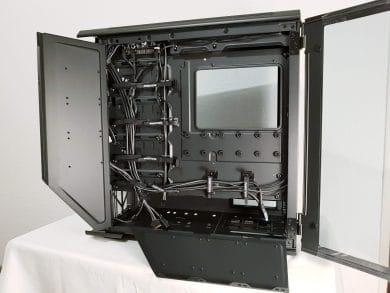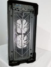 Das Gehäuse ist perfekt für Systeme mit Custom-Wasserkühlung. Man kann im Deckel einen Radiator von max. 360 mm, an der Rückseite von 140 mm und in der Front von max. 420 mm Länge installieren. Welche man mit welchem paart, hängt von der Dicke der Radiatoren ab.