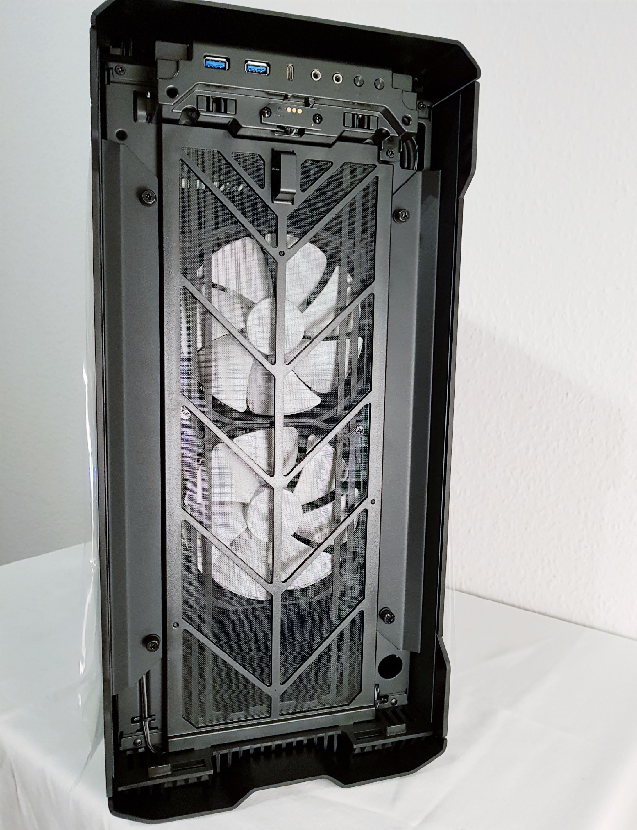 Der Airflow wurde deutlich verbessert, da die Lufteinlässe an der Stirn- und Oberseite des Gehäuses nun 30 mm breit sind, sodass mehr Luft in das Gehäuse gelangen kann. Außerdem ist das ganze Gehäuse auch ein bisschen höher und breiter als sein Vorgänger (Evolv ATX). Das Evolv X bietet überraschend viel Platz für Kabelmanagement und auch die beiden abnehmbaren Seitenwände haben mich begeistert. Das Gehäuse bietet viel Platz für die Laufwerke und nimmt bis zum 9 SSDs (6 Montageschlitten im Lieferumfang) und 10 HDDs (4 Montageschlitten im Lieferumfang), wobei die HDD-Käfige völlig verschiebbar und abnehmbar sind.