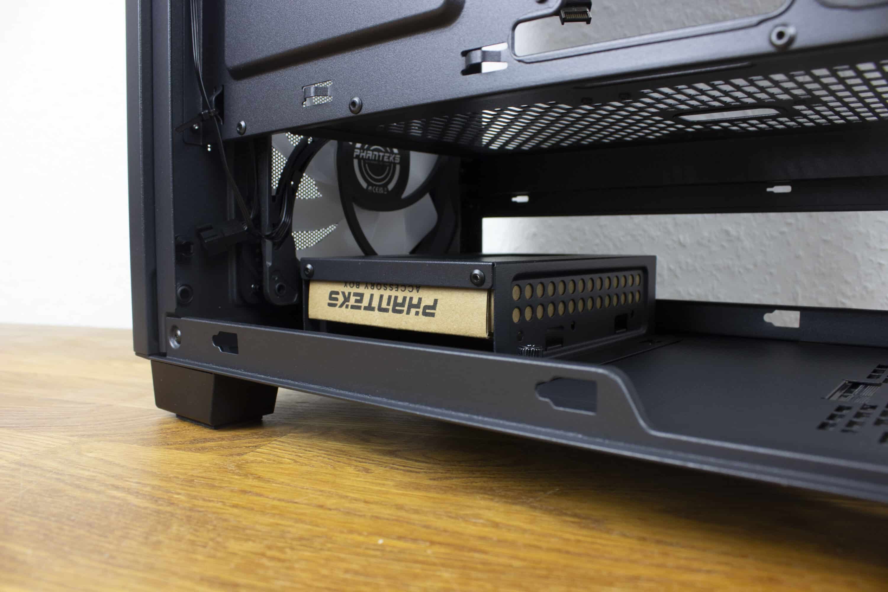 Im unteren Bereich ist der Festplattenkäfig sowie Platz für das Netzteil zu finden. Solltet ihr keine 3,5-Zoll-HDD benötigen und kommt mit der Montageplatte hinter dem Mainboard klar, könnt ihr den Käfig ausbauen und habt noch mehr Platz für die Kabel aus dem Netzteil. Direkt unter dem Netzteil finden wir außerdem noch ein Mesh-Gitter, welches wir zum sauber machen einfach entnehmen können.