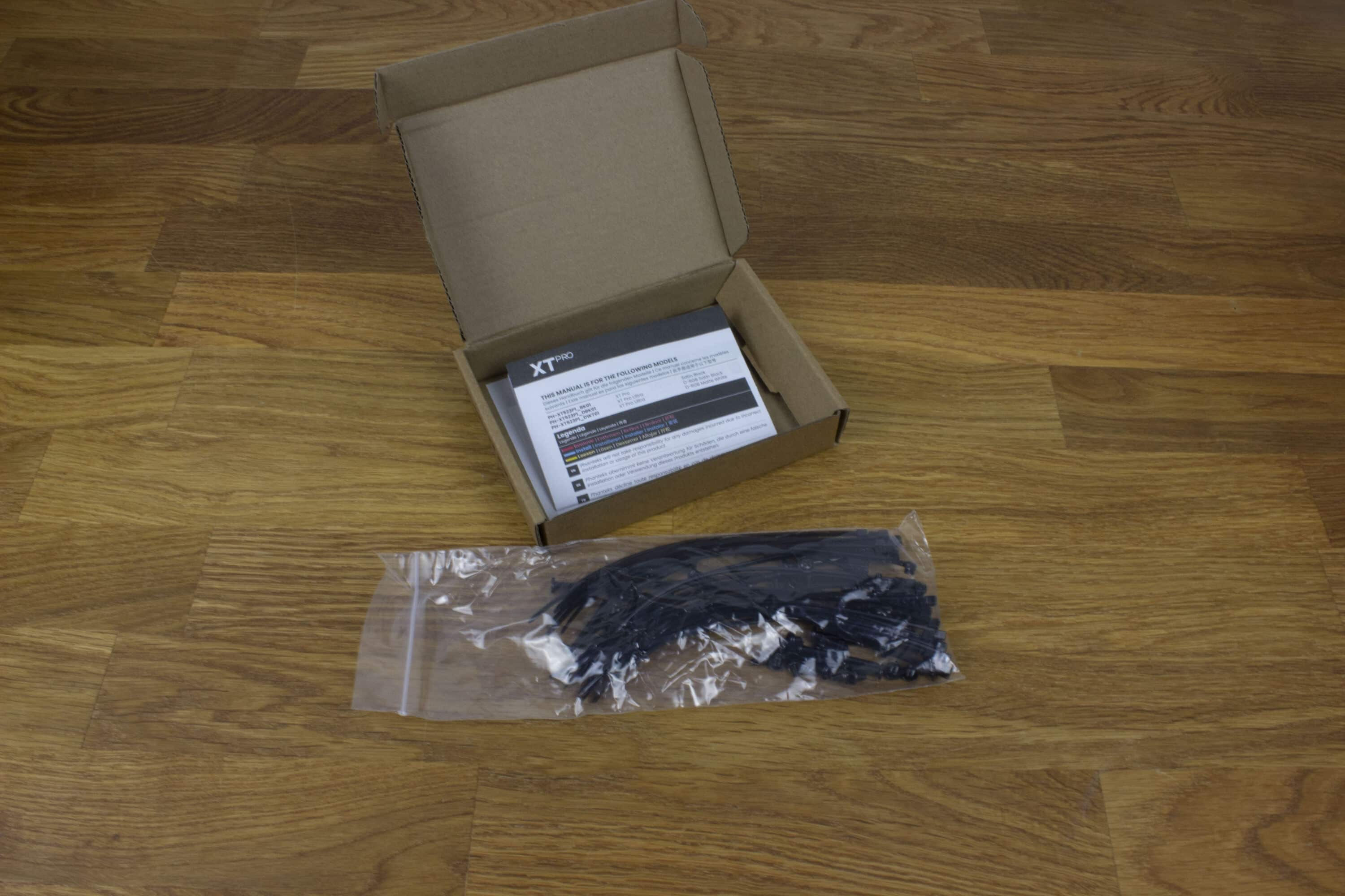 Nach dem Auspacken finden wir im Festplattenkäfig das Montagematerial. An Kabelbindern wird bei Phanteks auf jeden Fall nicht gespart, davon finden wir genug in dem kleinen Karton – insgesamt 30 Stück. Auch für genügend Schrauben ist gesorgt, besonders bei der Vielzahl SSD-Montageplätze. Einen kleinen Pluspunkt gibt es für die Zugabe eines kleinen Extras. Zum Entfernen der Mainboard-Abstandshalter liegt ein kleines Tool dabei. So könnt ihr mit einem Kreuzschraubendreher die Abstandshalter einfach entfernen.