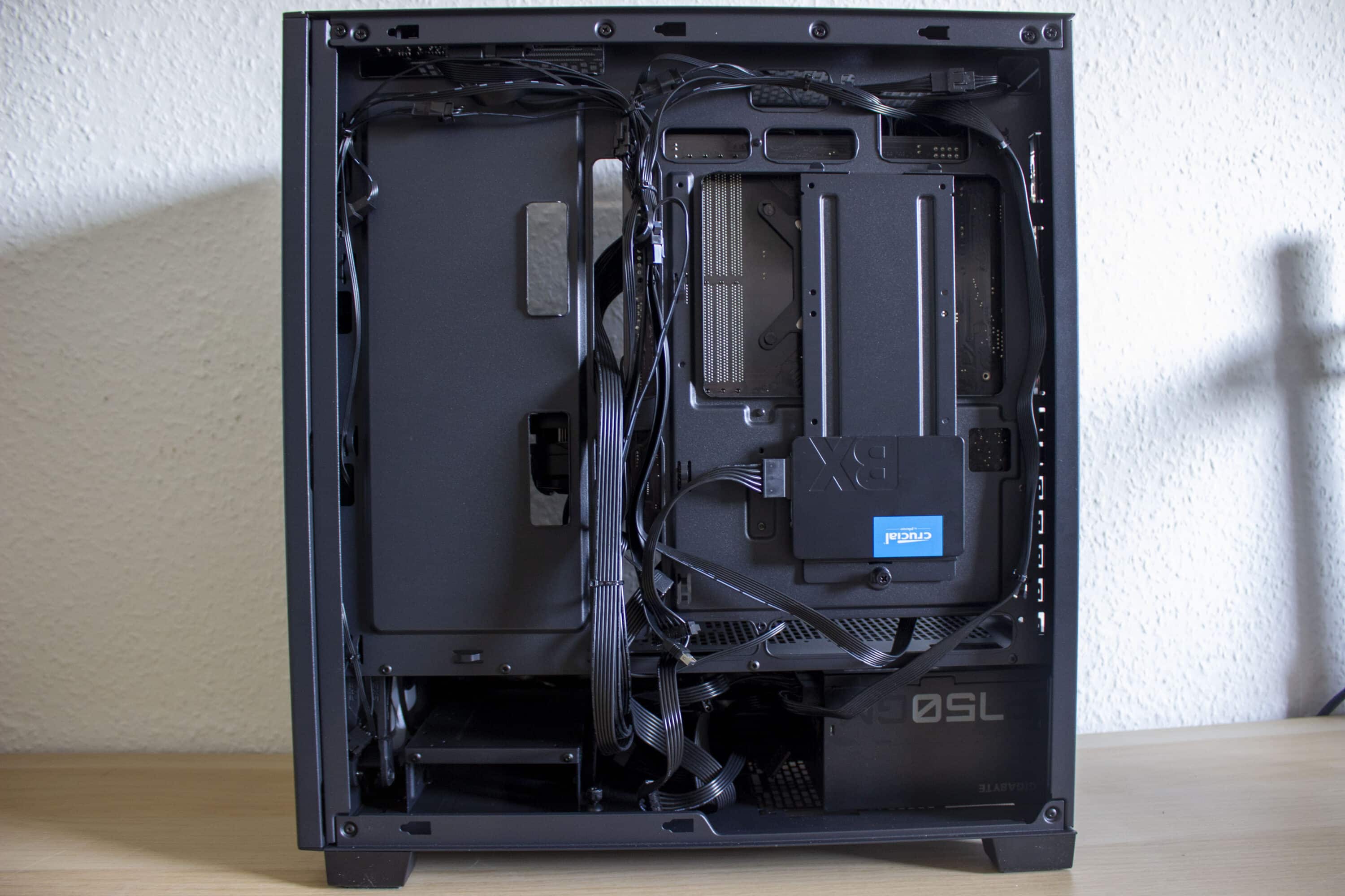 Hinter dem Mainboard-Tray haben wir genug Platz für Kabelmanagement. Leider gibt es keine richtigen Kabelführungen sondern nur ein paar Ösen, an denen die Kabelbinder fixiert werden können. Zusammen mit dem mitgelieferten Kabelbindern, kann das Kabelmanagement aber schon ordentlich durchgeführt werden. Außerdem ist direkt hinter dem Mainboard die Montageplatte für drei SSDs. Die gesamte Platte kann über eine Rändelschraube demontiert werden.