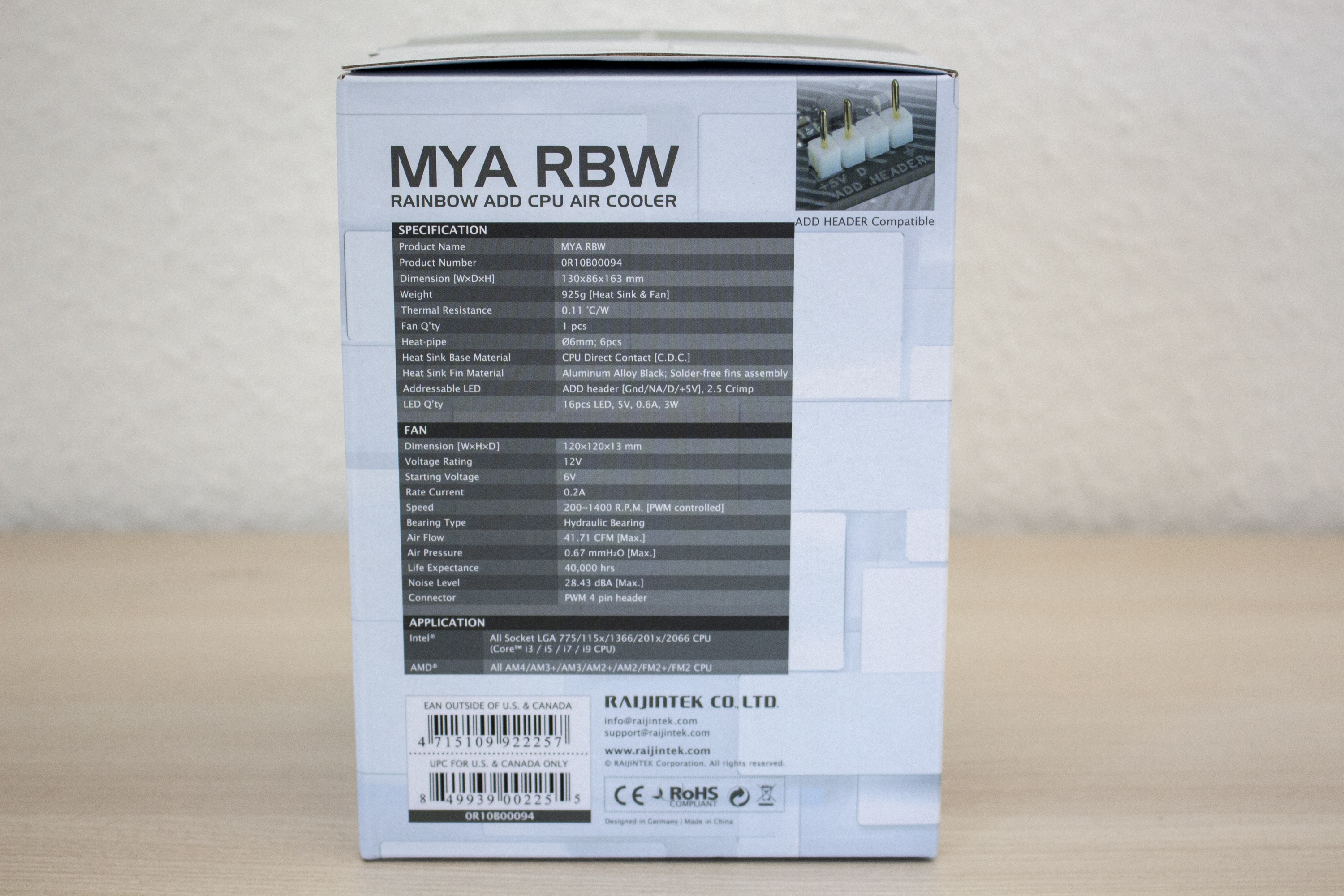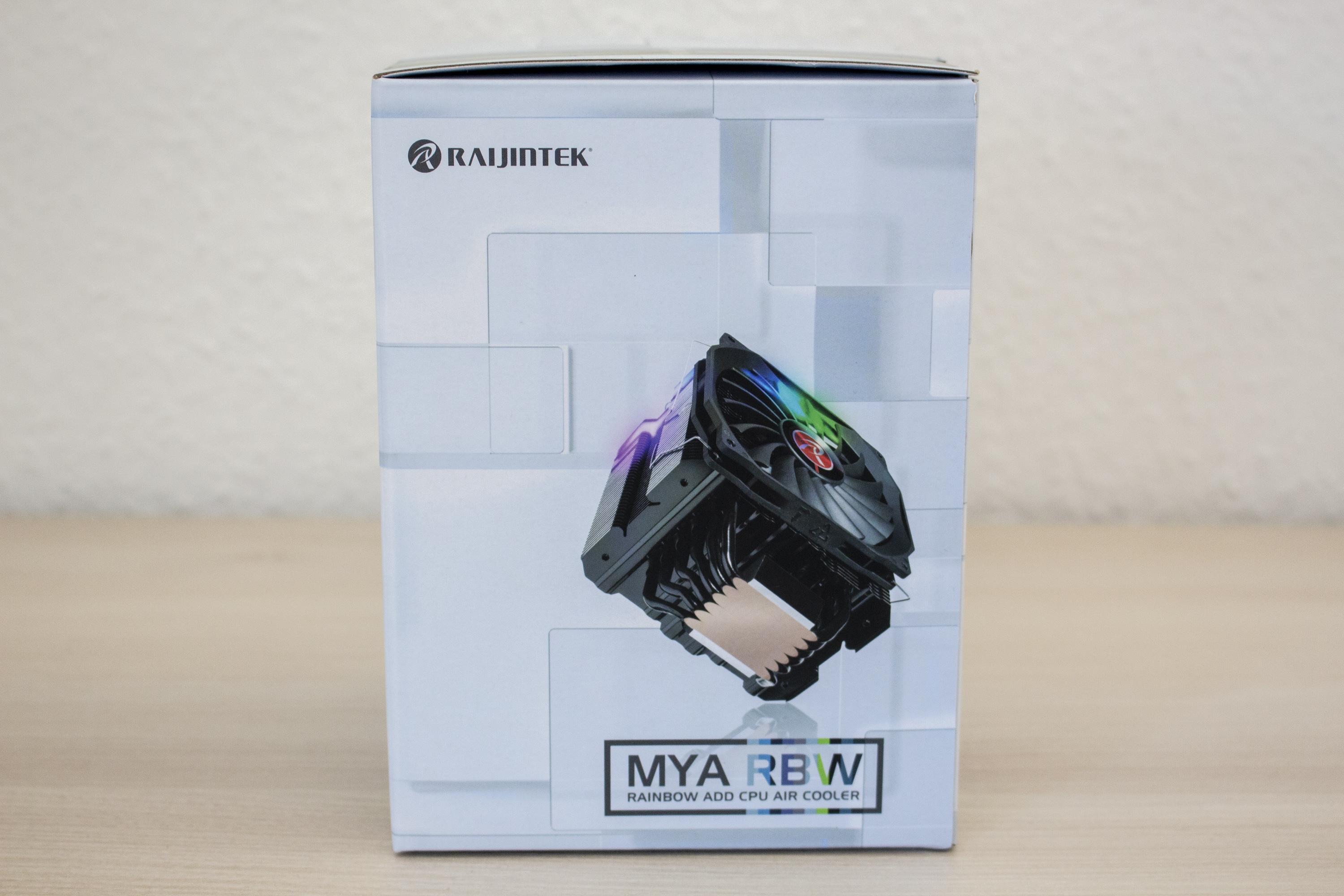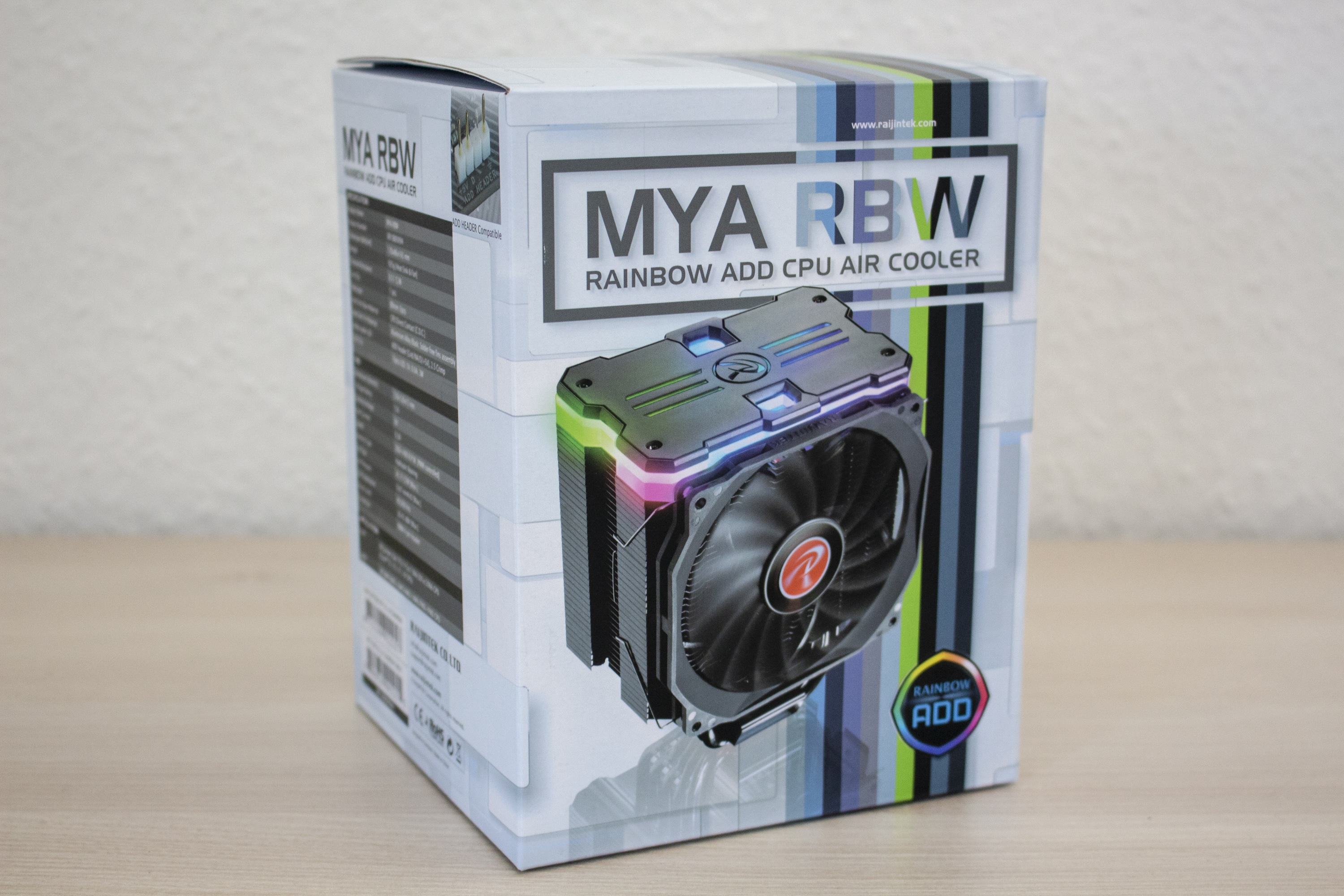Der MYA RBW kommt in einem verhältnismäßig kleinen Karton aus Pappe. Dieser ist bunt bedruckt und enthält jede Menge Informationen und Bilder über den Kühler und die mitgelieferten Lüfter. Diese Informationen sind nur in englischer Sprache verfasst.