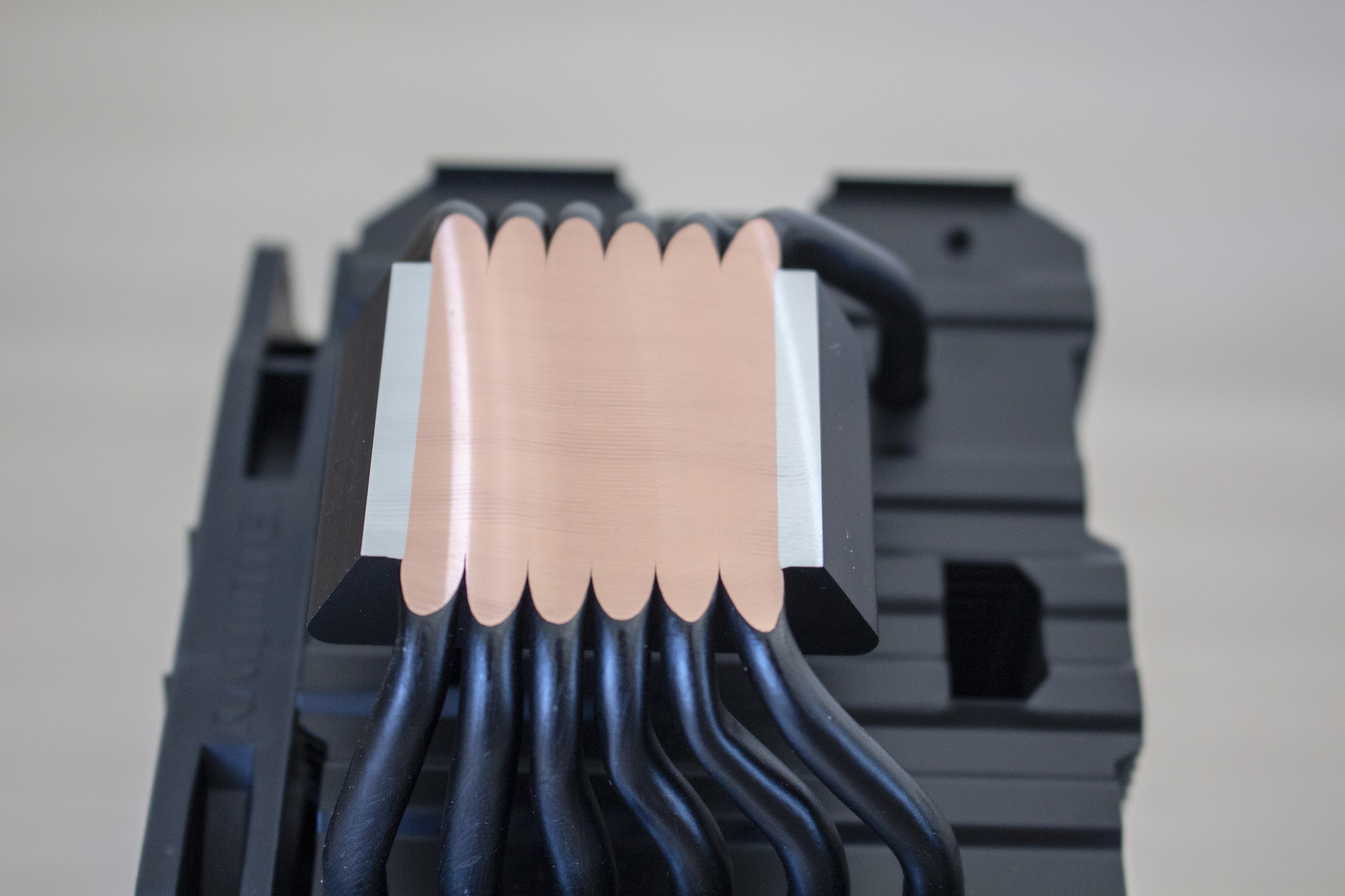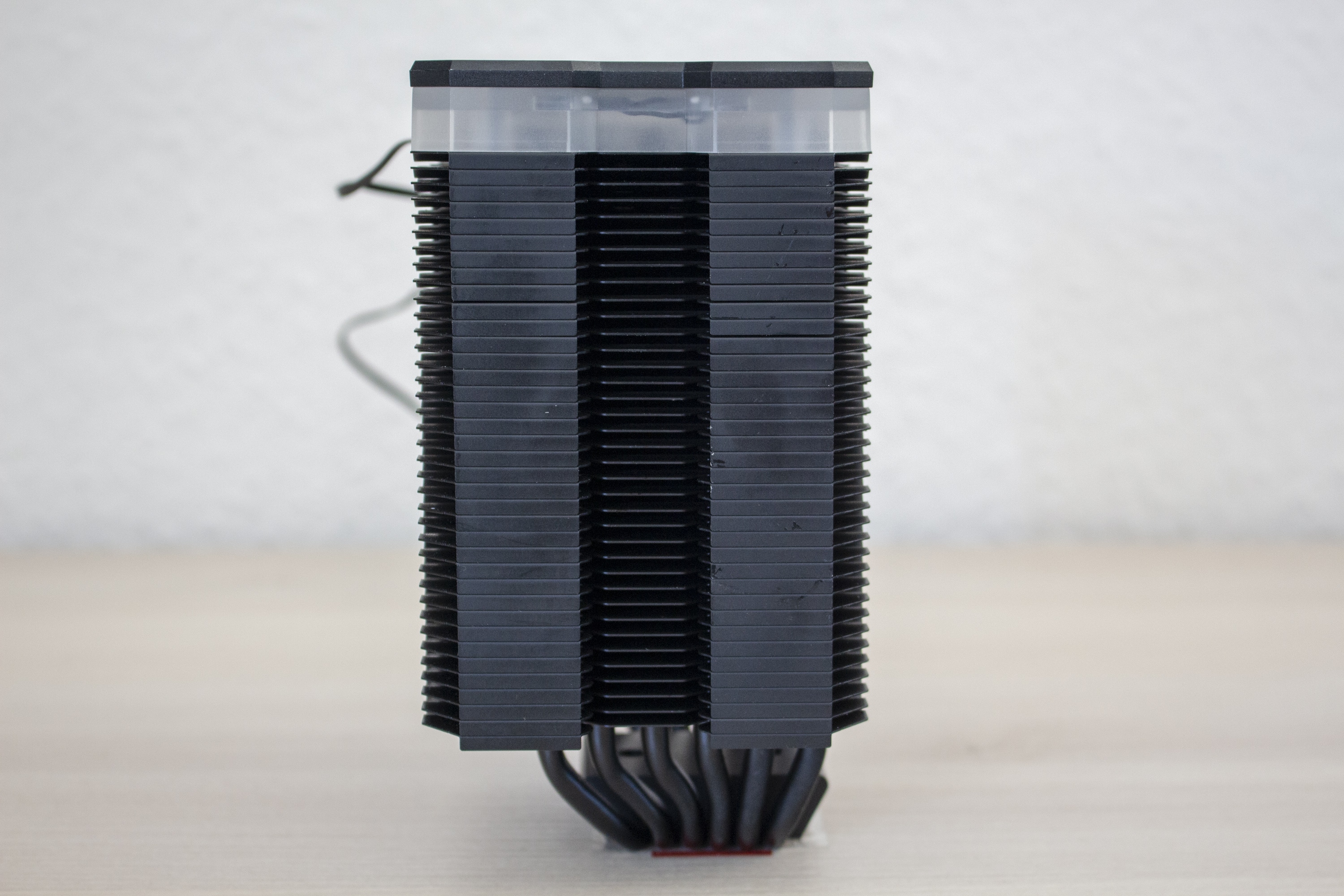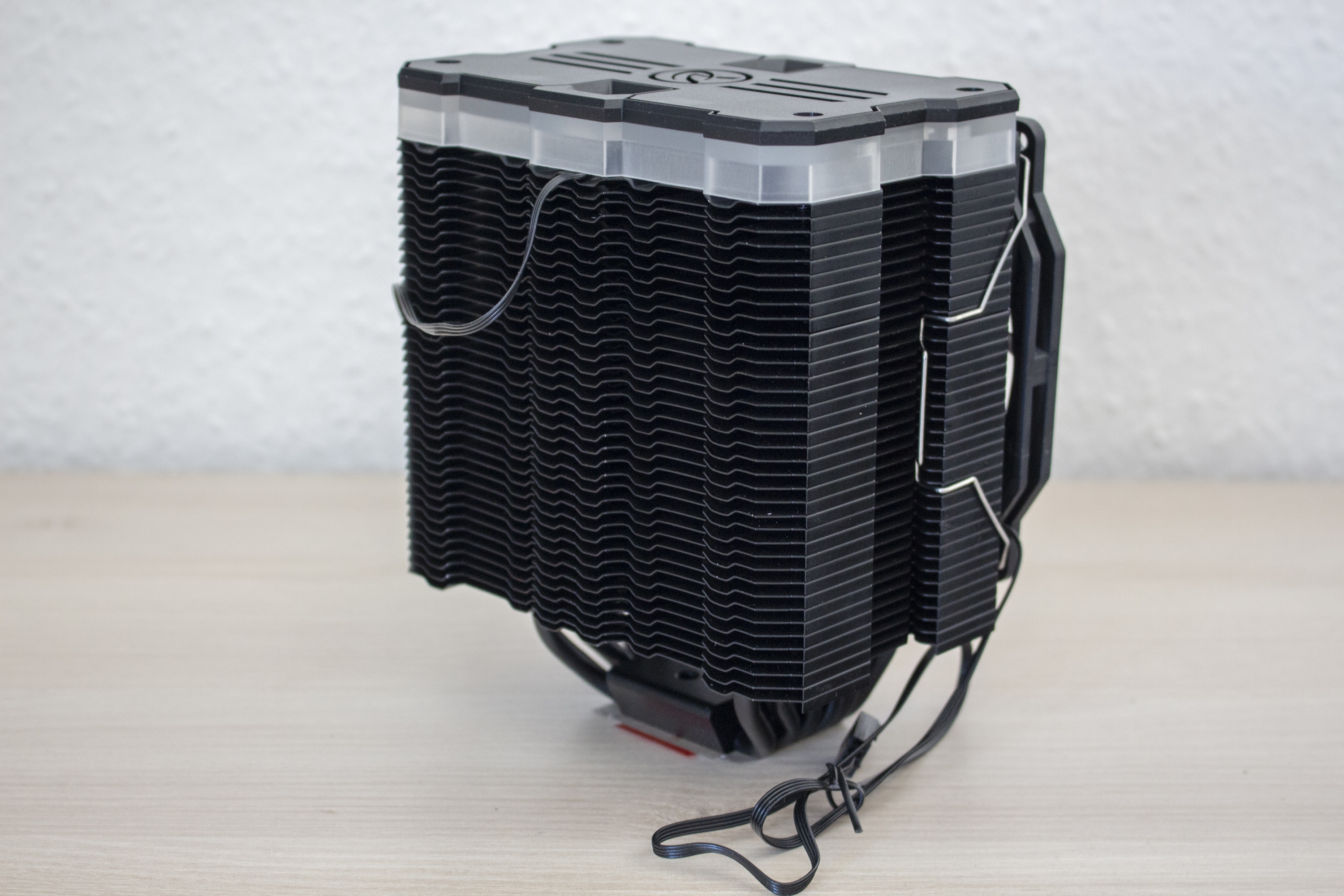 Optisch wirkt der Kühler durch die schwarz eloxierten Aluminium-Finnen und Heatpipes sehr schick. Der Kühlkörper besteht insgesamt aus 37 Aluminium-Lamellen und sechs 6-Millimeter Heatpipes aus Kupfer. Im Vergleich zu anderen Herstellern setzt Raijintek nicht auf eine vernickelte Bodenplatte sondern auf das Direct-Touch-Verfahren. Dazu wurden die Heatpipes plan geschliffen und liegen direkt auf dem Heatspreader der CPU auf. Insgesamt ist der Kühlkörper groß, wirkt aber nicht zu wuchtig. Außerdem ist der Kühlkörper asymmetrisch aufgebaut um die Kompatibilität zu höheren RAM-Modulen gewährleisten zu können.