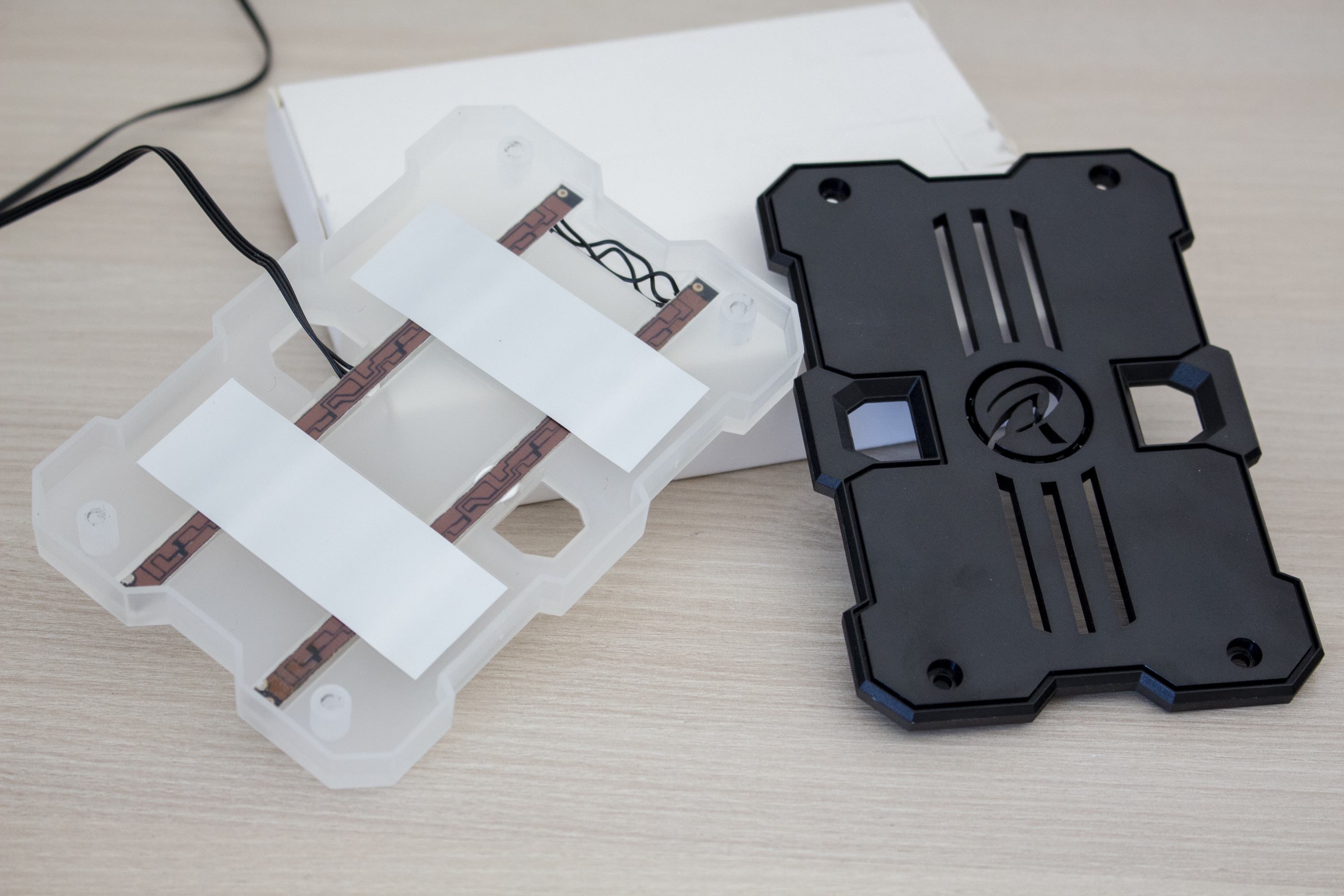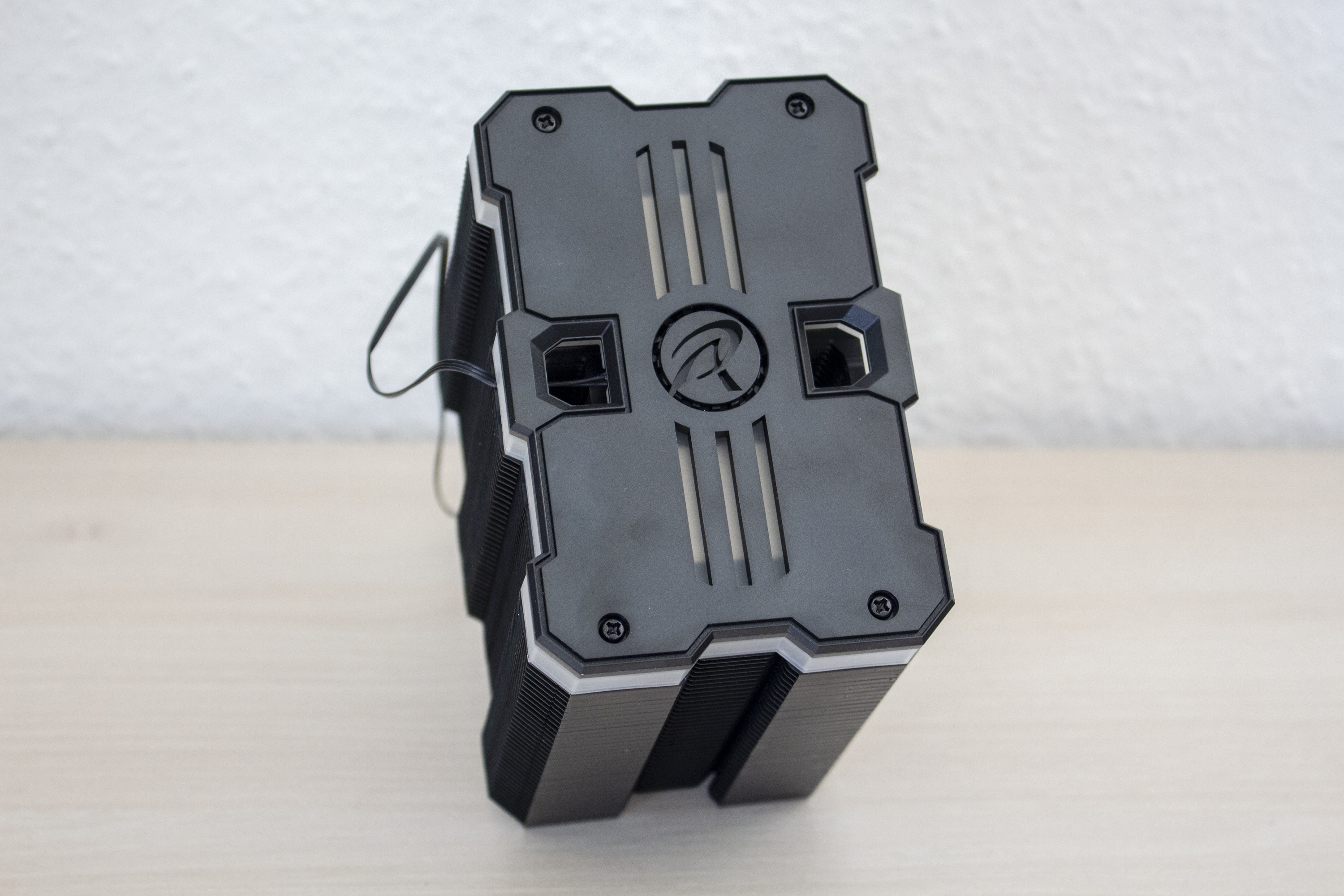 Um die RGB-Beleuchtung zu realisieren, hat der Hersteller auf dem Kühler einen Deckel aus Kunststoff mit vier Schrauben befestigt. Schraubt man dieses Element ab, unterteilt sich dieses in eine schwarze Platte mit dem Raijintek-Logo und ein etwas dickeres, leicht transparentes Element. Dieses beherbergt zwei RGB-LED-Streifen die über einen 5V-RGB-Anschluss mit dem Mainboard verbunden werden können.