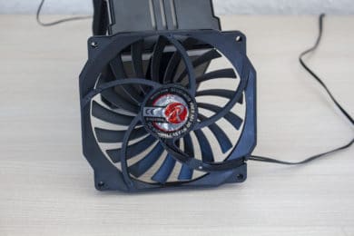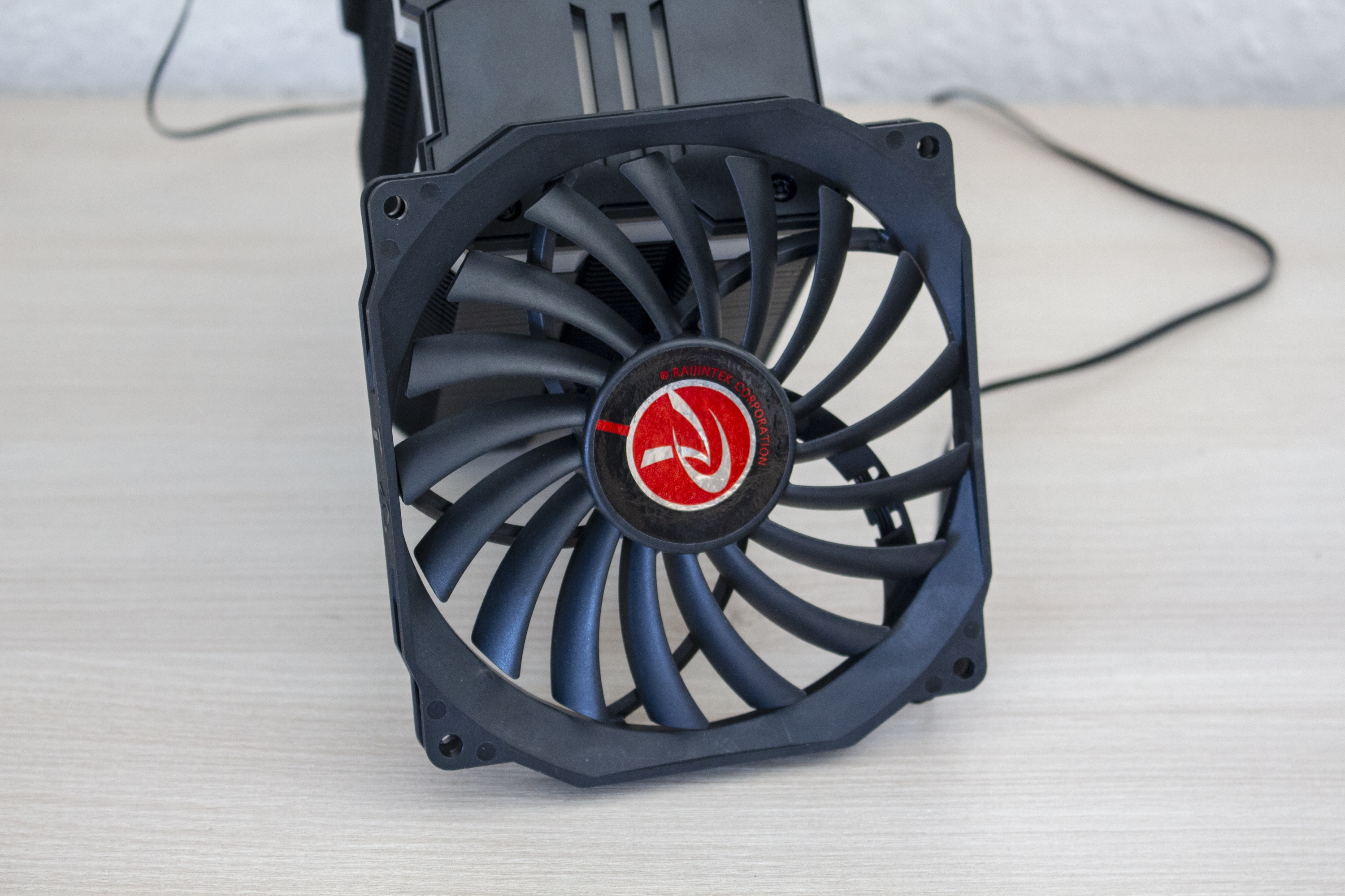 Der mitgelieferte Lüfter ist vom Typ Raijintek BDM12013S und ist inklusive 4-pin PWM-Kabel komplett schwarz gehalten. Er dreht mit maximal 1400 Umdrehungen pro Minute und ist ein Slim-Lüfter mit einer Dicke von lediglich 13 Millimetern. Auch dadurch möchte Raijintek die RAM-Kompatibilität des MYA RBW verbessern.