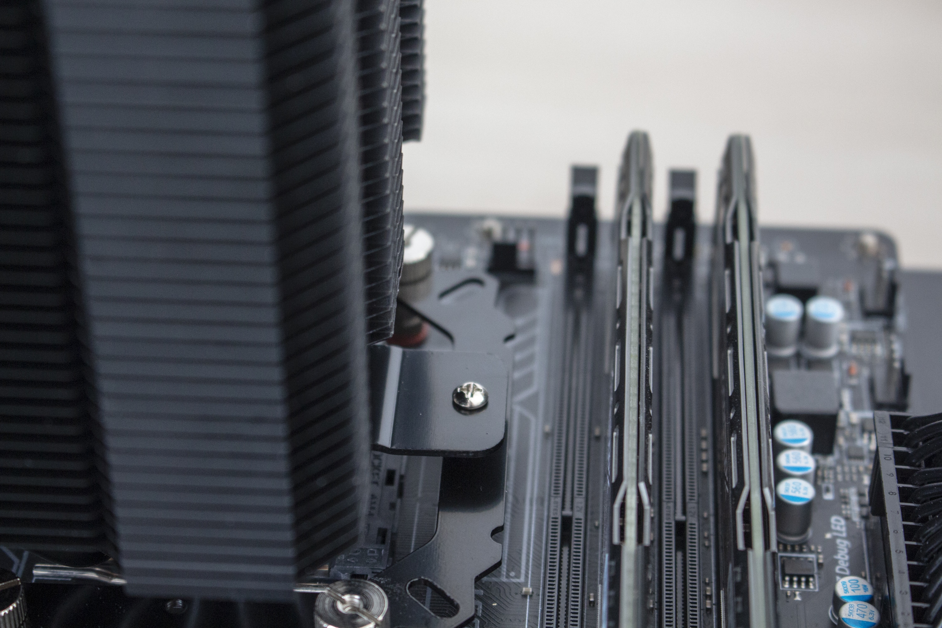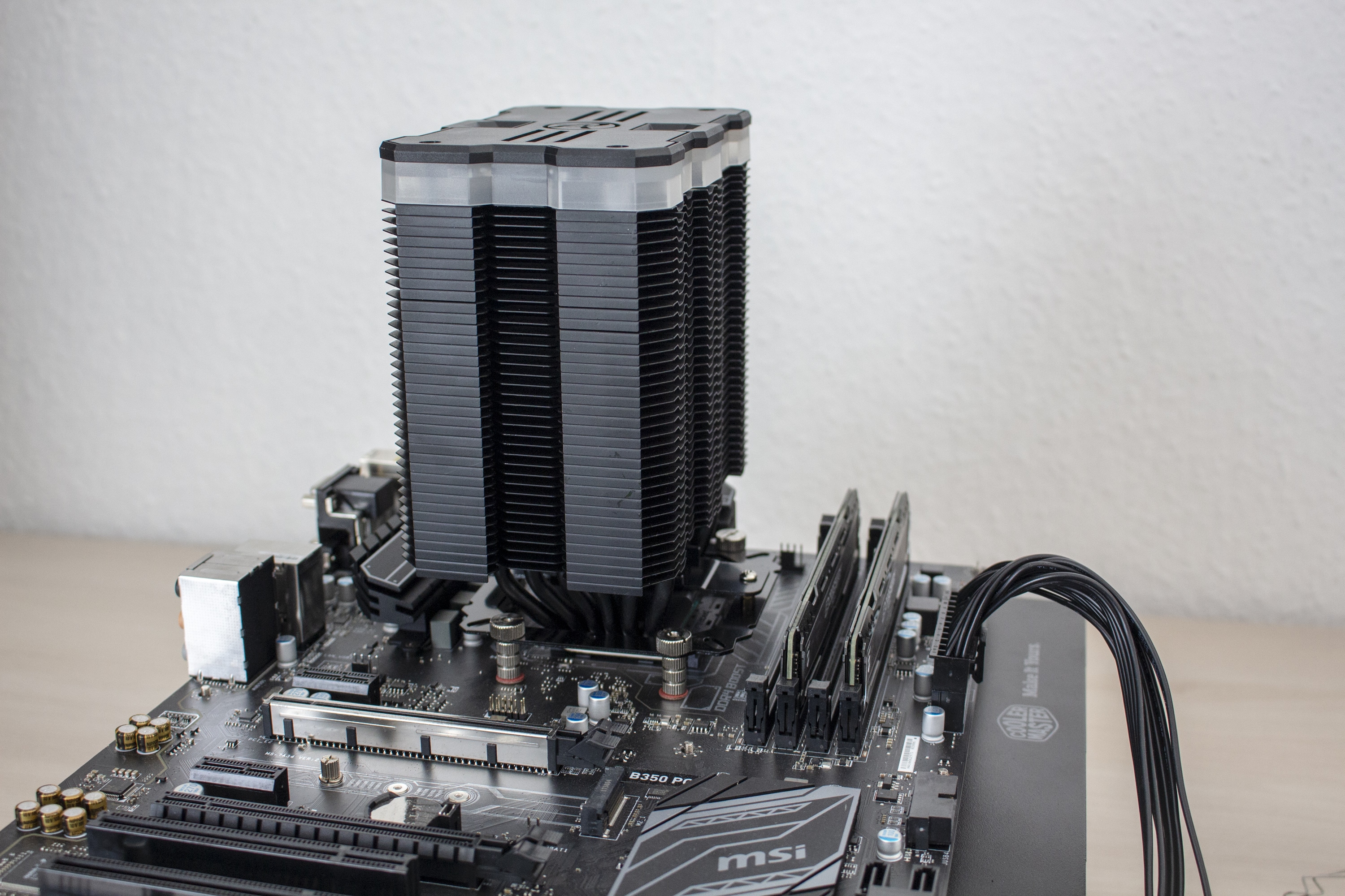 Wo der MYA RBW keine Probleme haben dürfte, wäre bei Arbeitspeicherriegeln mit hohen Heatspreadern. Durch die asymmetrische Bauweise und den schmalen Lüfter dürfte es zumindest auf Mainboards mit vier Speicherbänken auf der rechten Seite zu keinen Kompatibilitätsproblemen kommen.