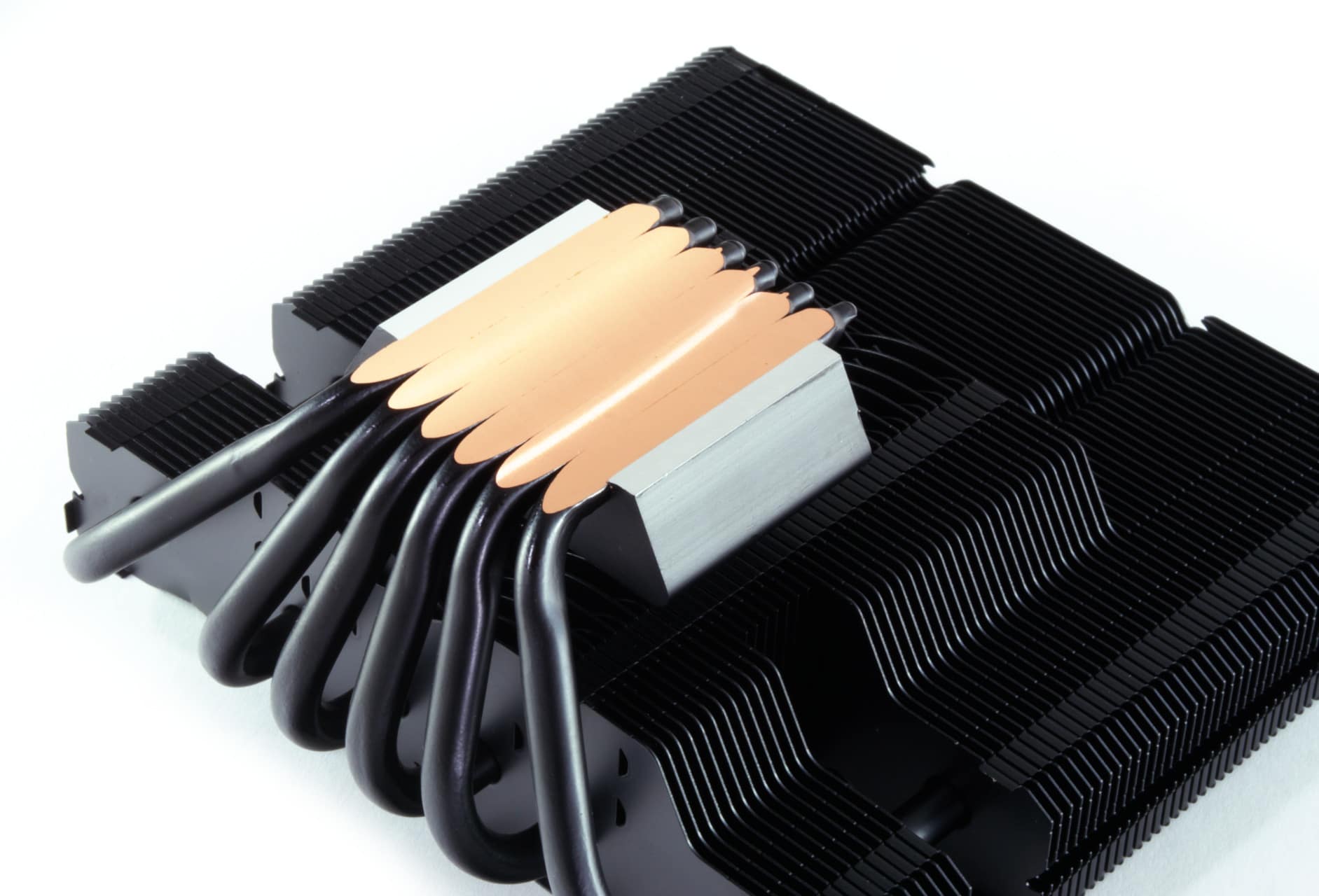Die Bodenplatte wiederum ist in der Heatpipe-Direct-Touch-Bauweise ausgeführt, die Heatpipes liegen also direkt auf der CPU auf. Trotzdem ist die Fläche absolut flach, Lücken zwischen den einzelnen Heatpipes gibt es nicht.