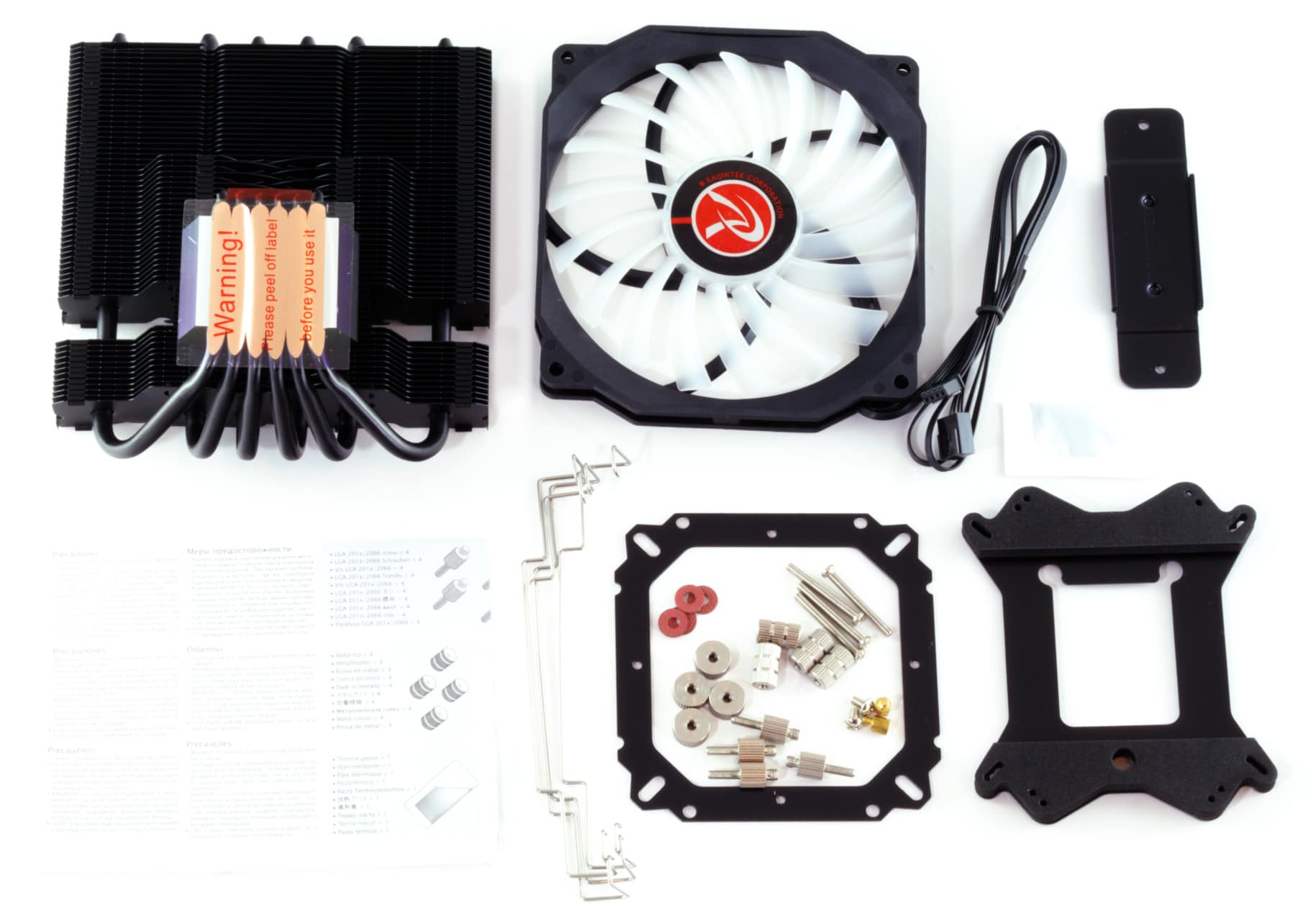 Der Raijintek Pallas 120 RGB wird in einem farbig bedruckten Pappkarton geliefert. Im Inneren desselben befindet sich der Kühler mitsamt dem Lüfter sowie dem Montagematerial für alle gängigen Sockel von Intel und AMD, ausgenommen TR4.
