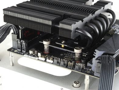Zudem gibt es ein weiteres Problem, das aber nicht der Montage, sondern den Ausmaßen des Kühlers geschuldet ist: Auf unserem Mainboard überragt er in jeder möglichen Ausrichtung den Rand der ITX-Platine. Dadurch kann er in besonders kleinen ITX-Gehäusen nicht untergebracht werden. Besteht allerdings etwas Platz in eine Richtung, beispielsweise weil sich dort Öffnungen für Kabel befinden, so sollte die Montage möglich sein.