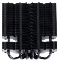 Nahezu konkurrenzlos macht den Kühler die besondere Farbgebung: Der schwarze Radiator ist zweifellos ein echter Hingucker, die gute Verarbeitungsqualität tut da ihr übriges. Leicht getrübt wird das Bild lediglich vom verwendeten Lüfter: Die verbauten LEDs schaffen es nicht, den gesamten Rotor zu beleuchten, und das Lagerschleifen bei niedrigen Drehzahlen hätte vermieden werden können.
