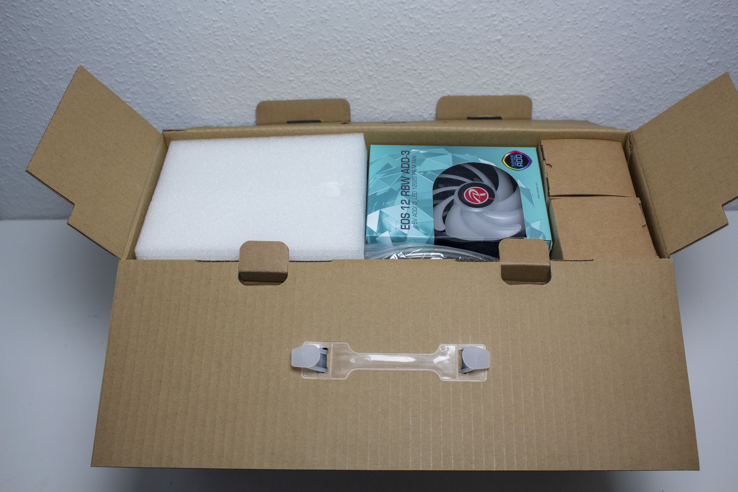 Verpackt wird das komplette Set von Raijintek in einem schlichten braunen Karton mit Tragegriff. Um zu verdeutlichen welche Komponenten sich innerhalb der Verpackung befinden, hat der Hersteller die Vorderseite mit einem farbigen Aufkleber versehen. Dieser gibt bereits eine erste Übersicht über den Inhalt der Box. Auf zusätzliche technische Informationen zum Set hat Raijintek auf der Box verzichtet. Öffnet man die obere Lasche, wird man direkt von mehreren Styropormatten begrüßt, die den Freiraum füllen sollen. Darunter lassen sich alle restlichen Komponenten entdecken. Mitgeliefert werden bei diesem Set: