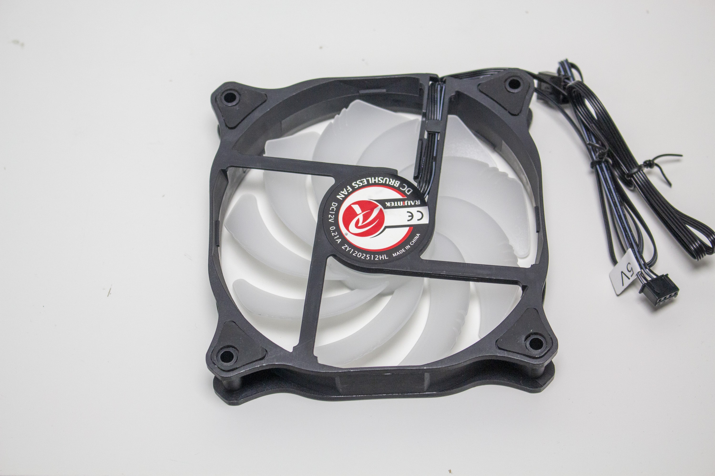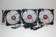 Da der Radiator Platz für drei 120-Millimeter-Lüfter hat, liegen diese dem Komplettset natürlich auch entsprechend viele Lüfter bei. Ebenfalls separat verpackt verfügen die EOS 12 RBW ADD jeweils über einen 4-Pin-PWM-Stecker und einen, vermeintlich proprietären, 3-Pin-5V-ARGB-Header. Die Beförderung der Luft erfolgt durch einen Rotor mit neun milchig-weißen Lüfterblättern, die von einem schwarzen Rahmen eingefasst sind. Dem Lüfterpaket liegen außerdem 12 Montageschrauben, eine RGB- und PWM-Steuerplatine sowie eine passenden Fernbedienung bei. Alternativ kann die Steuerplatine per 4-Pin-PWM und 3-Pin-5V-ARGB-Stecker direkt mit dem Mainboard verbunden werden.