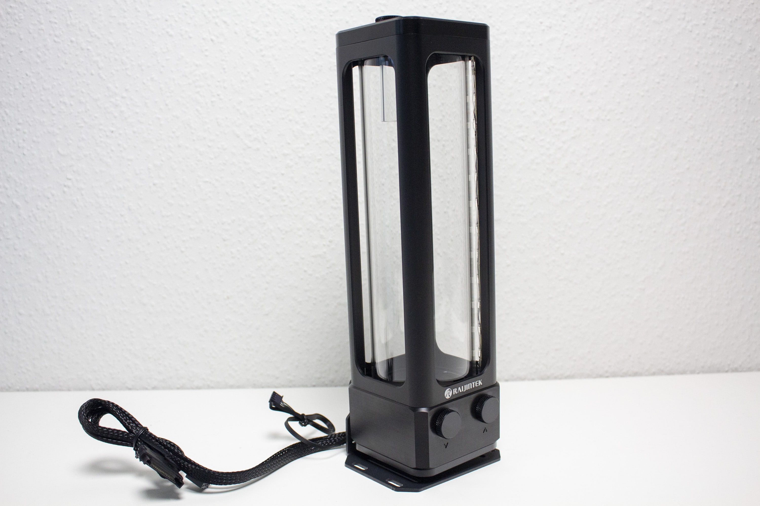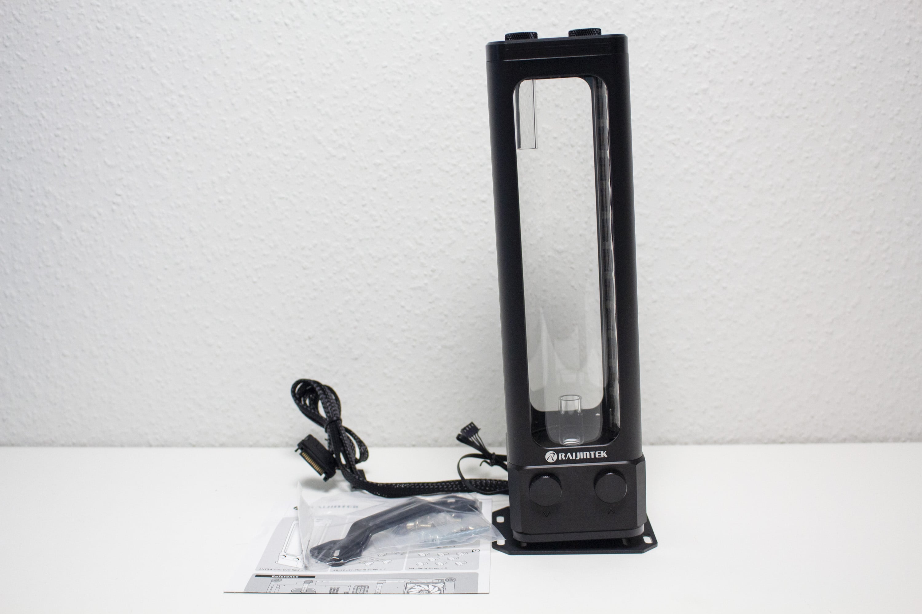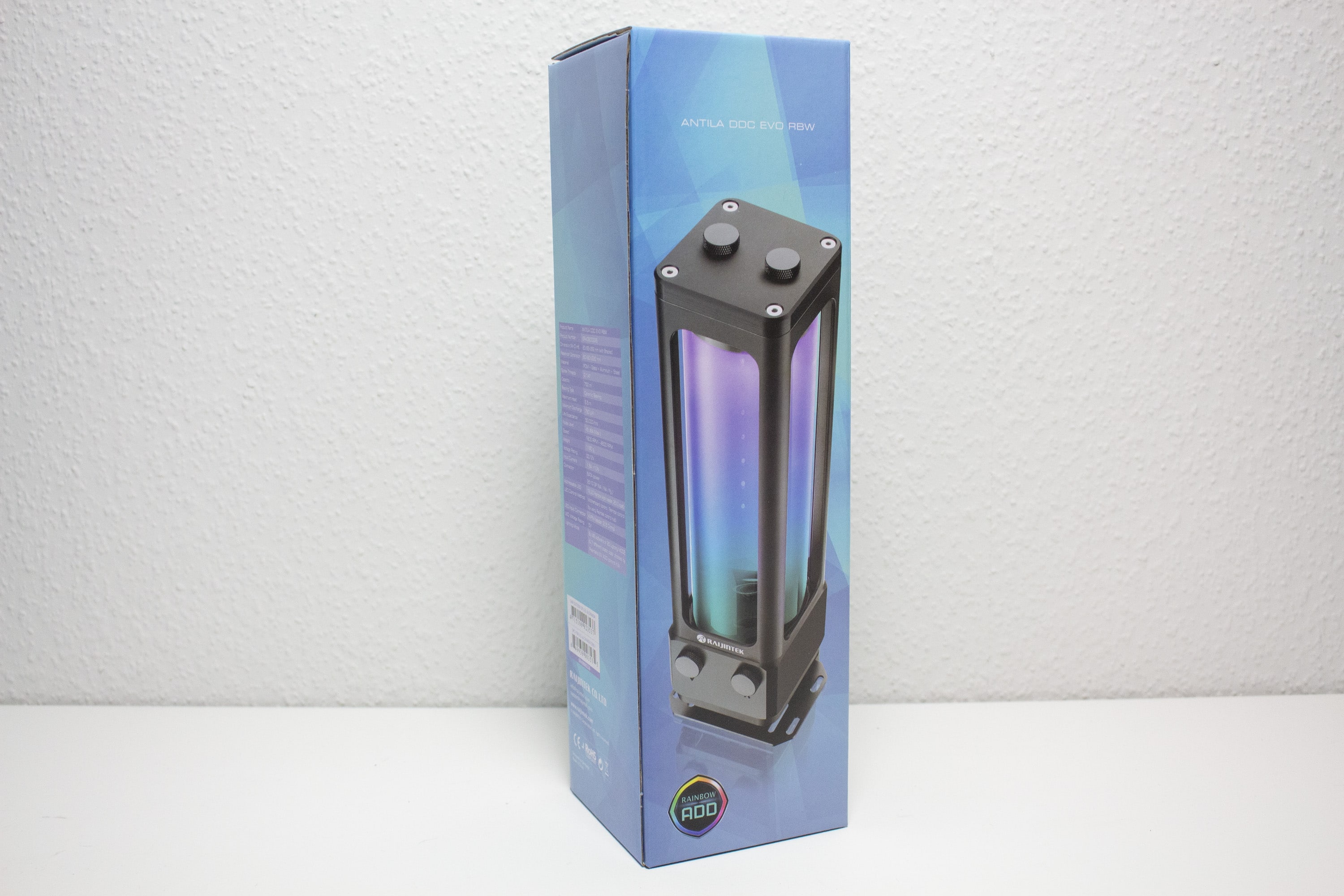 Neben dem Radiator verbraucht der Ausgleichbehälter (AGB) mit eingebauter Pumpe am meisten Platz im Karton. Die AGB-Pumpenkombination trägt den Namen ANTILA DDC EVO RBW und hat eine Gesamthöhe von circa 300 Millimetern. Das Gehäuse besteht überwiegend aus Aluminium und umfasst den Tank aus Glas. Gewisse POM-Kunststoff-Elemente im Deckel und beim Pumpengehäuse runden das Design sehr gut ab. Insgesamt verfügt die Einheit über vier G1/4-Zoll-Ports. Die DDC-Pumpe wurde unterhalb des Tanks platziert und verfügt über einen SATA-Strom-Anschluss und einem PWM-Stecker zum Auslesen der Drehzahl bzw. zur Ansteuerung über das Mainboard. Da der AGB zudem über eine RGB-Lichtleiste verfügt, lässt sich zudem ein drittes Kabel zum Anschluss am RGB-Controller oder dem Mainboard erkennen. Alle Kabel wurden schwarz gesleeved.