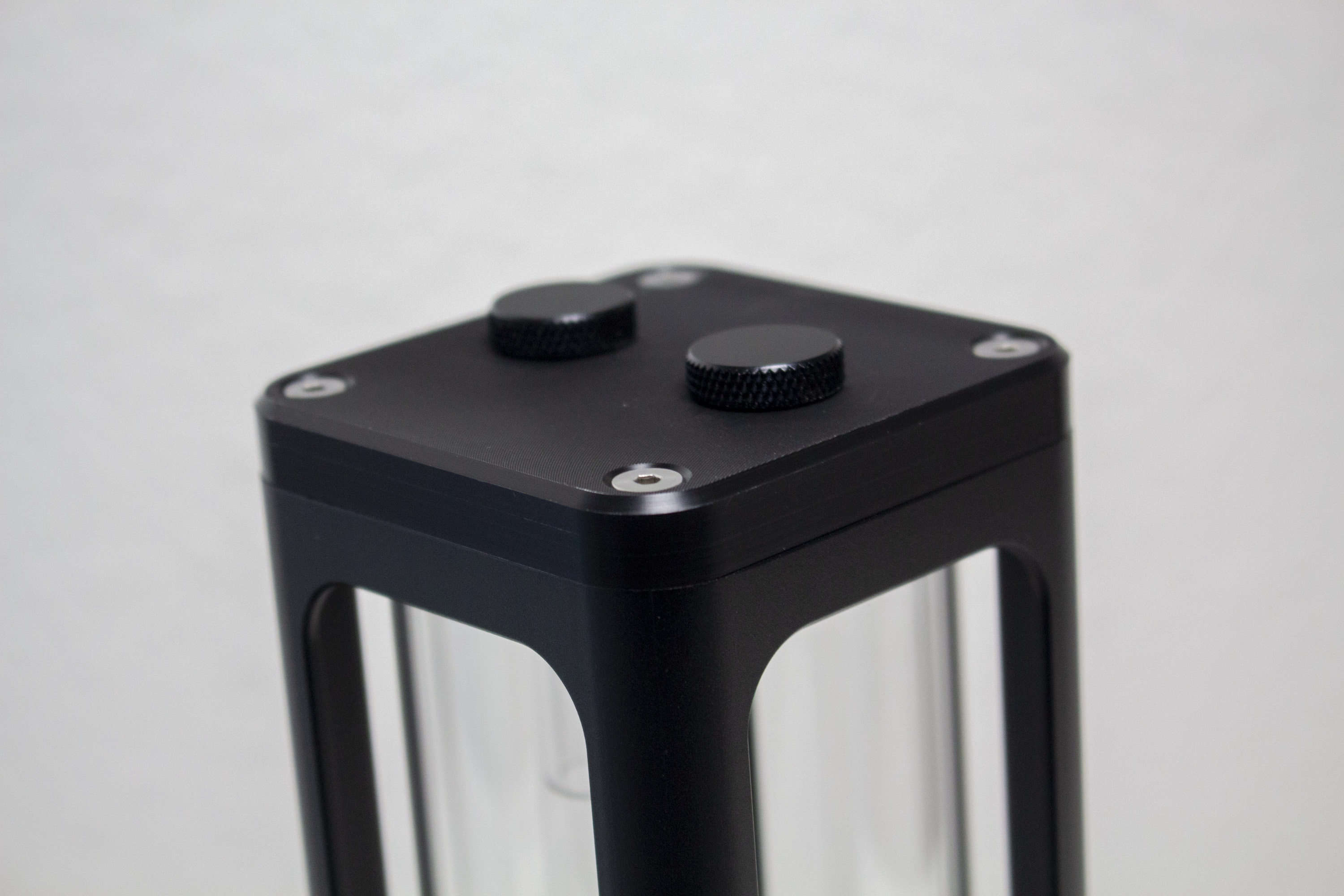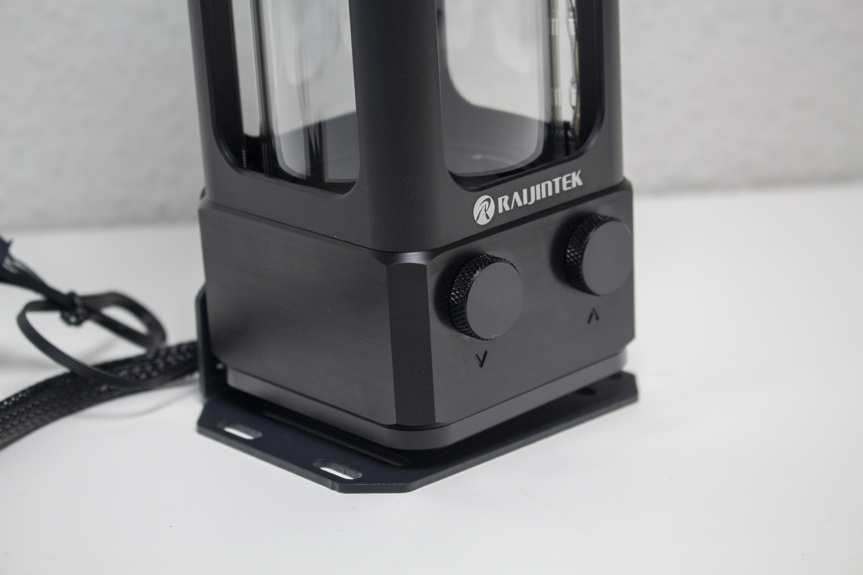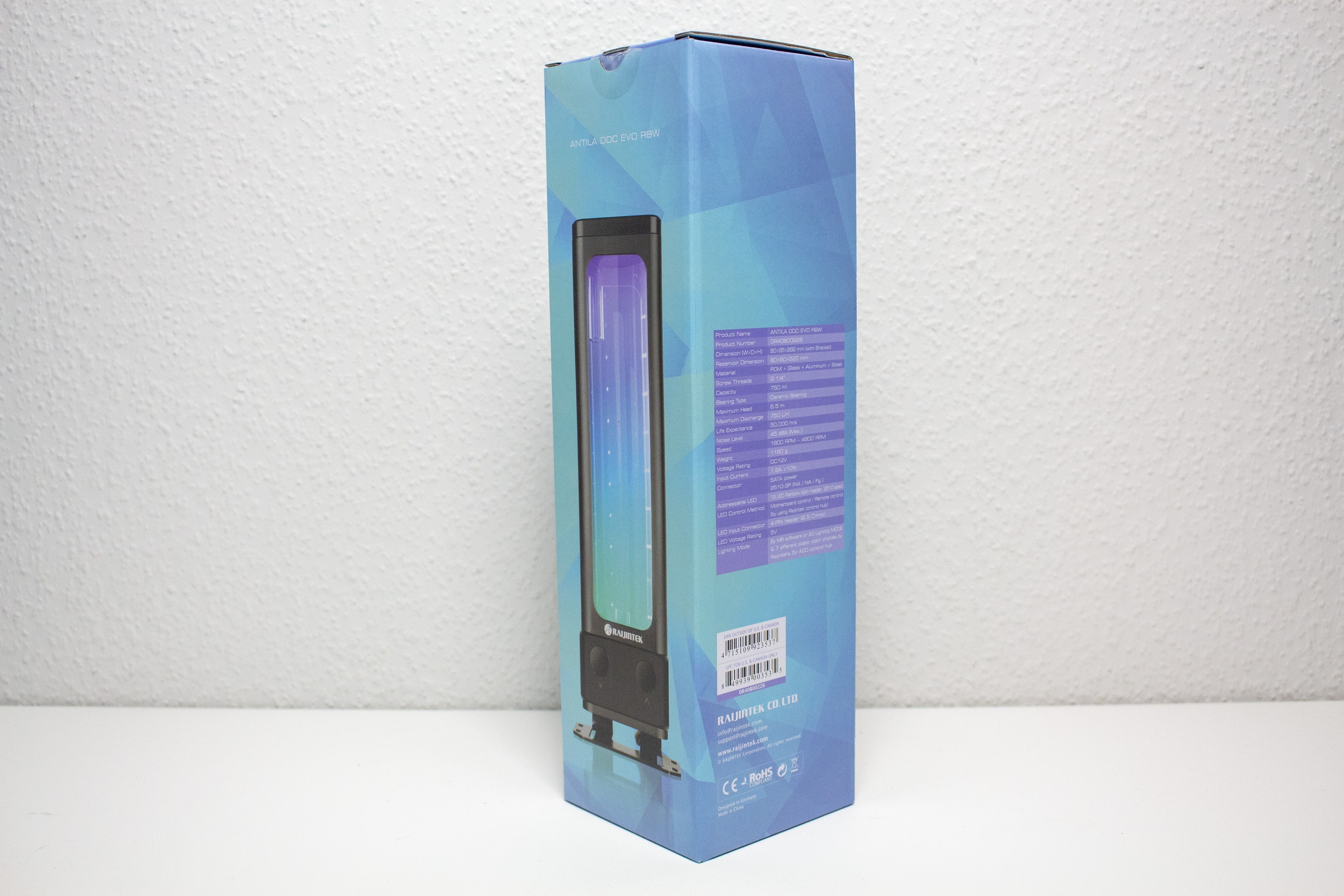 Neben dem Radiator verbraucht der Ausgleichbehälter (AGB) mit eingebauter Pumpe am meisten Platz im Karton. Die AGB-Pumpenkombination trägt den Namen ANTILA DDC EVO RBW und hat eine Gesamthöhe von circa 300 Millimetern. Das Gehäuse besteht überwiegend aus Aluminium und umfasst den Tank aus Glas. Gewisse POM-Kunststoff-Elemente im Deckel und beim Pumpengehäuse runden das Design sehr gut ab. Insgesamt verfügt die Einheit über vier G1/4-Zoll-Ports. Die DDC-Pumpe wurde unterhalb des Tanks platziert und verfügt über einen SATA-Strom-Anschluss und einem PWM-Stecker zum Auslesen der Drehzahl bzw. zur Ansteuerung über das Mainboard. Da der AGB zudem über eine RGB-Lichtleiste verfügt, lässt sich zudem ein drittes Kabel zum Anschluss am RGB-Controller oder dem Mainboard erkennen. Alle Kabel wurden schwarz gesleeved.