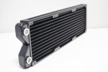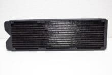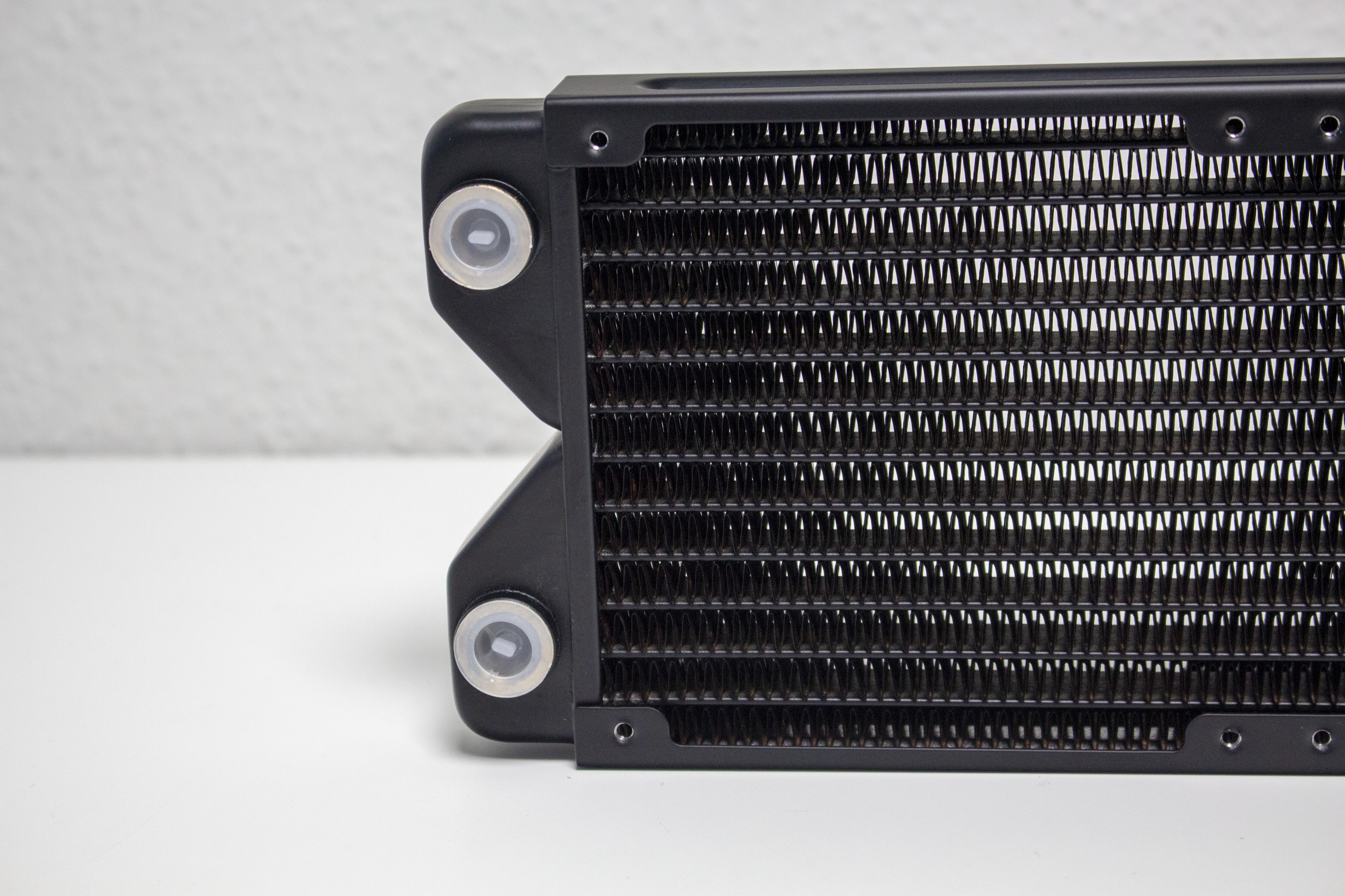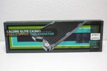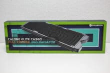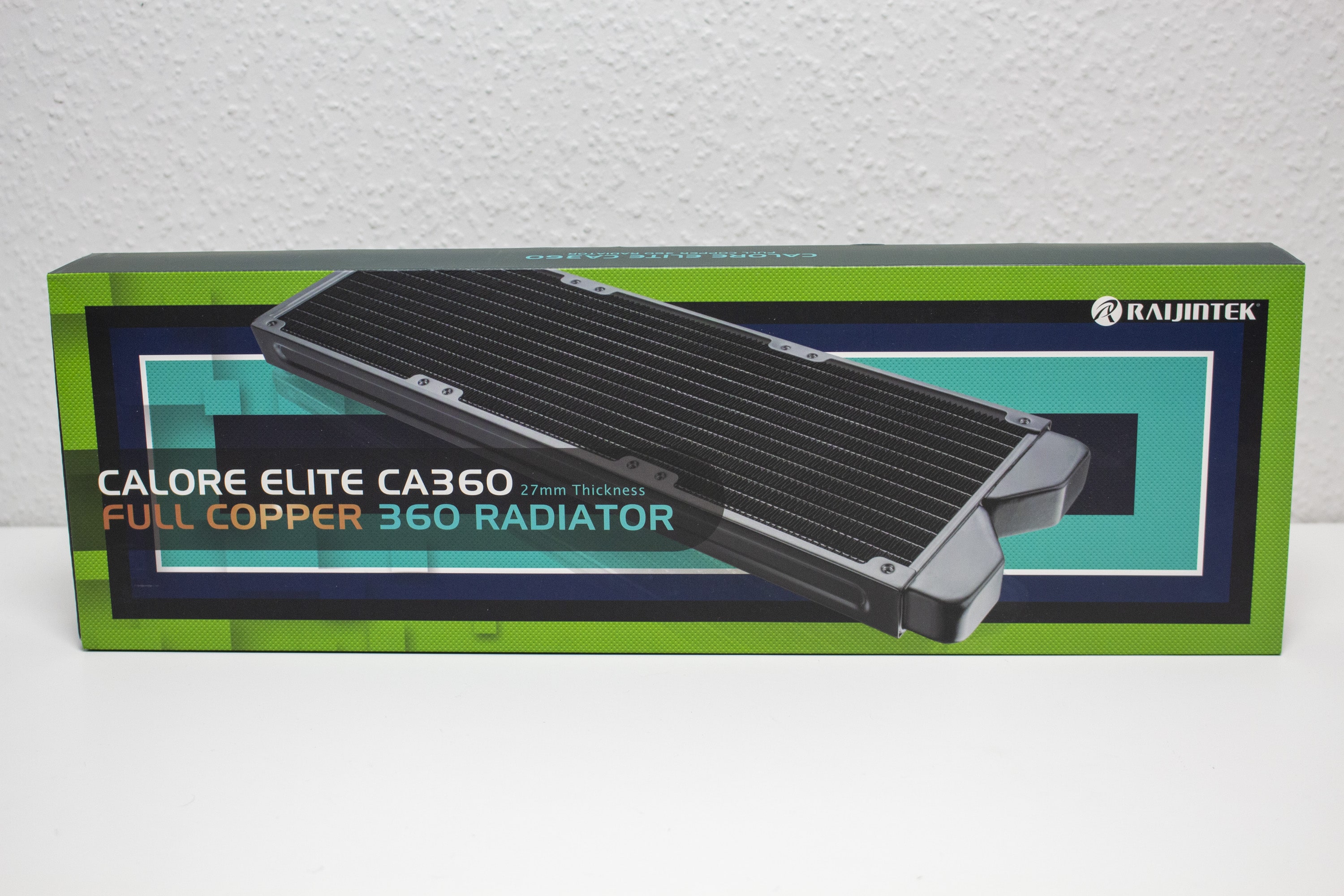 Der Radiator trägt den Namen Calore Elite CA360 und kommt aus dem Hause Raijintek. Verpackt in einem farbig bedruckten Karton und umwickelt mir Luftpolsterfolie, bietet der Calore Elite Platz für drei 120-Millimeter-Lüfter. Der Radiator ist komplett aus Kupfer gefertigt und schwarz lackiert worden. Zum Zubehör gehören außerdem drei Gummiringe zur Entkopplung der Lüfter und alle notwendigen Montageschrauben.