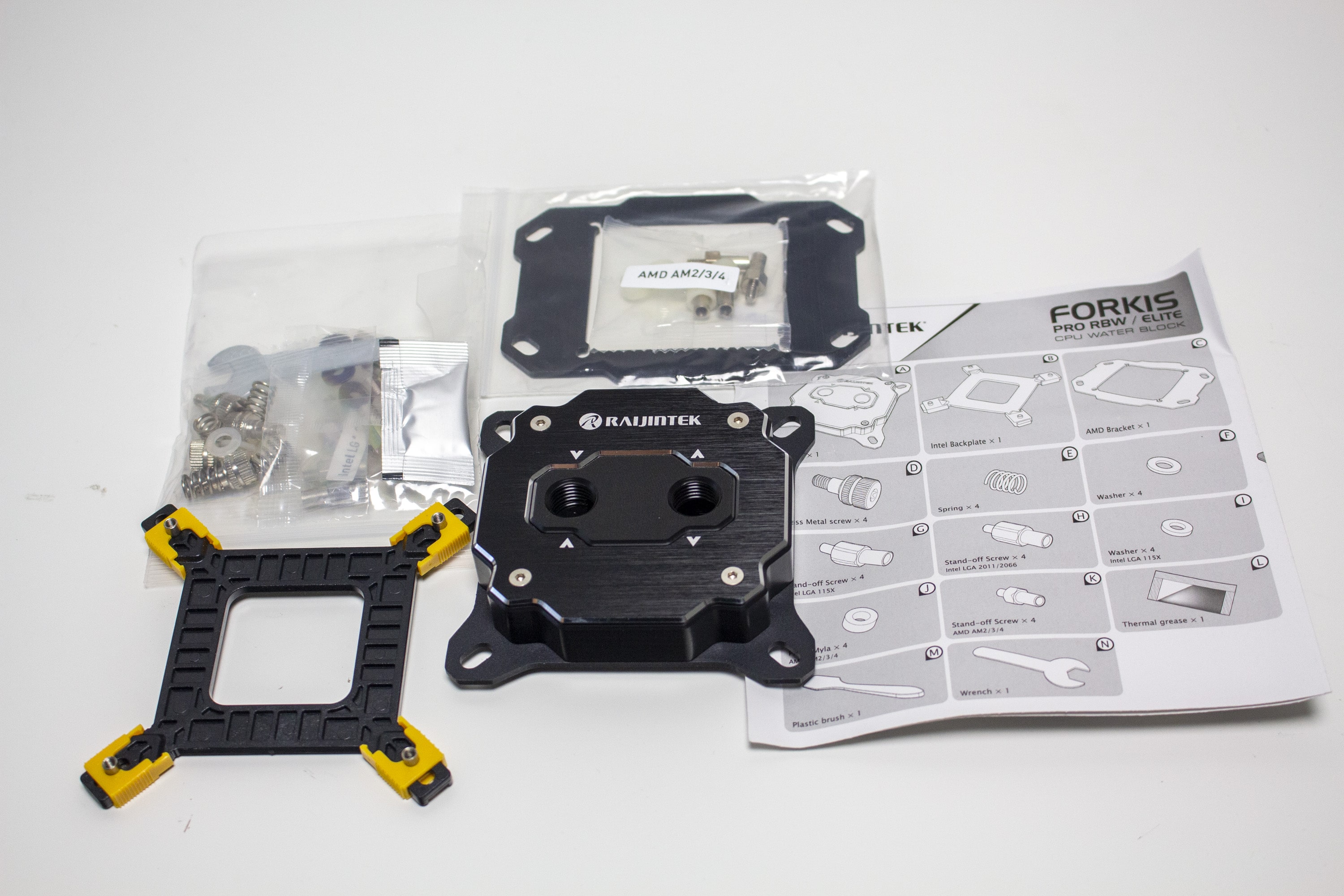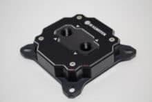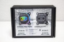 Der Kühlblock FORKIS ELITE kommt ebenfalls separat verpackt in einer schwarzen Schachtel, die für beide Varianten (mit und ohne RGB) verwendet wird. Außerdem finden sich im Karton eine Montageanleitung, alle notwendigen Schrauben und Abstandshalter sowie eine Backplate für Intel-Systeme und eine zweite Montageplatte für AMD-Systeme. Optisch ist der FORKIS ELITE eher zurückhaltend gestaltet und es wurde komplett auf RGB-Effekte verzichtet. Der CPU-Block besteht aus Aluminium (Deckel), vernickeltem Kupfer (Kühlerboden), Kunststoff und Stahl (Montagerahmen). Der Montagerahmen ist über vier Schrauben mit dem Boden des Kühlblocks befestigt und kann entfernt werden.