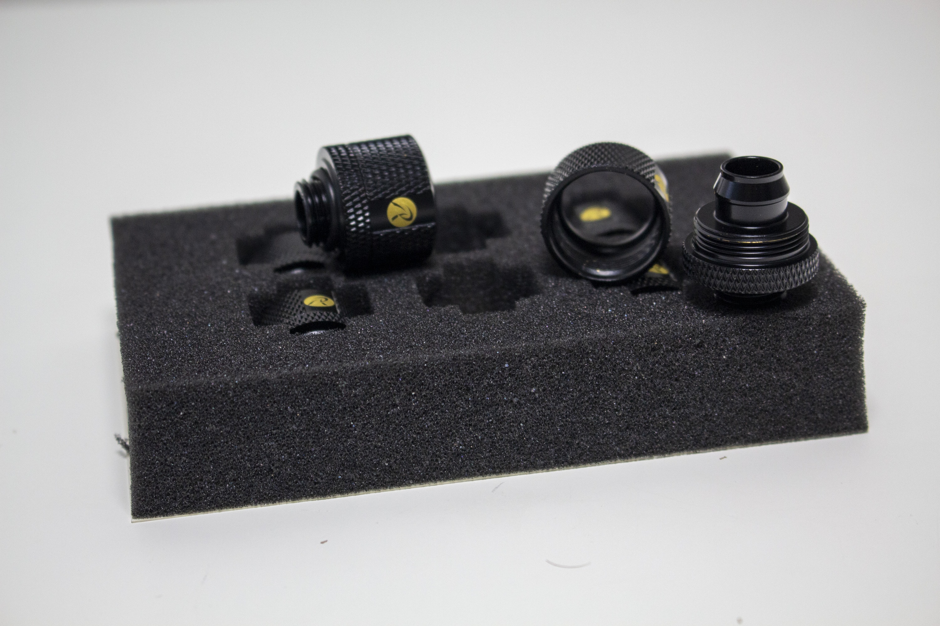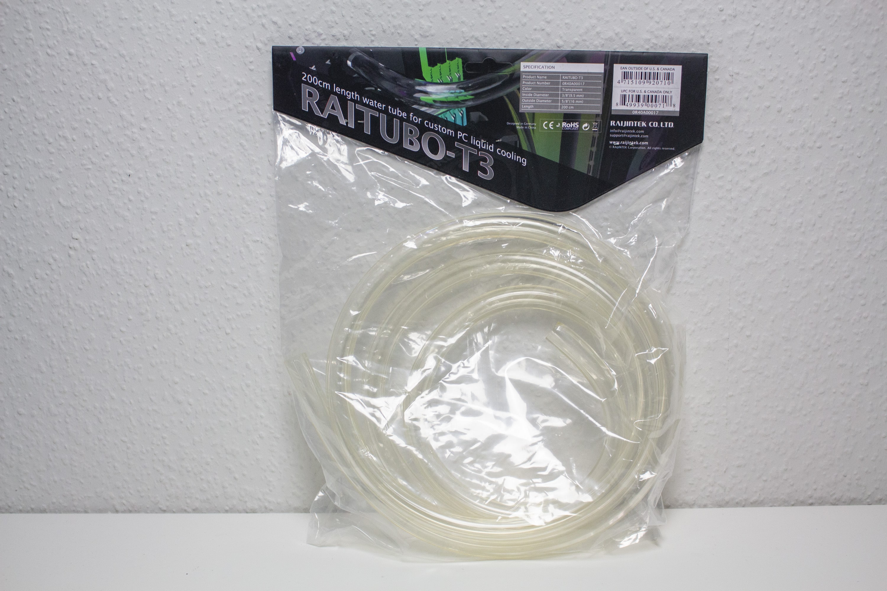 Zuletzt dürfen natürlich auch die Komponenten für Verschlauchung und Befüllung nicht fehlen. Beigelegt hat Raijintek dem Set einen zwei Metern langen PVC-Schlauch (RAITUBO-T3) mit einem Innendurchmesser von 10 und Außendurchmesser von 13 Millimetern. Zusätzlich gibt es sechs passende Softtube-Fittinge (PELIAS D141806) zur Verbindung mit dem CPU-Block, dem Radiator und dem Ausgleichsbehälter. Befüllt wird das ganze Set dann mit einem Liter Kühlflüssigkeit, die Raijintek unter dem Produktnamen RAIAQUA-T1 anbietet.