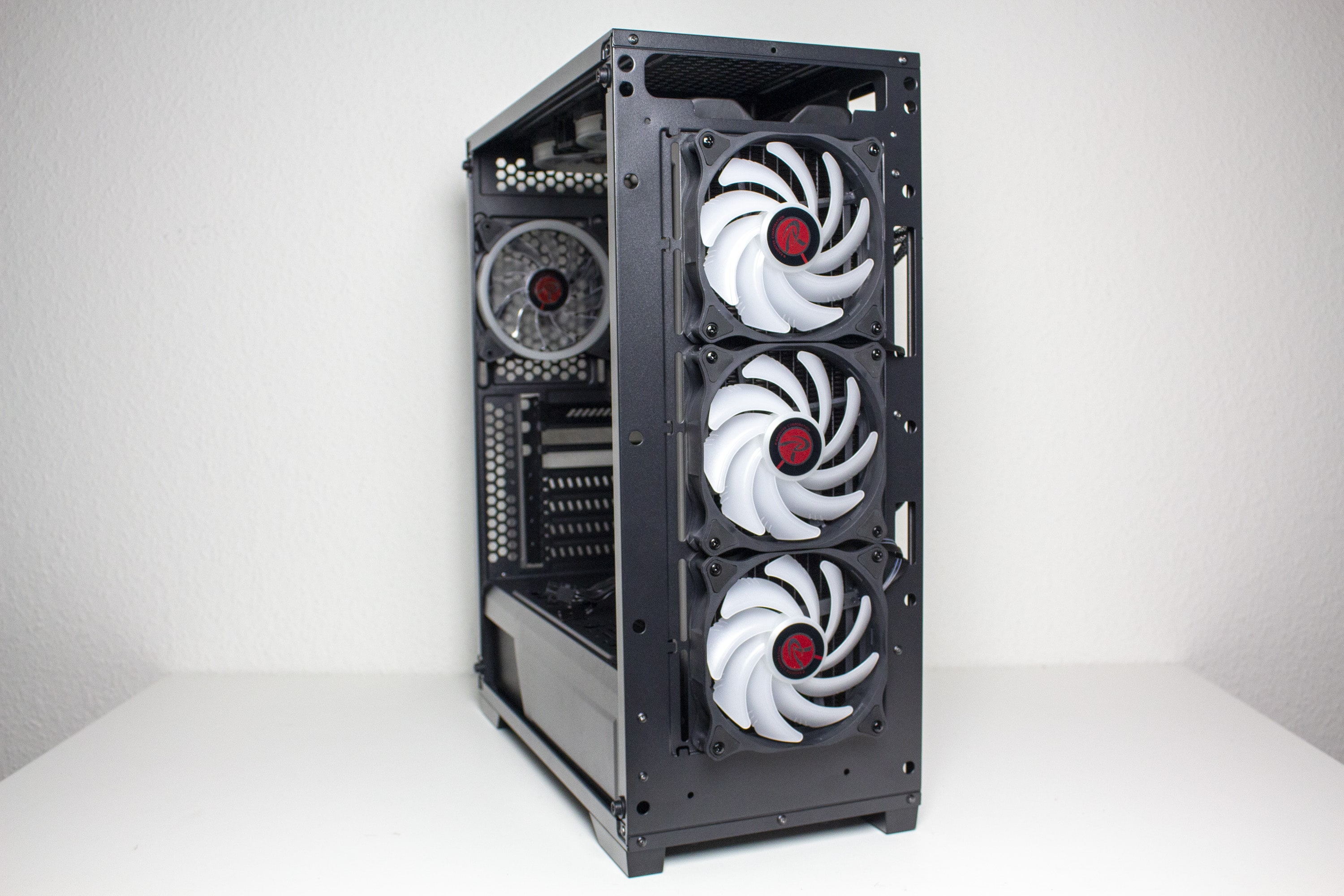Als letzte Komponenten montieren wir den 360er-Radiator und die drei RGB-Lüfter. Dazu wird der Radiator im Innenraum platziert und die Lüfter außerhalb des Chassis. Mit Hilfe der langen Schrauben werden diese dann mit dem Radiator verbunden.