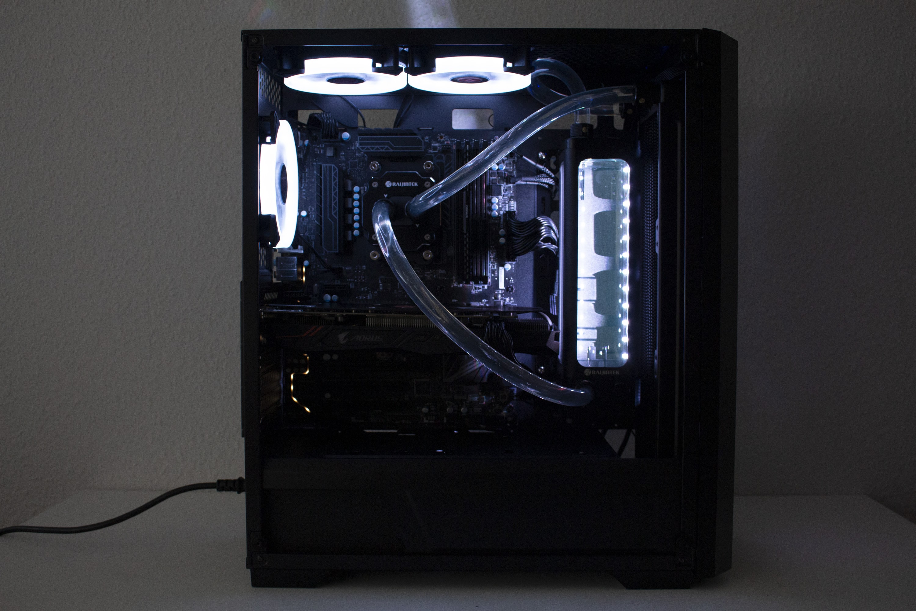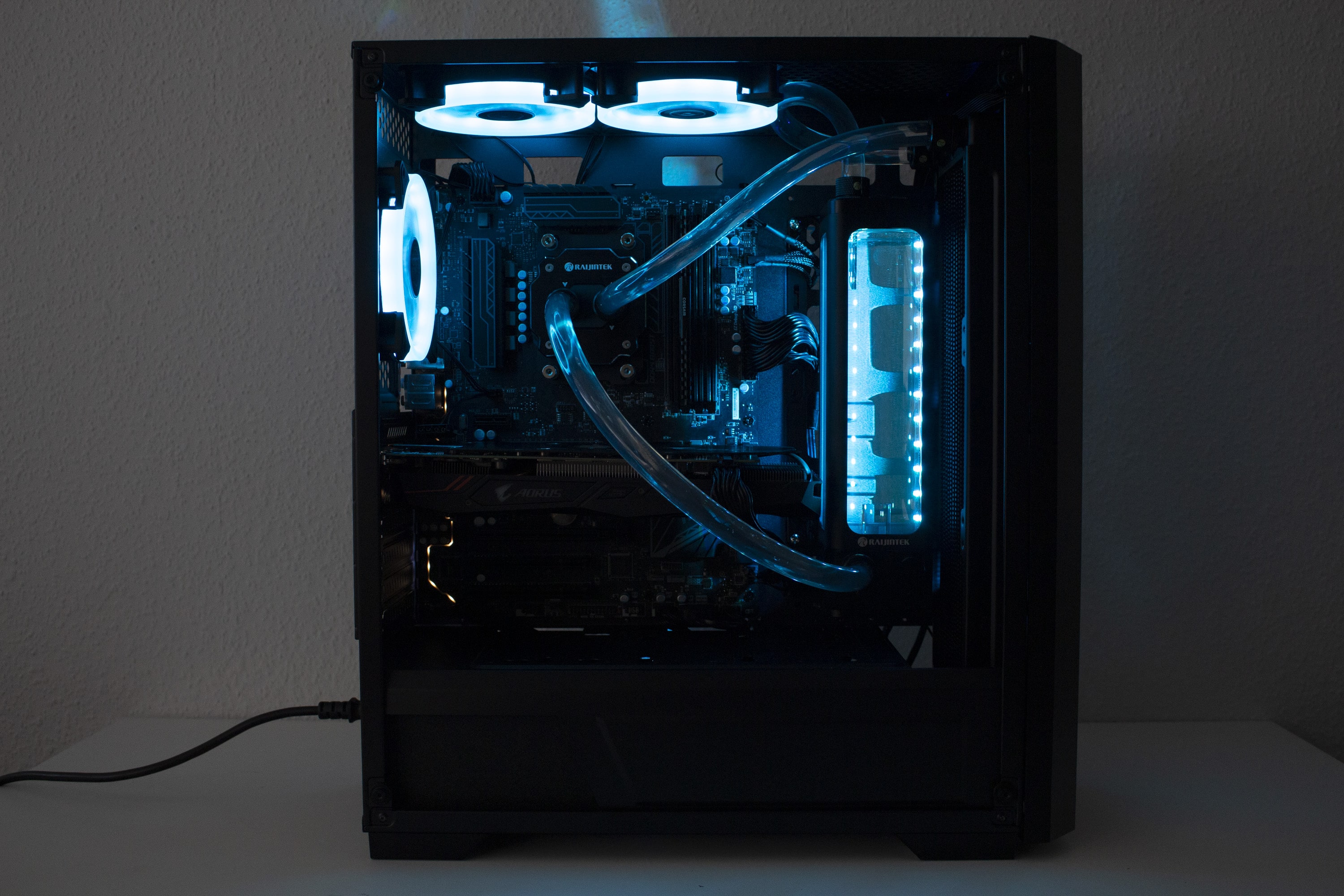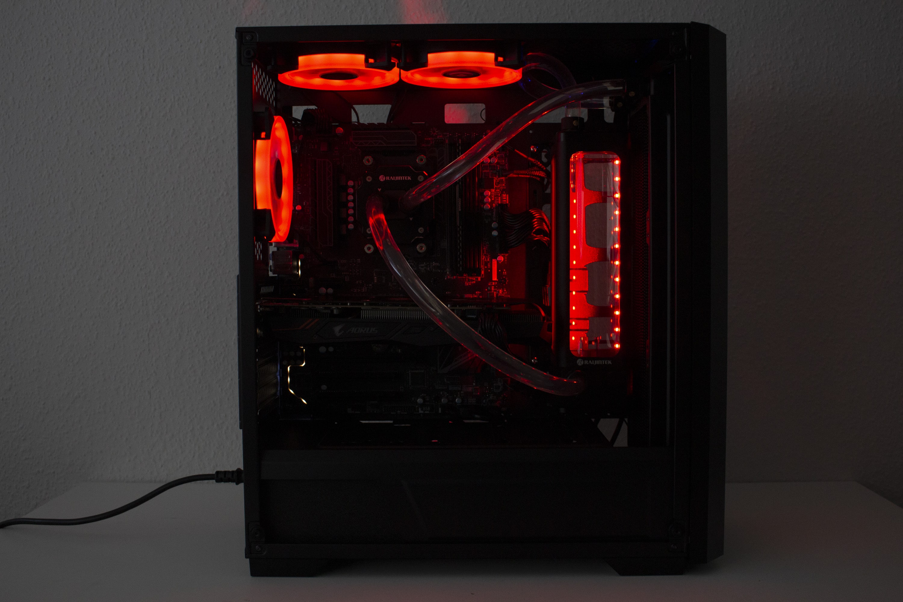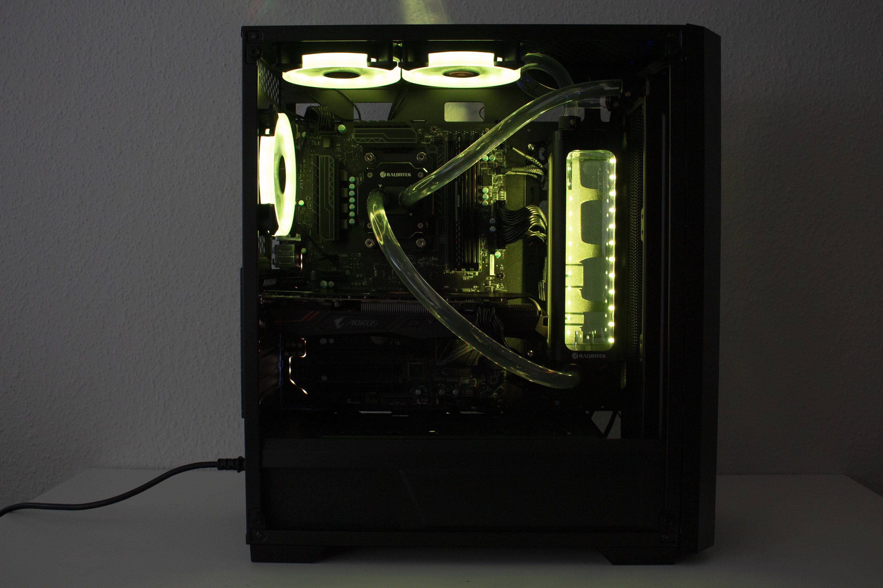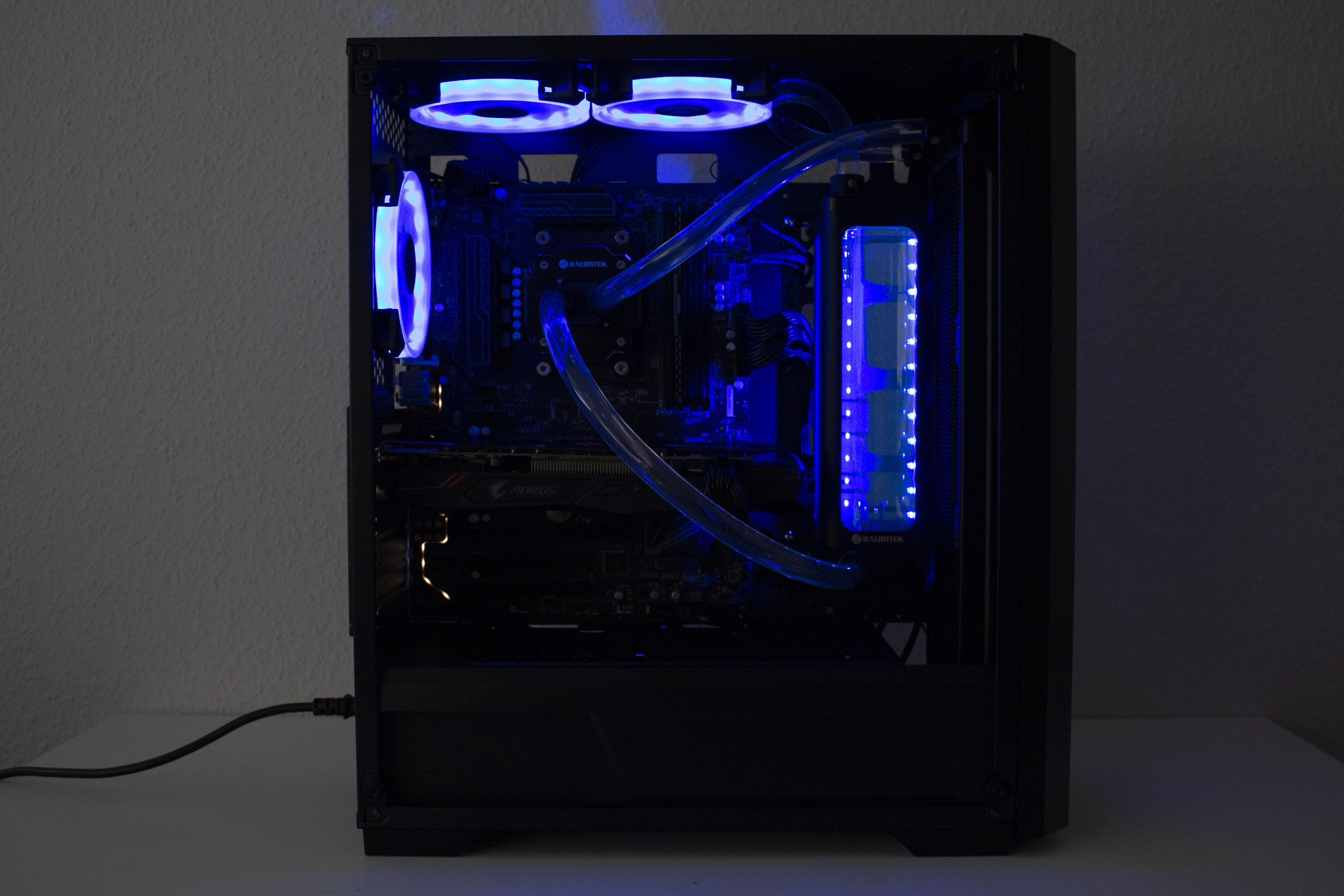 Als allerletzten Schritt kommt dann die Befüllung des Wasserkreislaufs. Dazu haben wir die Kühlflüssigkeit in die mitgelieferte Flasche bzw. anschließend in den Radiator gefüllt. Ein voller AGB reicht aus um den Kreislauf so weit zu befüllen, dass die Pumpe nicht trocken läuft. Nach zwei Stunden bei maximaler Umdrehungszahl der Pumpe, war der Kreislauf nahezu luftfrei und wird konnten die sehr schicke Beleuchtung betrachten und den Belastungstest starten.