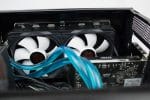 Die Backplate samt Halterung für den Kühler ist schnell montiert. Einfach Schrauben durchstecken, Stehbolzen platzieren, Halterung drauf legen und festziehen. Nun noch die Wärmeleitpaste auf den CPU auftragen und Kühler montieren. Der Radiator muss im gleichen Zuge montiert werden – es ist ja eine All-in-One-Wasserkühlung. Die Lüfter des Radiators werden natürlich so montiert, dass die Luft aus dem Gehäuse geblasen wird.