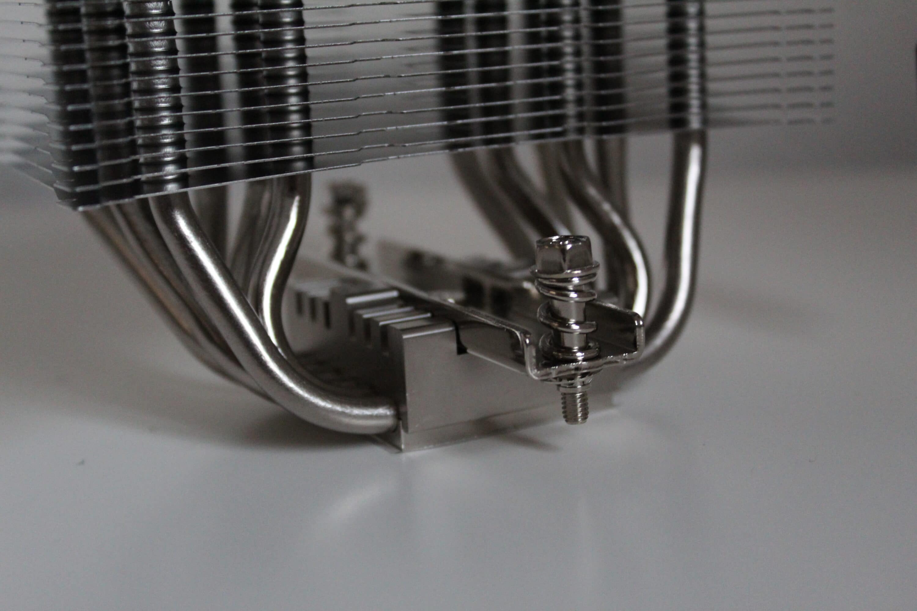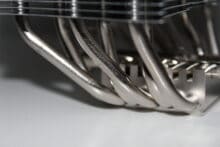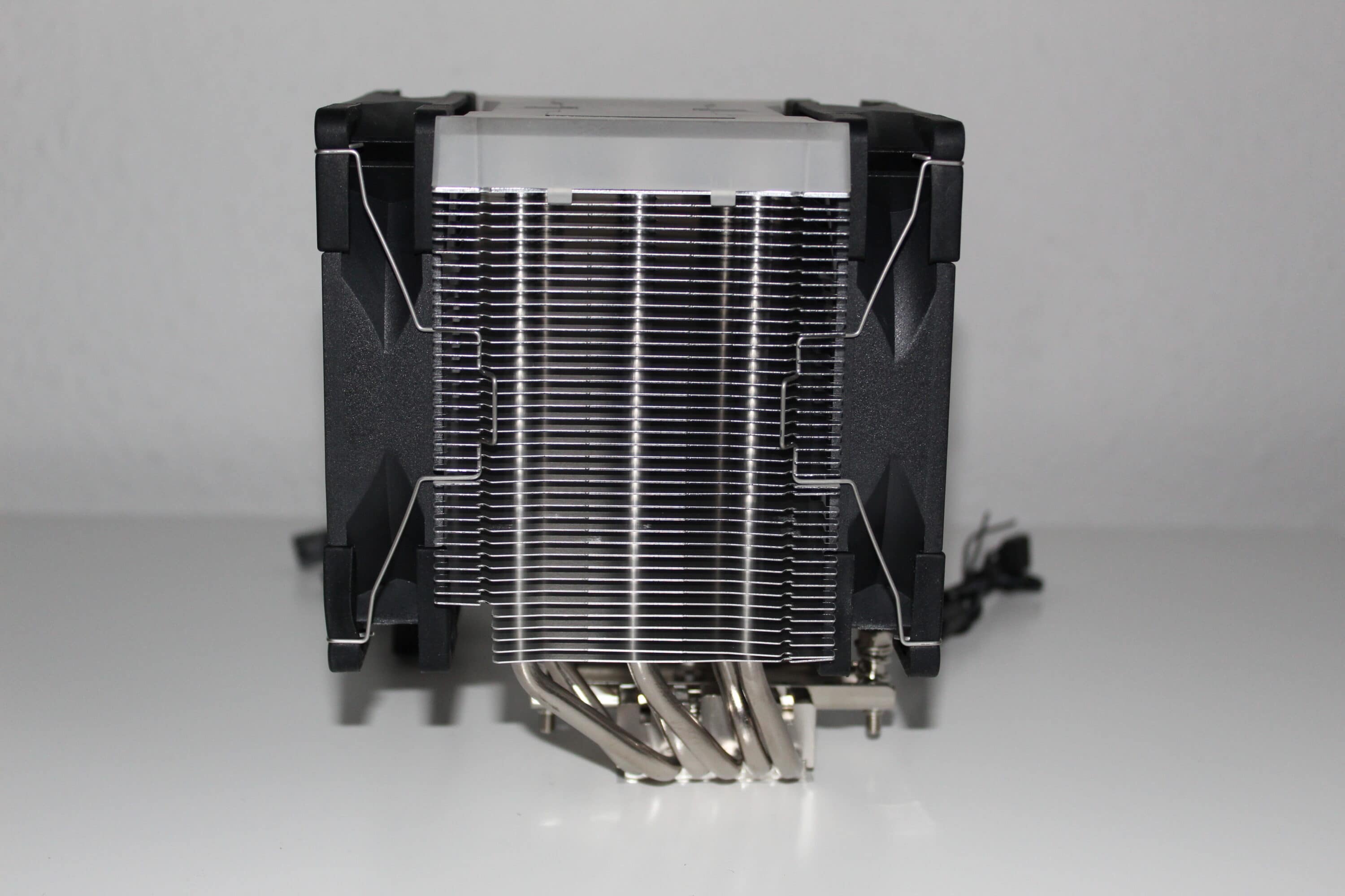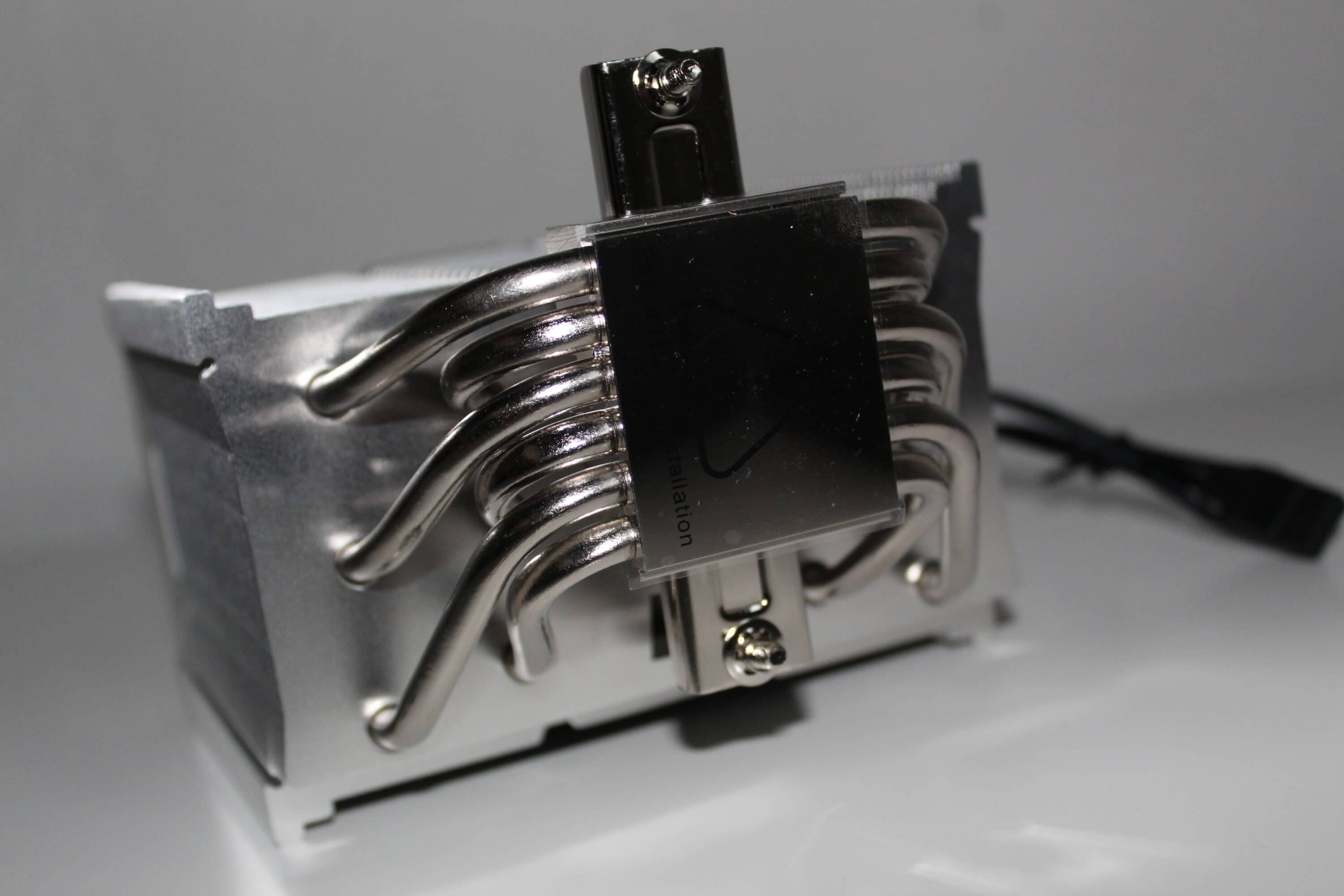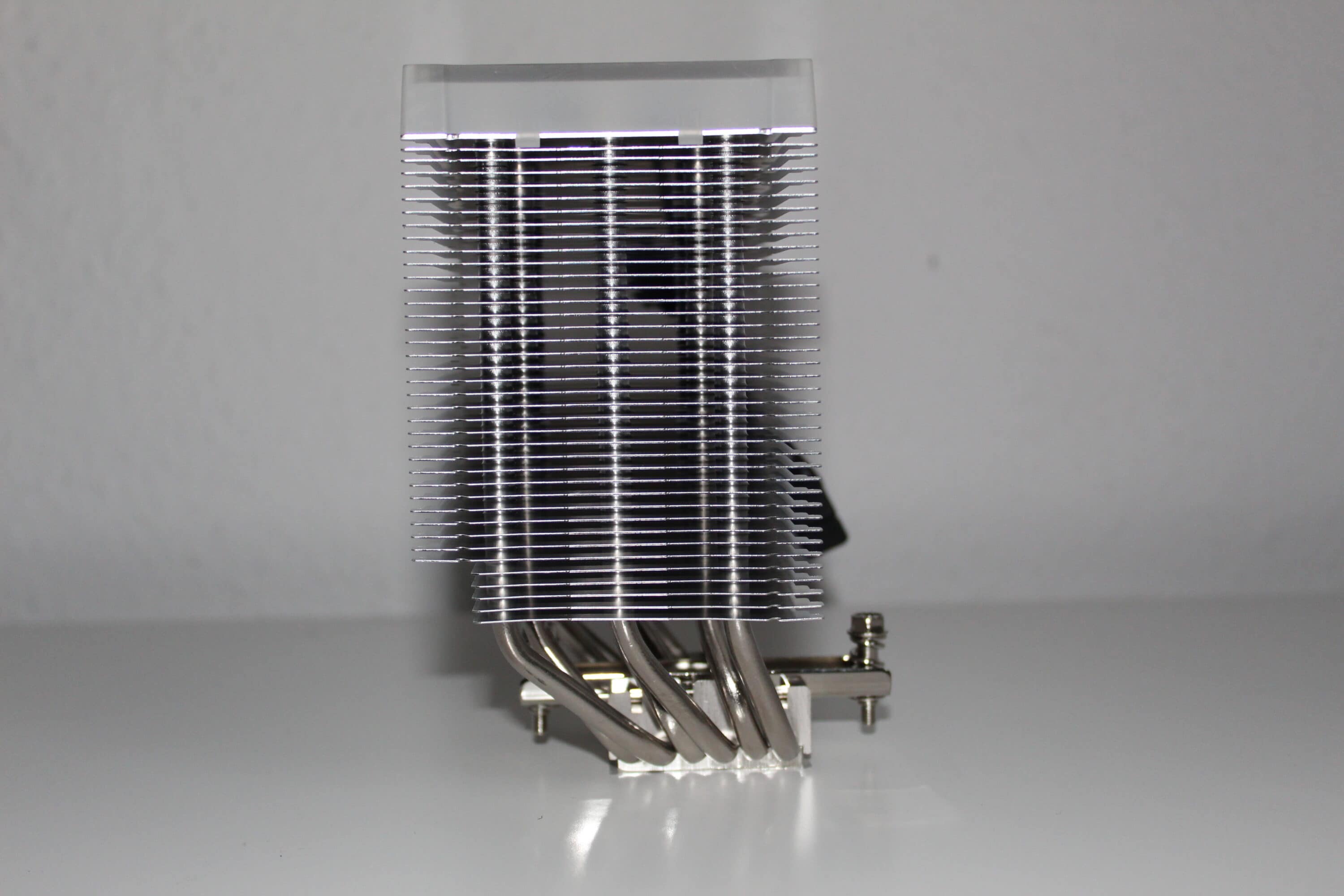 Im unteren Bereich ist die Montageschiene bereits vormontiert, dazu sehen die sechs vernickelten 5mm-Heatpipes ordentlich aus – so erstrahlt der reine Kühlkörper in einem einheitlichen Silber. Er sieht hochwertig aus, er fühlt sich gut an, es gibt keine Verarbeitungsmängel. Das überzeugt!