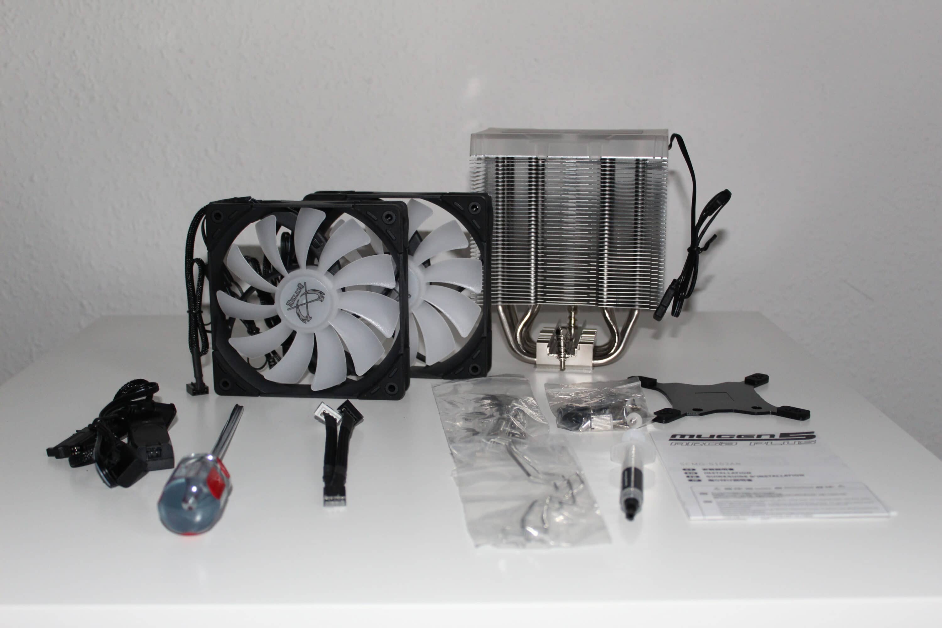 Neben dem eigentlichen Kühler liegen das Montagematerial, ein PWM-Splitter, ein RGB-Controller, ein Schraubendreher und Wärmeleitpaste im Karton. Der Schraubendreher ist wie schon beim Fuma 2 ein schönes Gimmick, um die Montage deutlich zu vereinfachen.