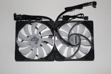 Jeder Lüfter besitzt ein eigenes PWM-Kabel und ein Kabel mit einem RGB-Stecker und einer RGB-Buchse. So kann man diese, gemeinsam mit dem LED-Top des Kühlkörpers in Reihe schalten und belegt so nur einen Slot auf dem RGB-Controller oder dem Mainboard.