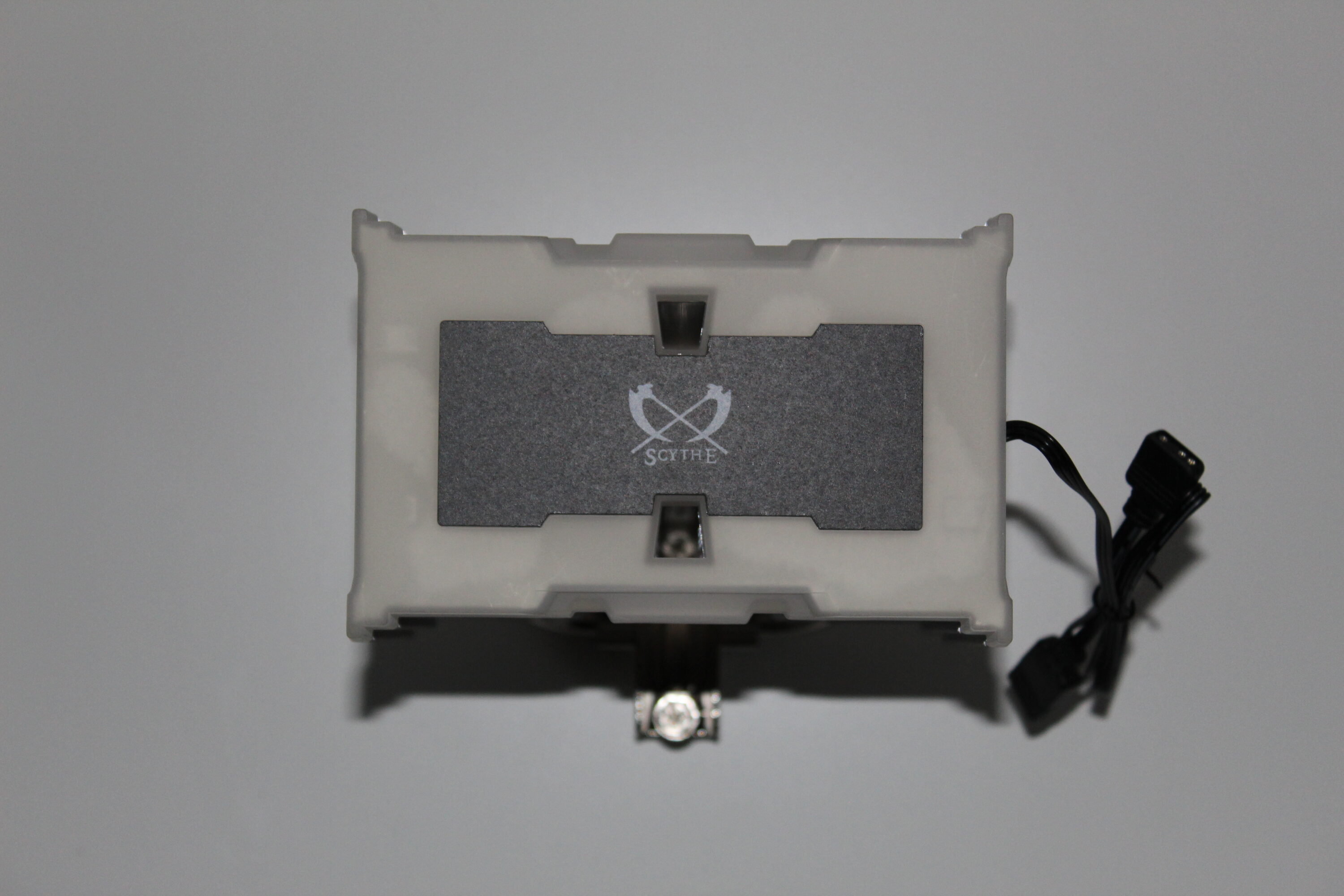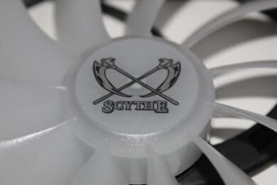 Die Lüfter fühlen sich ebenfalls hochwertig an und sind auf den ersten Blick RGB-technisch sehr unscheinbar. Die 11 Rotorenblätter sind milchig-weiß gehalten und in der Mitte ist ein Aufkleber mit dem Scythe-Logo angebracht. Wie üblich befinden sich an den Kanten der Lüfter Anti-Vibrationspads, die übertragene Störgeräusche durch Schwingungen minimieren sollen.