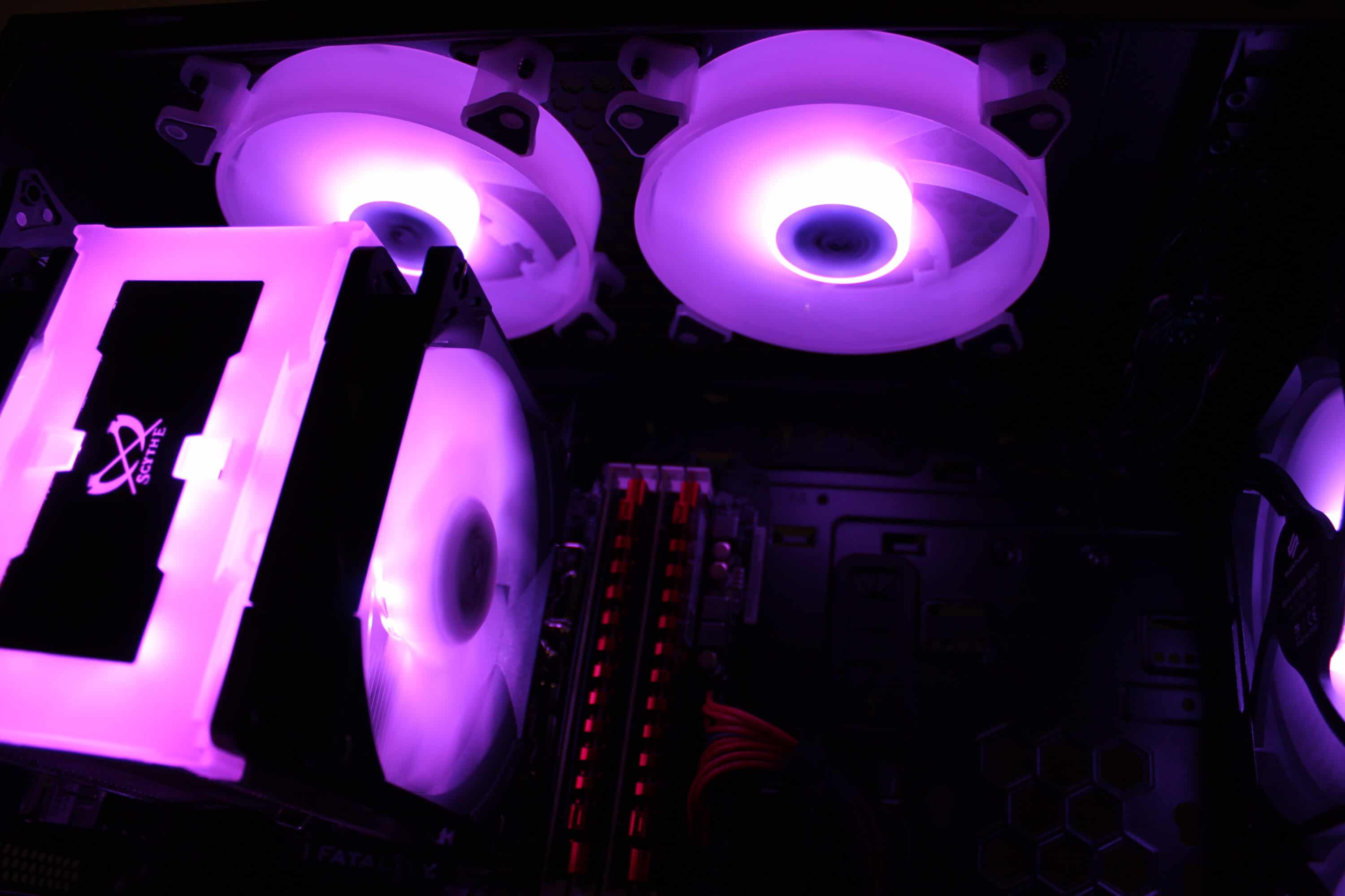 Die Ausleuchtung generell ist sehr gut, sowohl bei den Lüftern, als auch im Deckel sind die Farben kräftig und leuchtstark. Natürlich bleibt die generelle Optik eine Geschmackssache, jedoch haben wir hier objektiv gesehen keine Kritik. Auch das Koppeln mit „fremder“ RGB-Hardware, wie z.B. den ARGUS RS-06 wie auf dem Foto, führte zu keinen Problemen.
