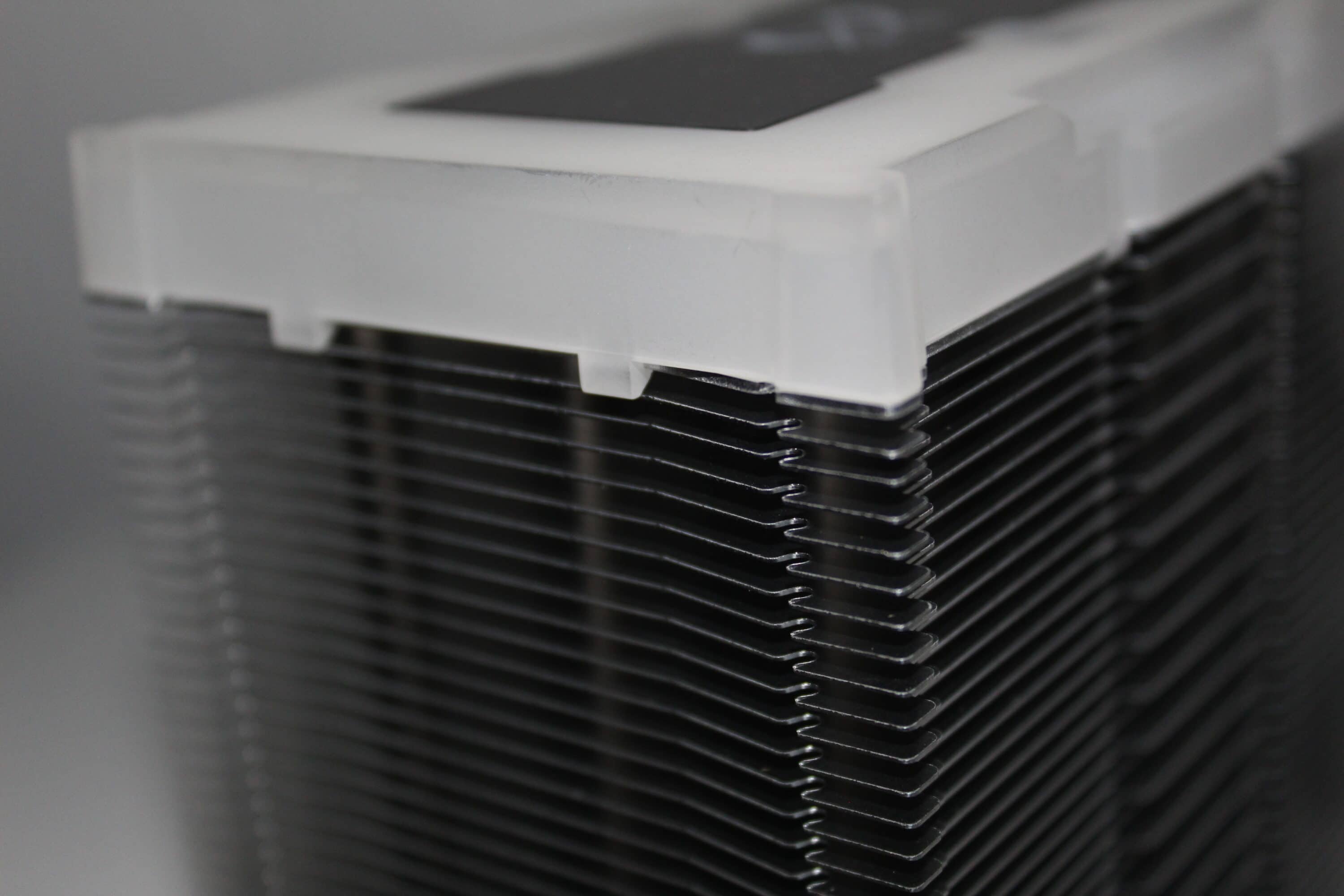 Der Kühlkörper besteht aus dünnen Rippen, die auf der oberen Seite von einem Kunststoff-Deckel geschlossen werden. Dieser lässt sich später beleuchten, wie es bereits auf dem Produktbild auf dem Karton zu sehen ist. Außerdem ist dieser nur eingehakt, sitzt jedoch fest. Sollte es jedoch mal Platzmangel geben oder man erachtet die LEDs als störend, so könnte man diesen demontieren. Modularität und Optionen sind natürlich immer vorteilhaft!