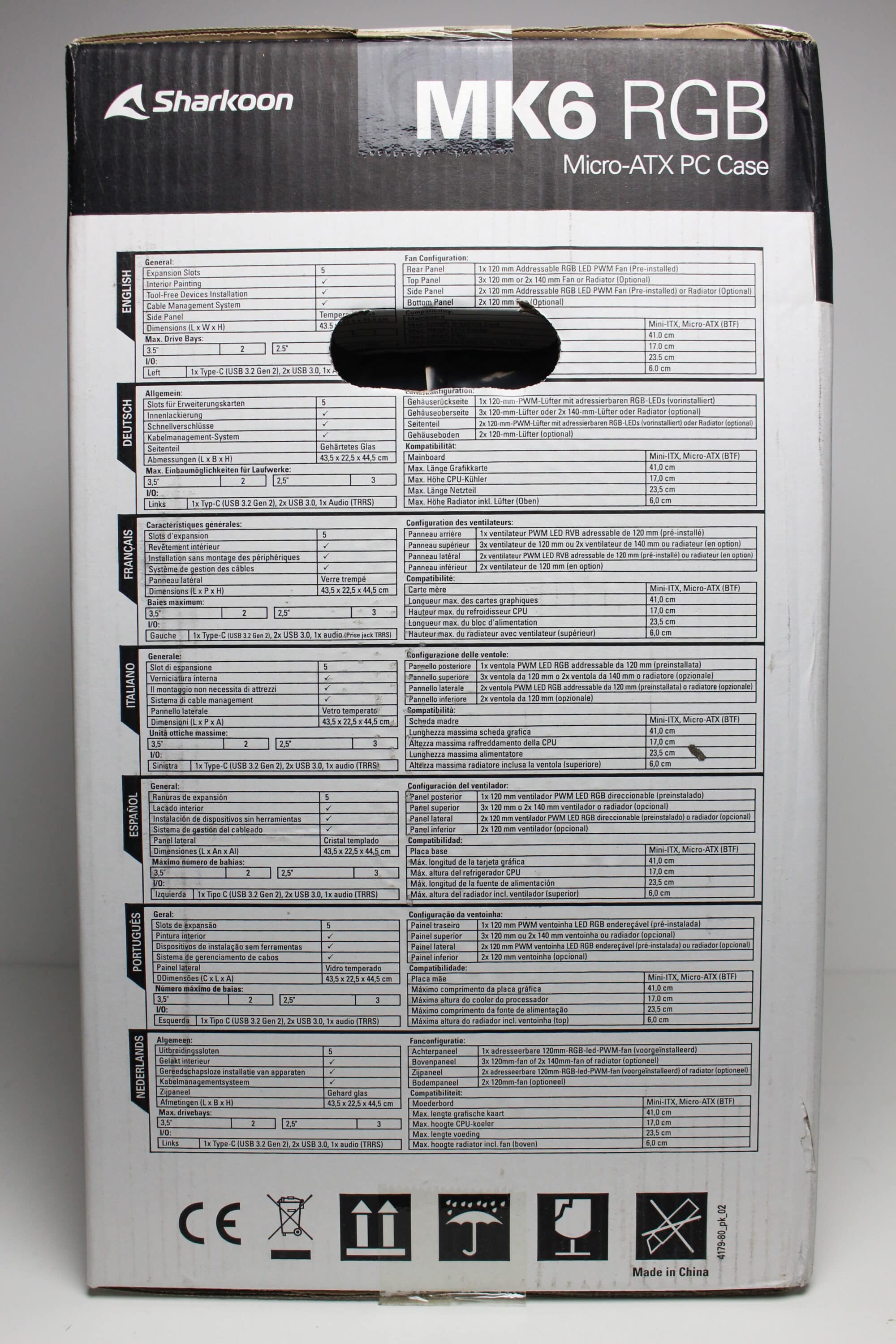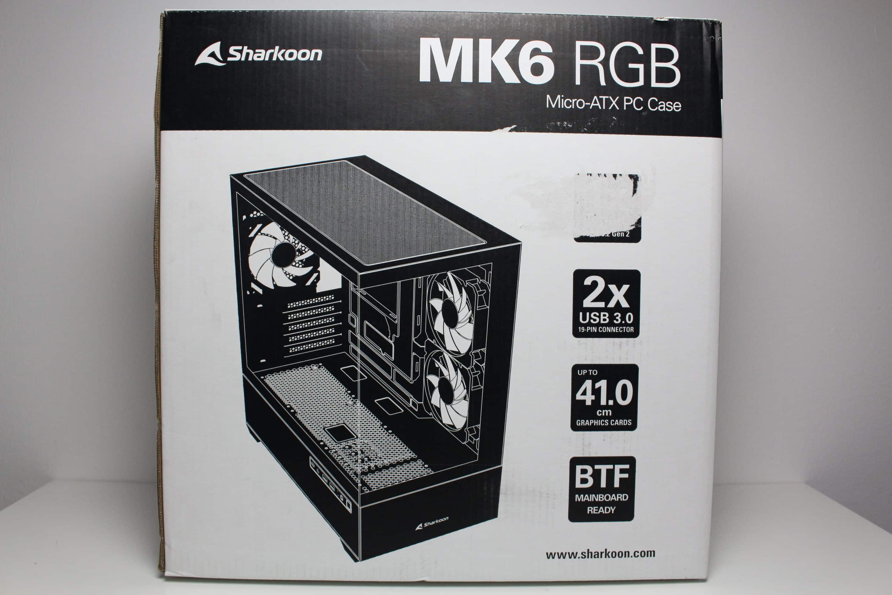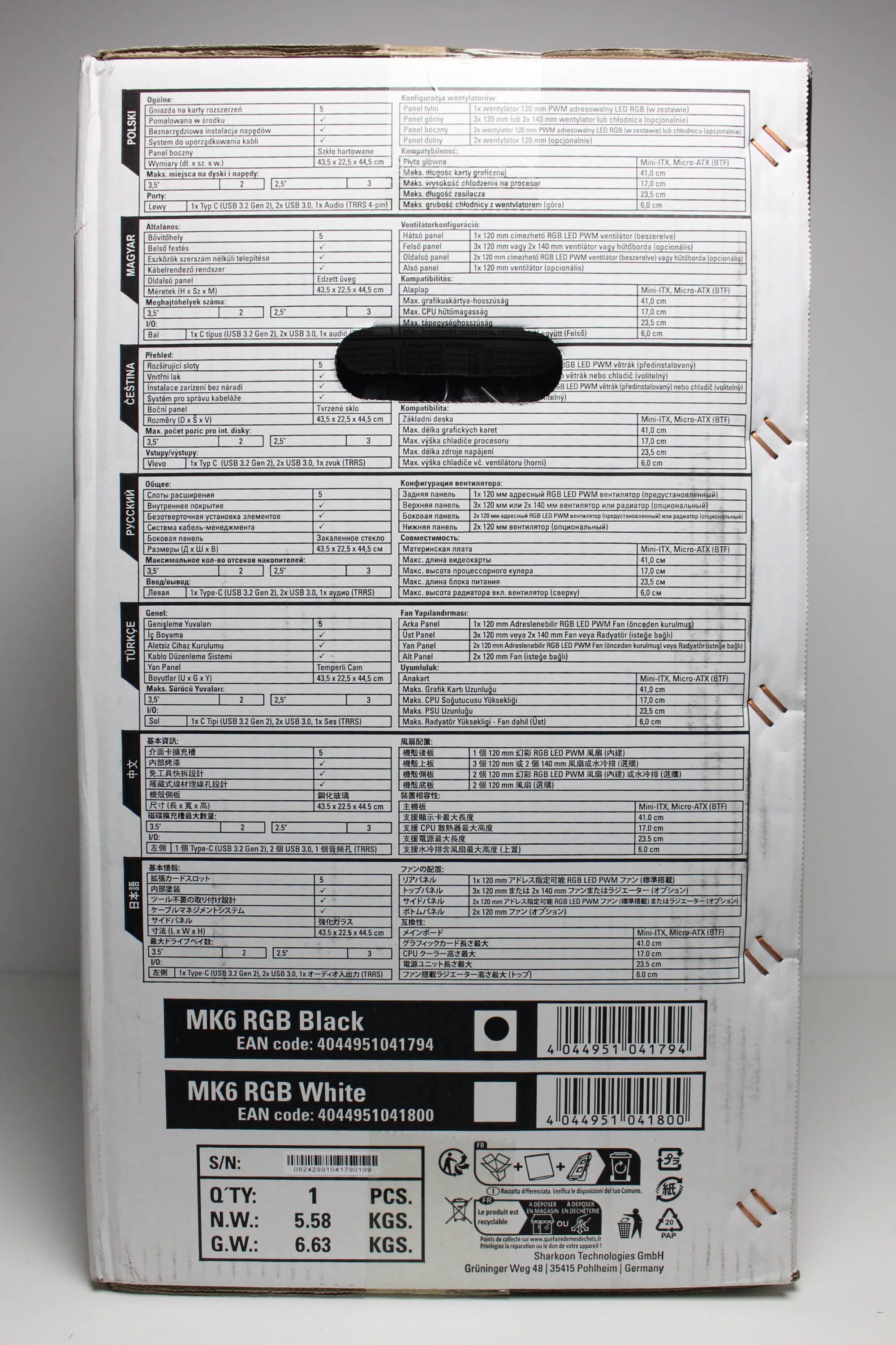 Die Gestaltung der Kartonage des Sharkoon MK6 RGB ist als unauffällig zu bezeichnen. Die Pappe wurde äußerlich weiß sowie schwarz bedruckt und zeigt sowohl zwei Abbildungen des Mini-Towers als auch eine Auflistung der wichtigsten Features des MK6 RGB. Seitlich platziert Sharkoon außerdem mehrere Tabellen mit allen technischen Daten in unterschiedlichen Sprachen.