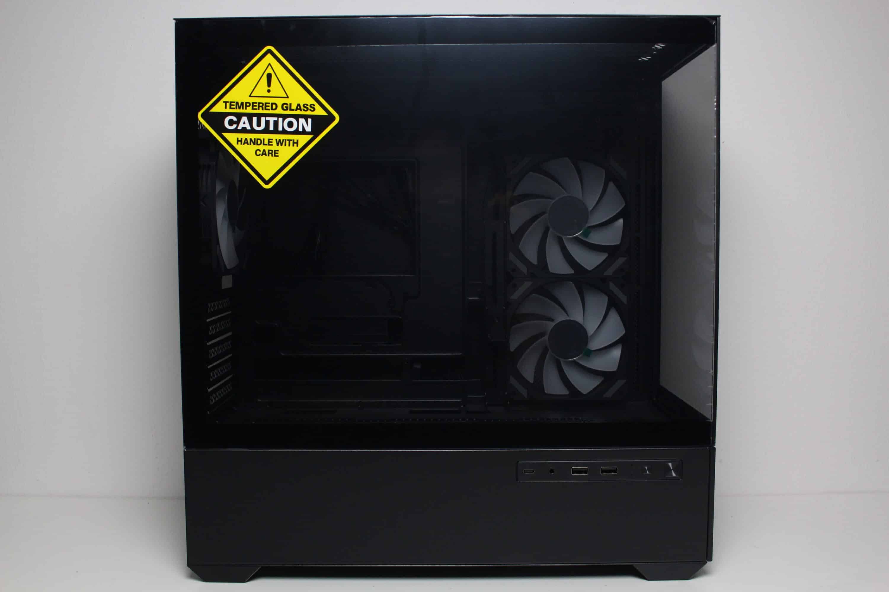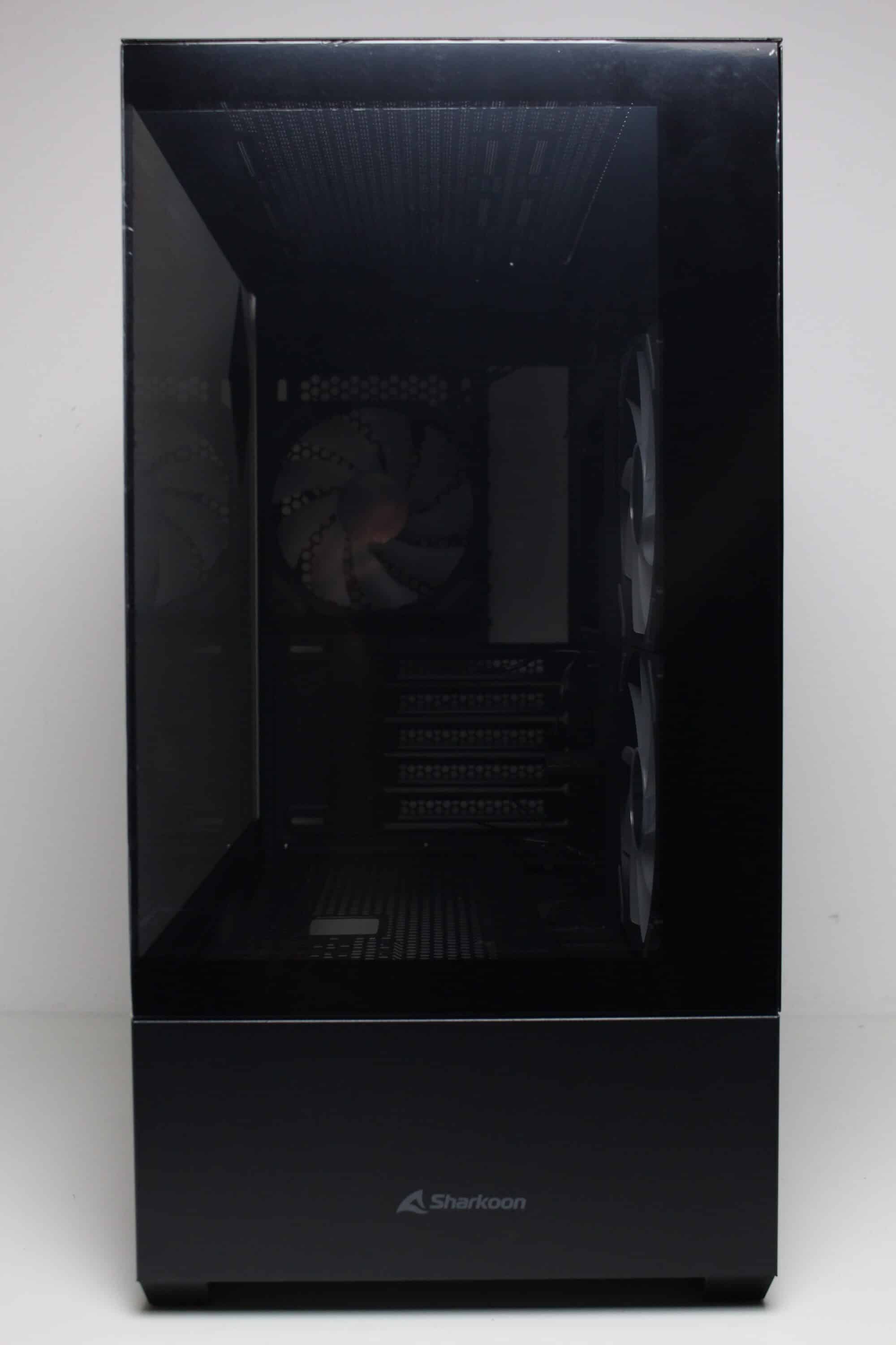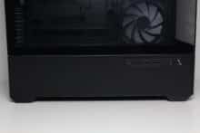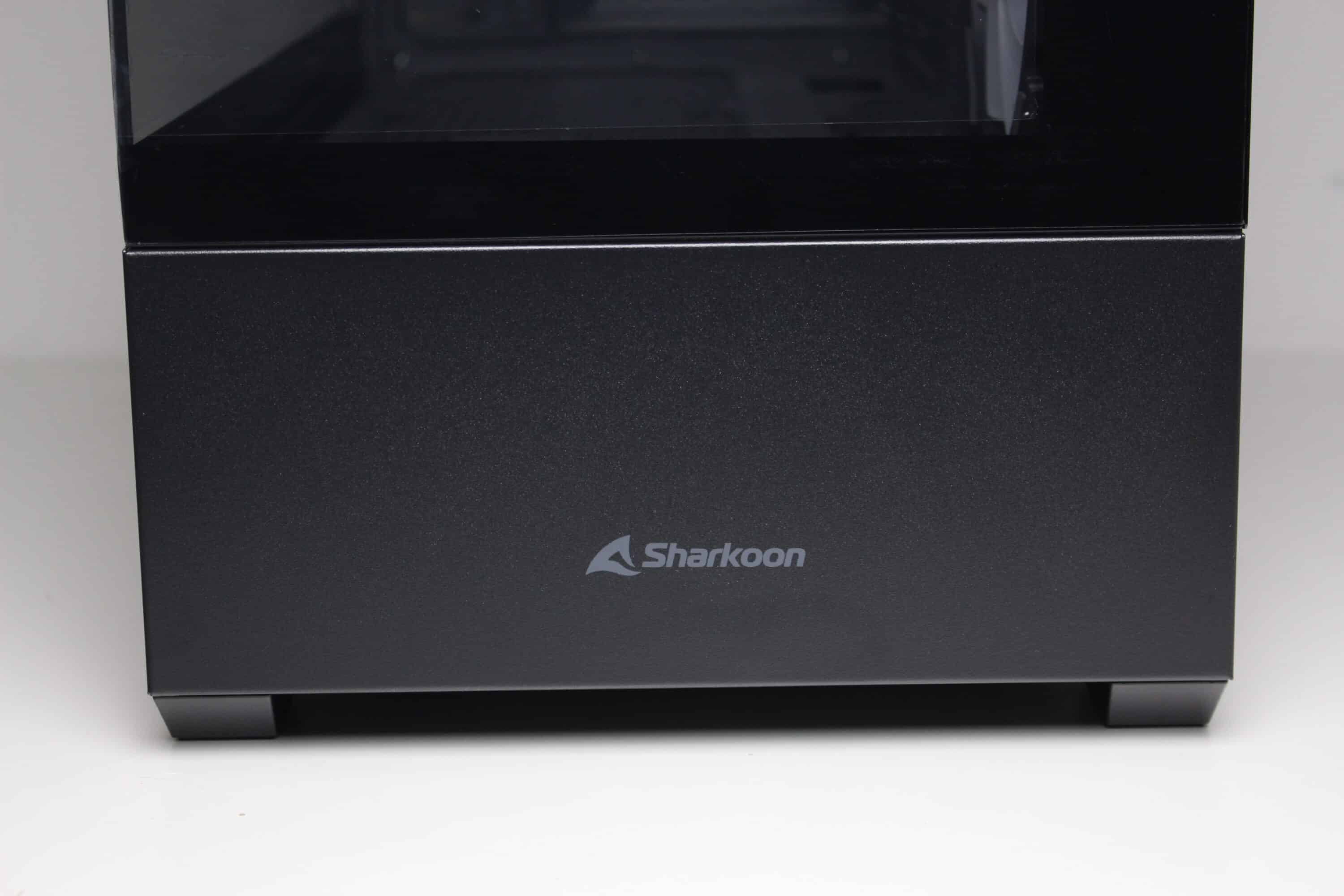 Optisch ordnet sich das Sharkoon in die Kategorie der „Aquarium-Gehäuse“ ein. So verbaut der Hersteller sowohl an der Front als auch seitlich ein Sichtfenster aus Tempered Glass. Das Glas an der Front wurde bei der schwarzen Version leicht getönt und könnte bei Bedarf abgebaut werden. Der Ausbau erfordert jedoch die Entfernung mehrerer Schrauben. Unterhalb des Sichtfensters platziert Sharkoon ein Stahlpanel mit dem Herstellerlogo. Bei Bedarf kann auch dieses durch die eingesetzten Push-Pins einfach entfernt werden.