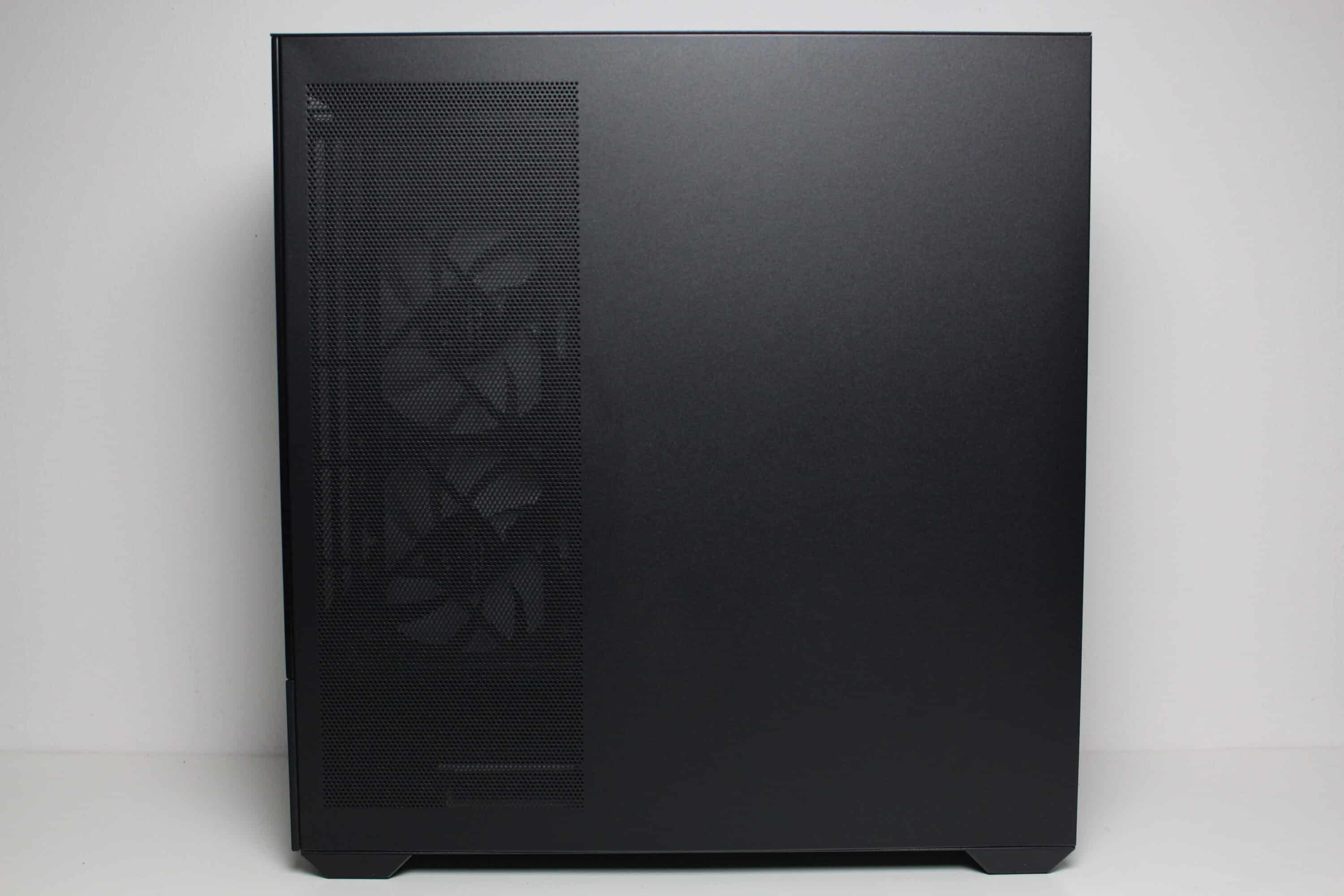 Wie eingangs bereits erwähnt, besteht beim Sharkoon MK6 RGB nicht nur das Frontpanel sondern auch das linke Seitenteil aus getöntem Tempered Glass. Die Demontage gestaltet sich dabei aufgrund der eingesetzten Push-Pin-Mechanik sehr einfach. Über eine Sicherungsschraube verfügt das Sidepanel hingegen nicht. Das rechte Seitenteil besteht aus Stahl, wurde ebenfalls mit einer Push-Pin-Mechanik ausgestattet und offenbart an der linken Seite eine große Lüfteröffnung, die aufgrund der feinen Struktur gleichzeitig als Staubfilter fungiert.