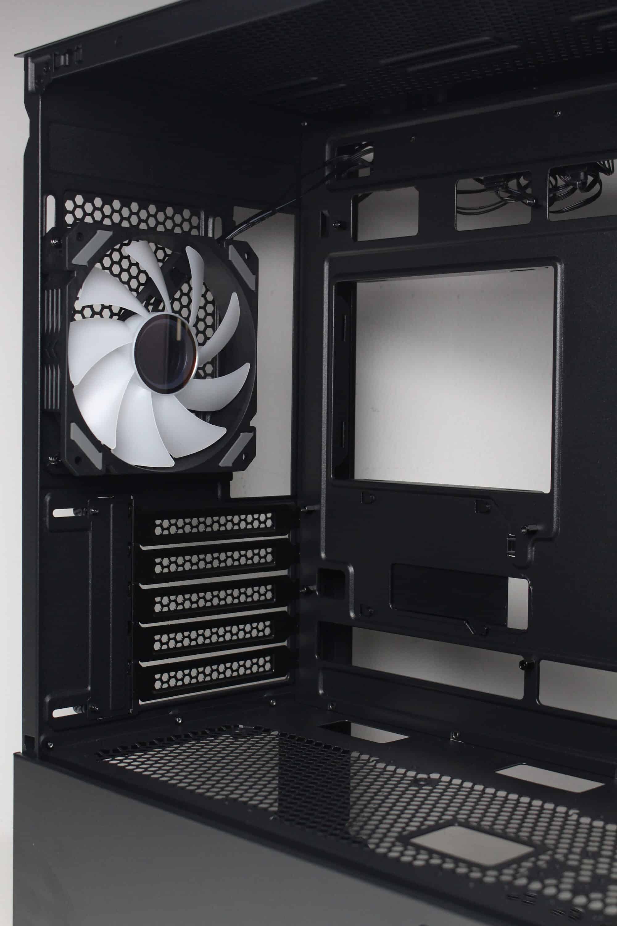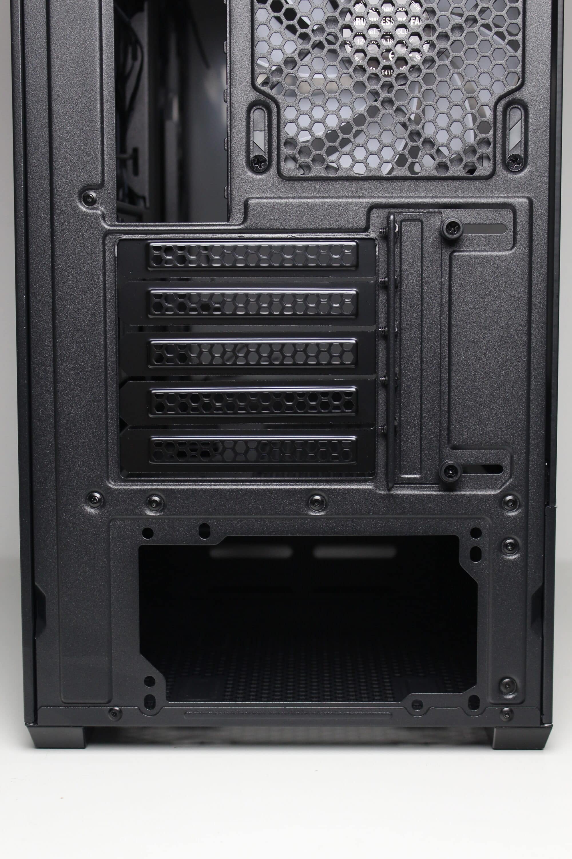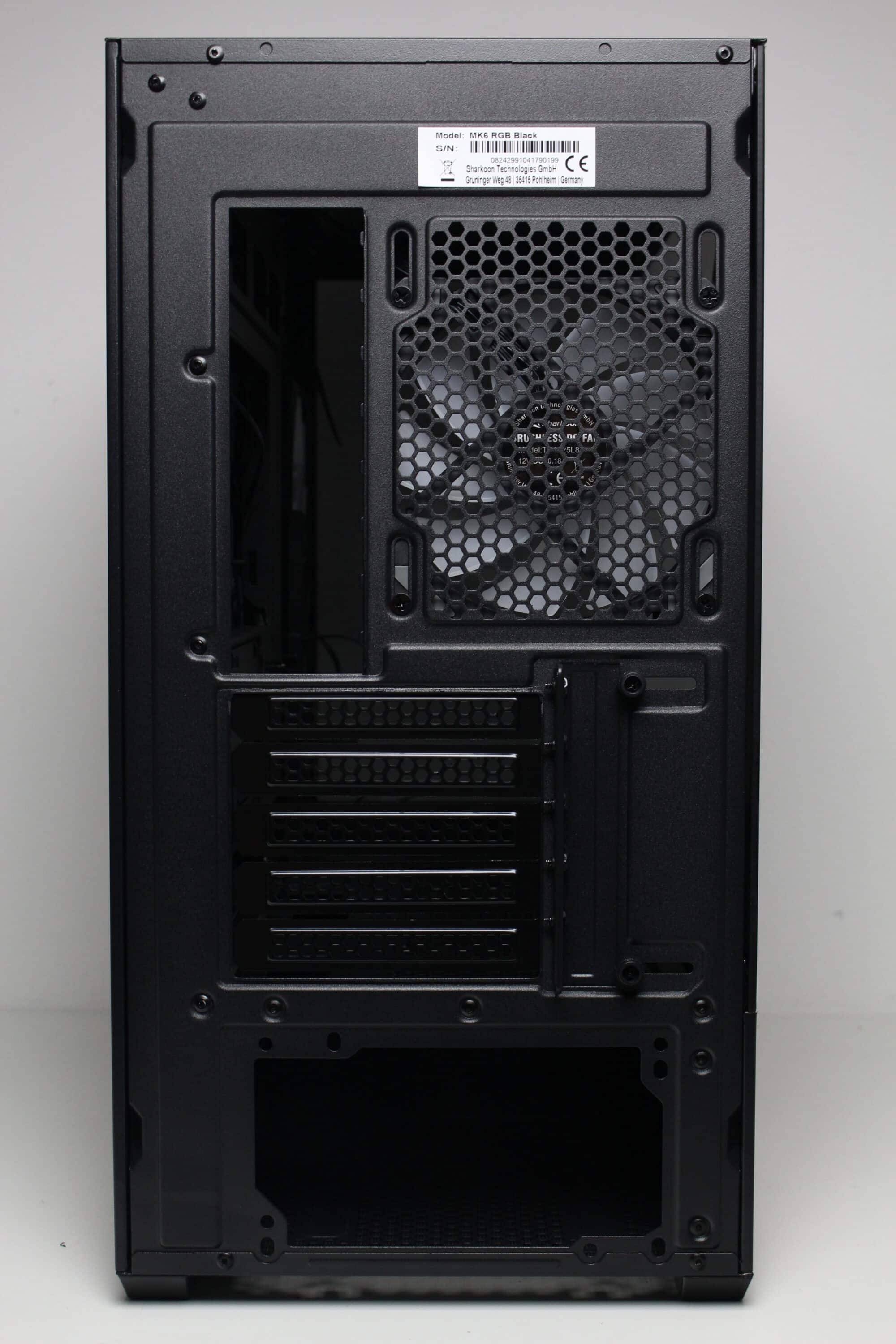 An der Rückseite des Sharkoon MK6 RGB lassen sich keine Überraschungen erkennen. Im unteren Bereich finden wir den Montagepunkt für das Netzteil und darüber fünf wiederverwendbare und perforierte PCI-Slotblenden. Im oberen Bereich montiert Sharkoon den ersten von drei vorinstallierten 120-mm-ARGB-Lüftern.
