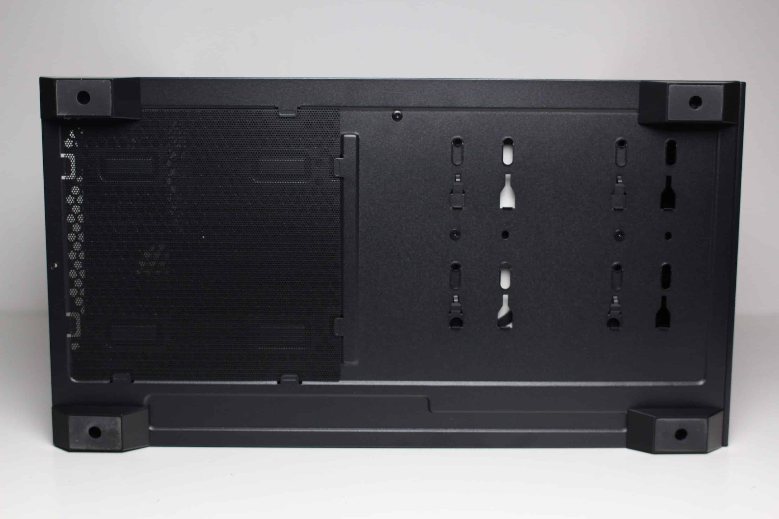 Auch an der Unterseite dieses Mini-Towers bleibt es unspektakulär. Zu erkennen ist eine sehr große Belüftungsöffnung für das Netzteil sowie eine davor platzierte Staubfiltermatte aus Mesh. Die Befestigung des Staubfilters erfolgt über simple Haltenasen aus Stahl. Im vorderen Bereich finden wir vier Montageschienen sowie zwei Schrauben zur Arretierung des HDD-Käfigs.