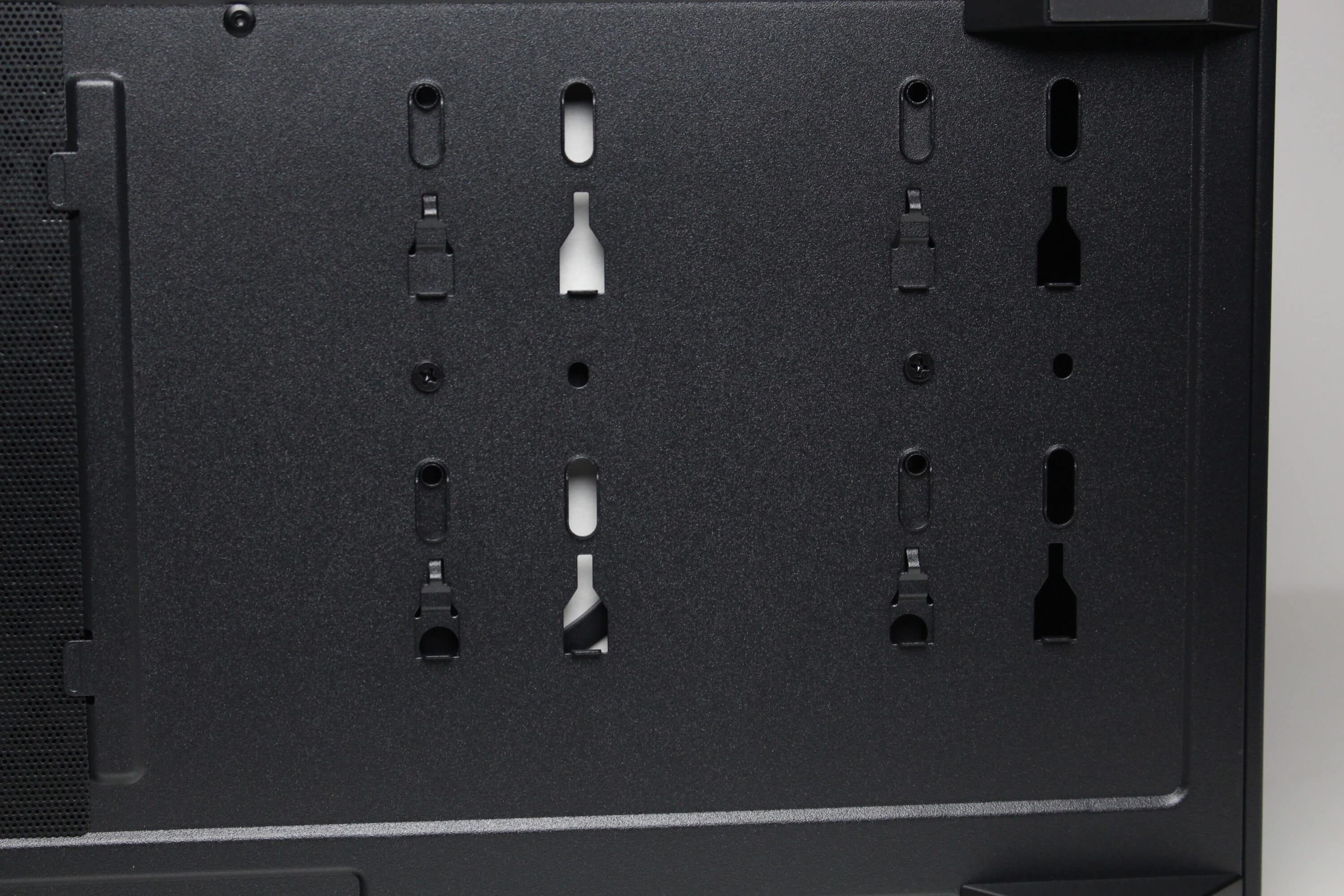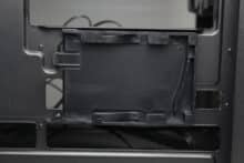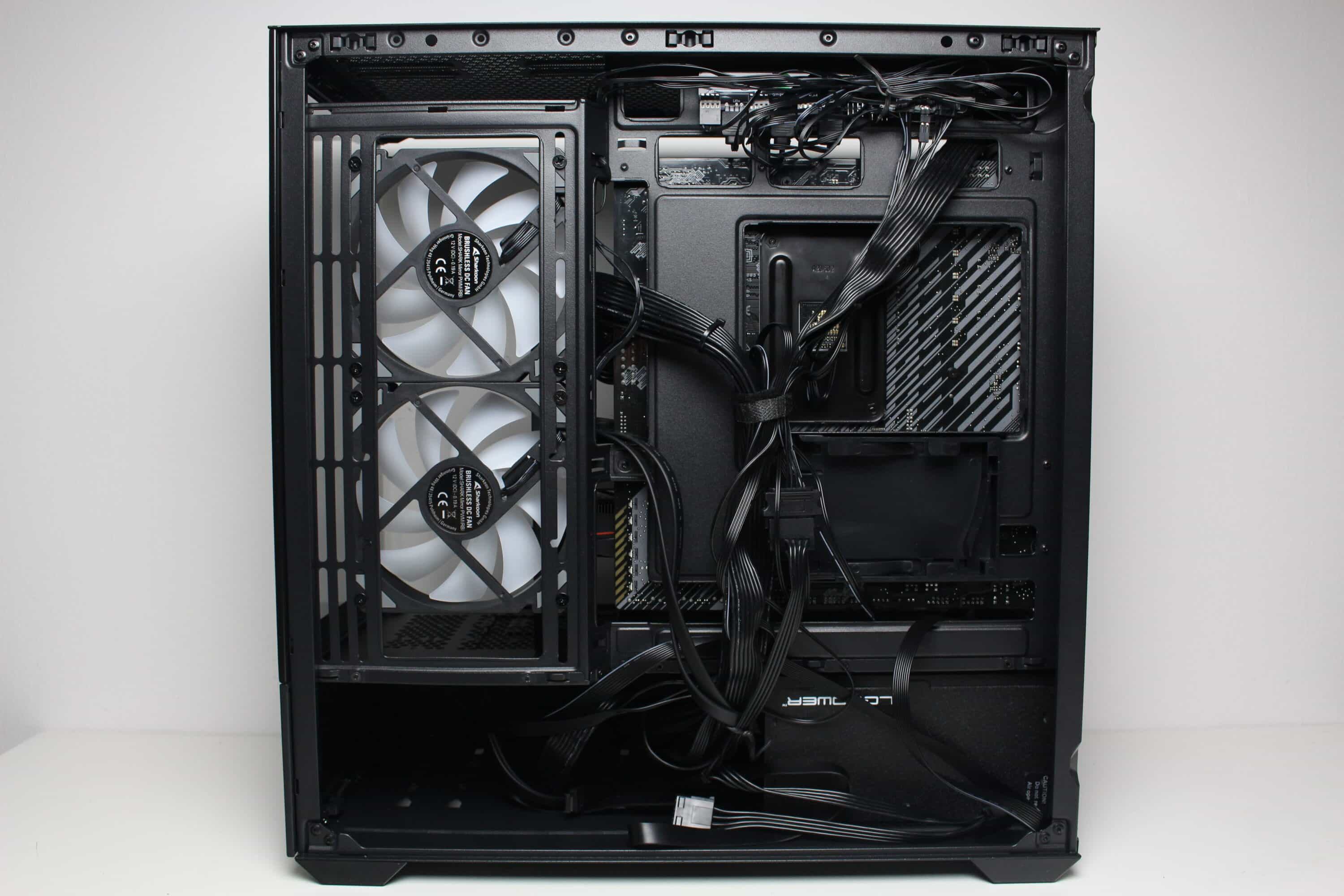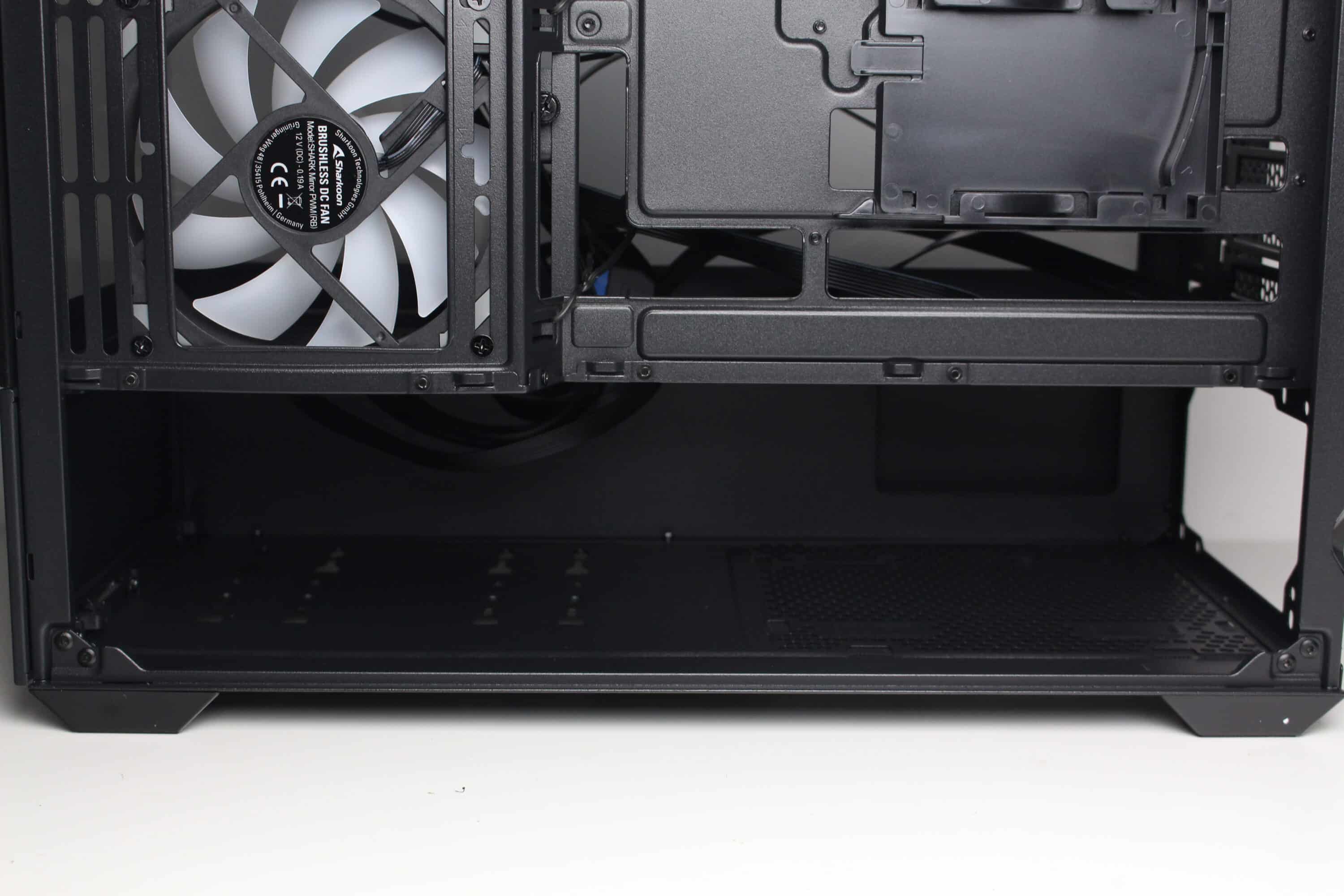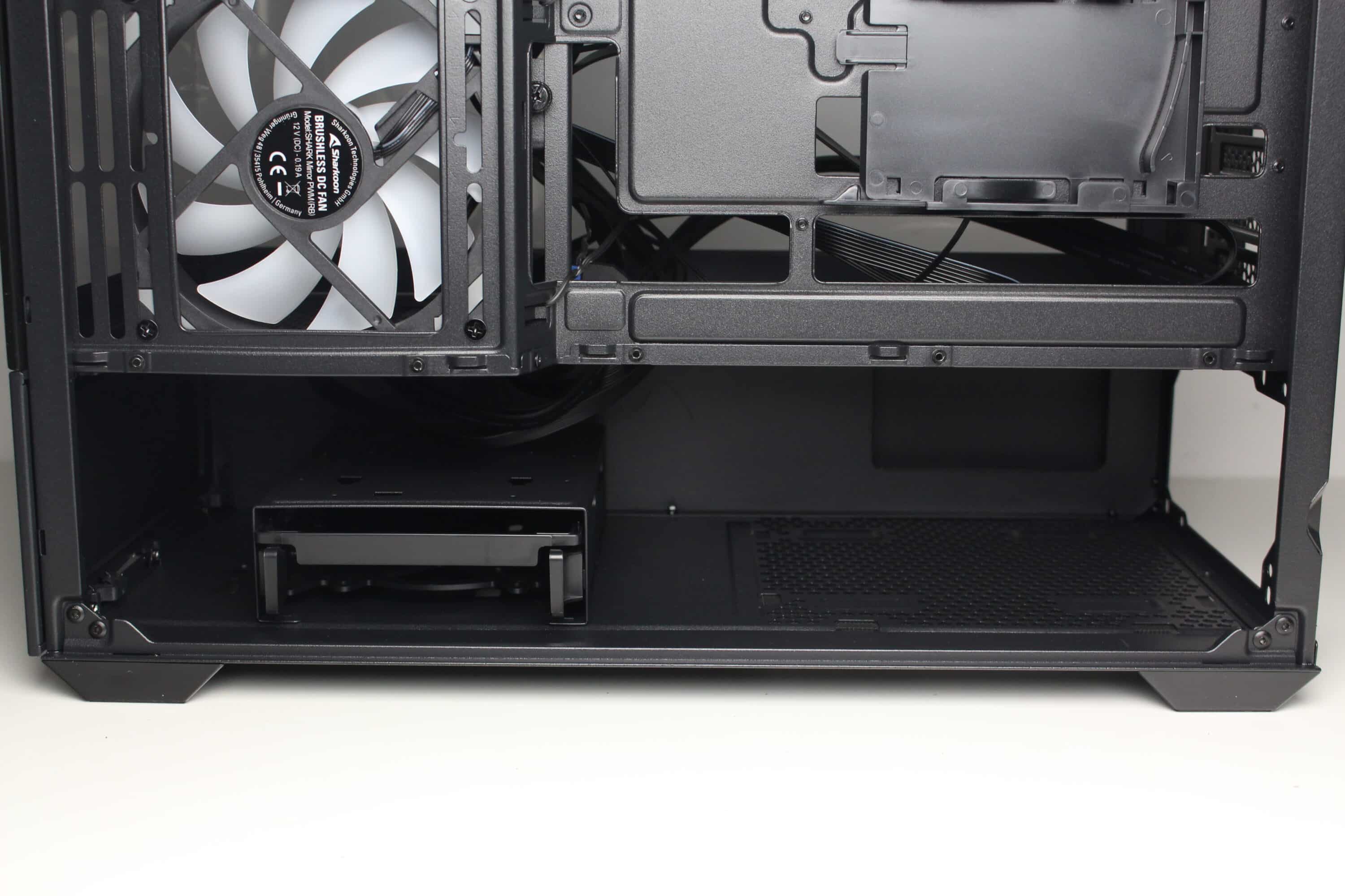 An der Rückseite des Mainboard-Trays gibt es circa 20 Millimeter Platz für Kabel und zahlreiche Haltepunkte bzw. Ösen für Kabelbinder. Die Netzteilkammer bietet, wer hätte es gedacht, Platz für ein normales ATX-Netzteil, welches an der Rückseite befestigt wird. Auf eine entkoppelte Montage verzichtet Sharkoon dabei komplett. Vor dem Netzteil montiert der Hersteller einen modularen HDD-Käfig, der in zwei unterschiedlichen Positionen eingebaut werden kann.