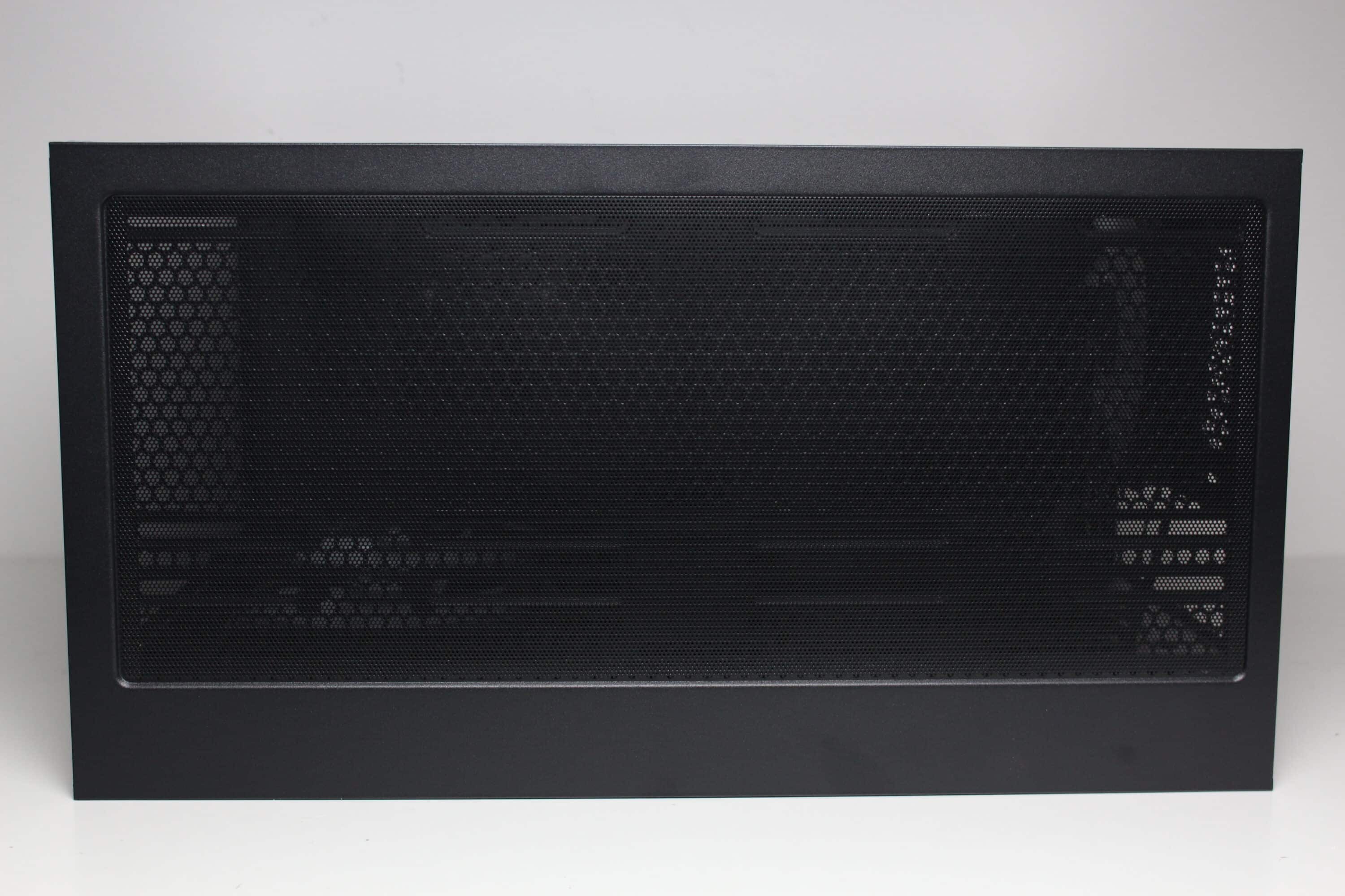Die Gestaltung des Deckels ist zur Erzielung eines hohen Airflows ausgelegt worden. So verfügt dieser über ein großes Lüftergitter mit nach außen versetzten Montageschienen für bis zu drei 120-mm- oder zwei 140-mm-Lüfter bzw. entsprechend großer Radiatoren. Zum Schutz vor Staub und zur Verbesserung der Optik platziert Sharkoon über dem Gitter zudem eine magnetische Staubfiltermatte aus Mesh.