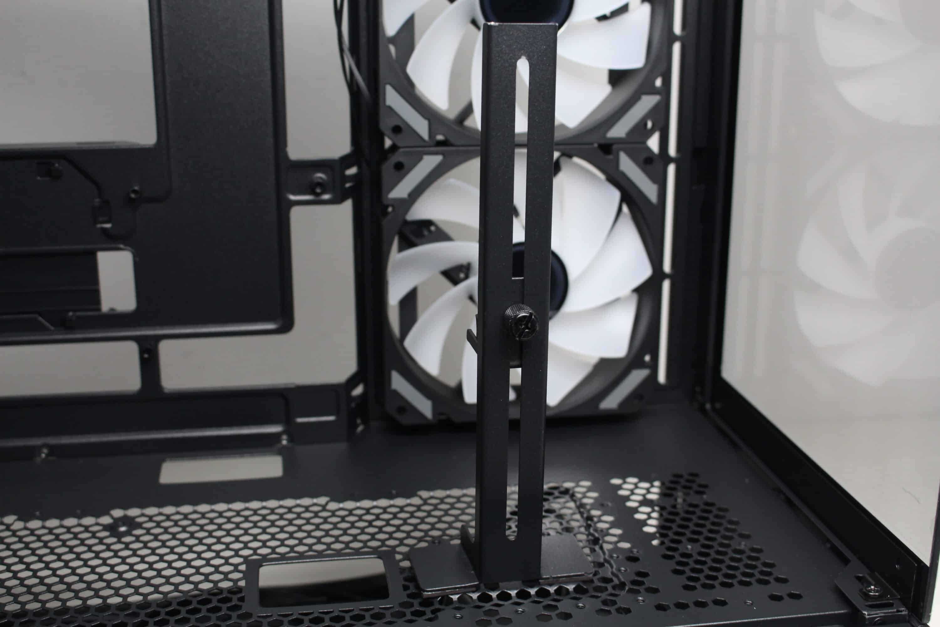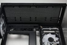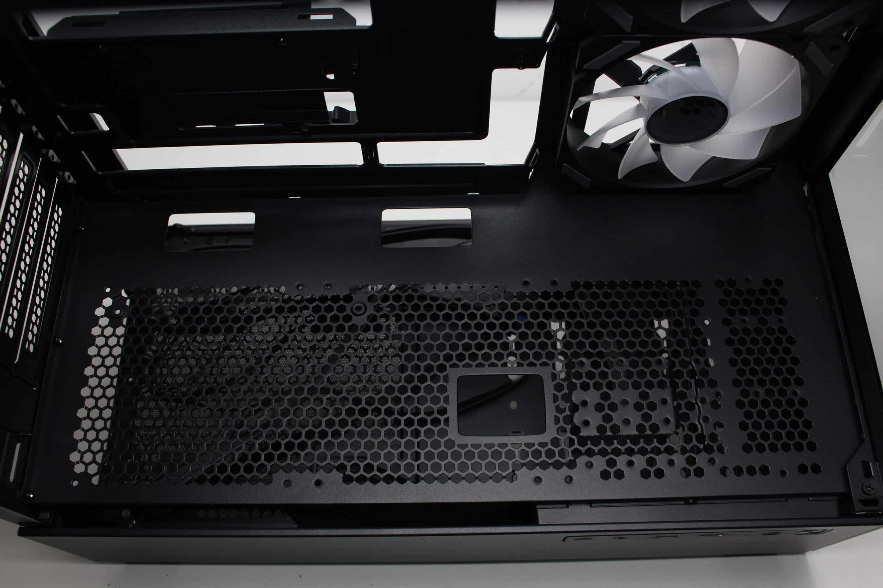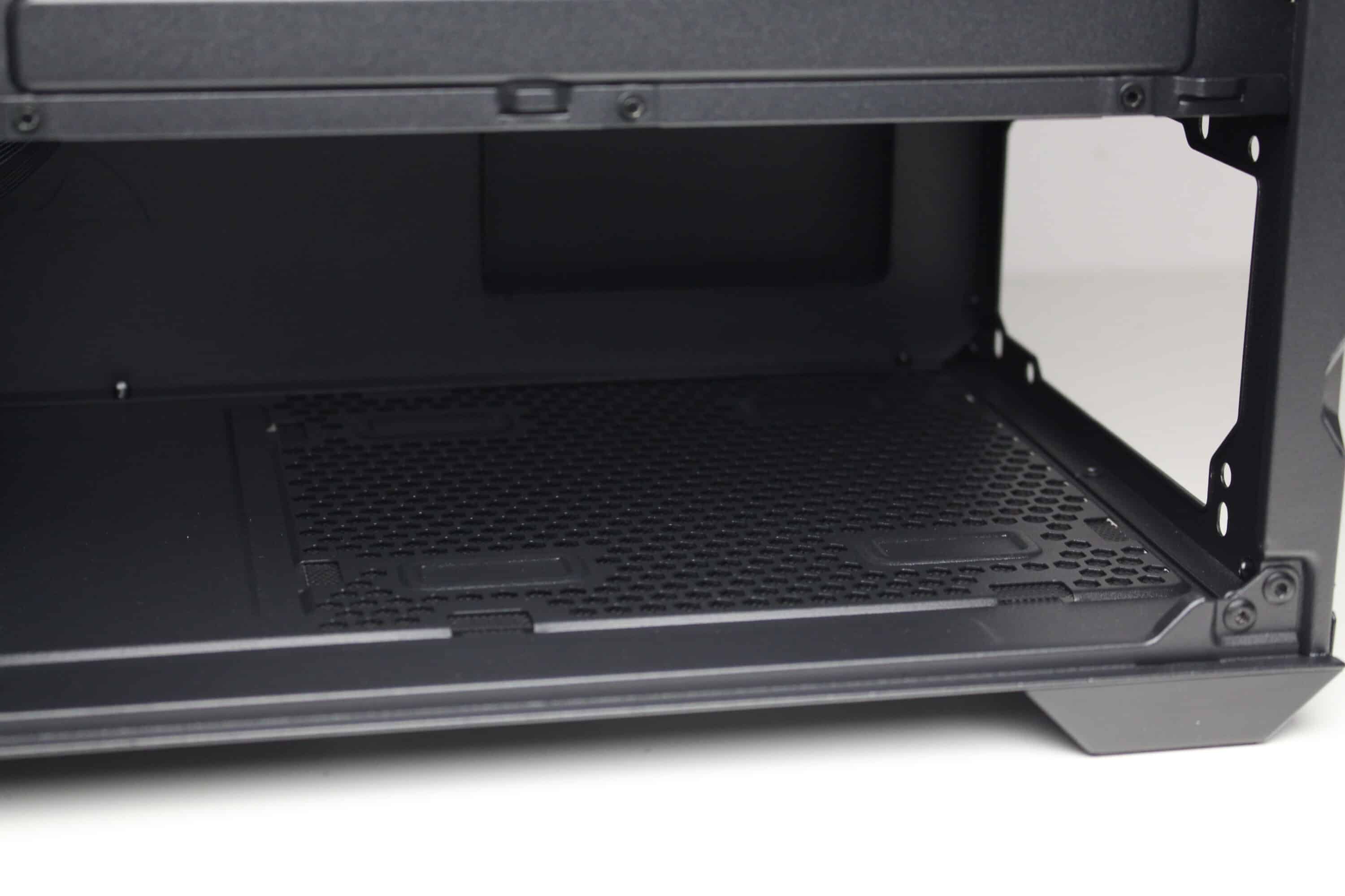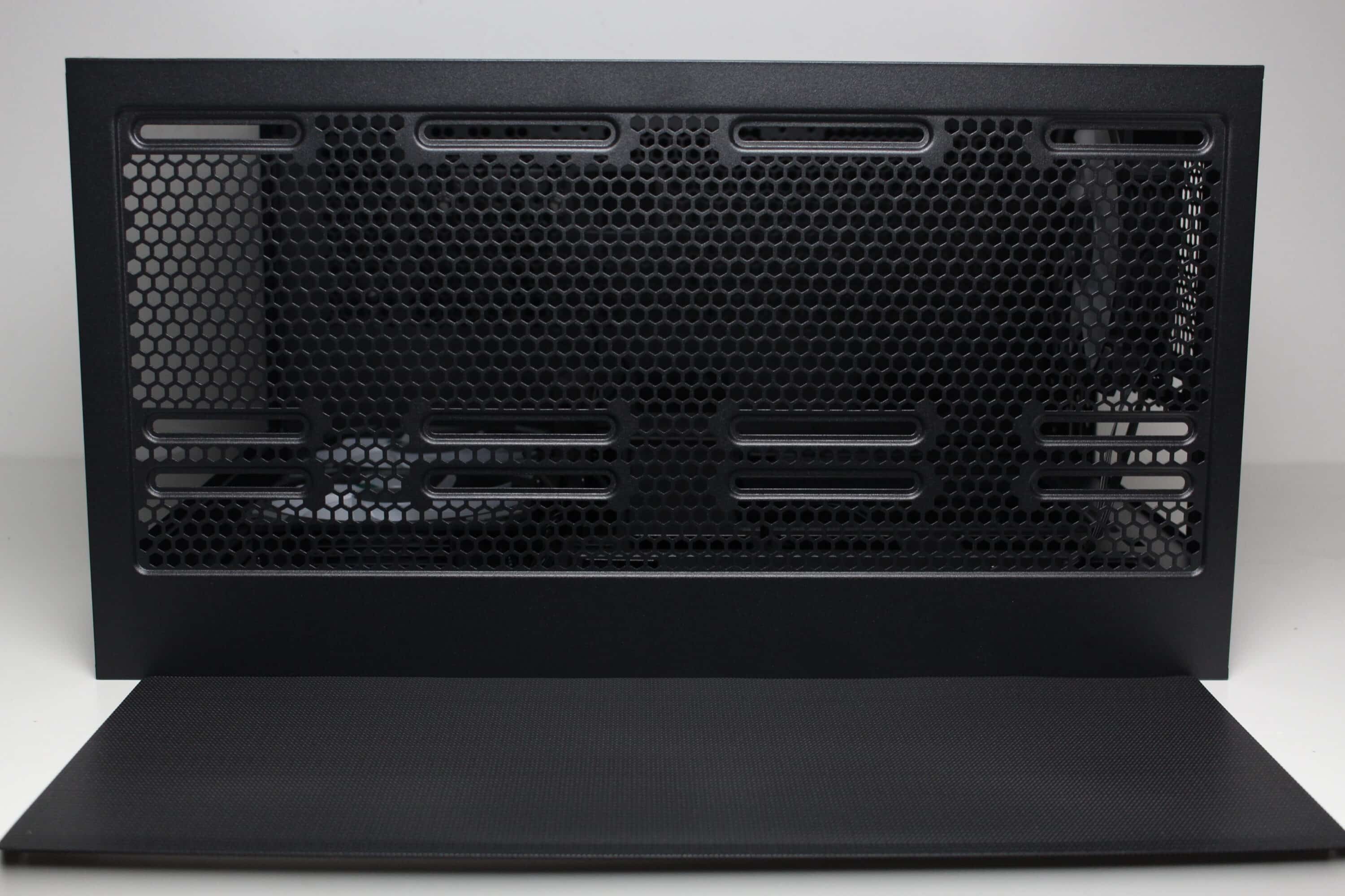 Senkt man den Blick, dann kann man die perforierte Netzteilabdeckung erkennen. Diese stattet der Hersteller mit drei Kabeldurchführungen und zahlreichen weiteren Bohrungen aus, die zur Montage von bis zu zwei 120-mm-Lüftern genutzt werden können. Entsprechende Schrauben liegen dem Lieferumfang bei. Fraglich ist dann nur wo die Luft herkommen soll, denn das einzige Gitter im Gehäuseboden wird vom Netzteil belegt. Ebenfalls im Lieferumfang findet sich eine magnetische GPU-Halterung, die flexibel auf der Netzteilabdeckung platziert werden kann.