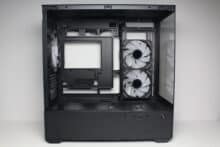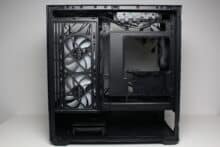 Obwohl das Sharkoon MK6 RGB ein Mini-Tower ist, bietet es im Inneren sehr viel Platz für Komponenten. So dürfen CPU-Kühler 170 Millimeter hoch und Grafikkarten bis zu 410 Millimeter lang sein, wenn seitlich kein Radiator verbaut wird. Mit HDD-Käfig darf das Netzteil nicht länger sein als 235 Millimeter. In Bezug auf eine Wasserkühlung bietet das MK6 RGB Platz für einen 360-mm-Radiator im Deckel sowie seitlich für ein 240-mm-Exemplar. Ein positiver Aspekt dieses Mini-Towers ist außerdem der Support für Mainboards mit rückwärtigen Anschlüssen wie z.B. aus der Asus BTF oder MSI Project Zero Serie.