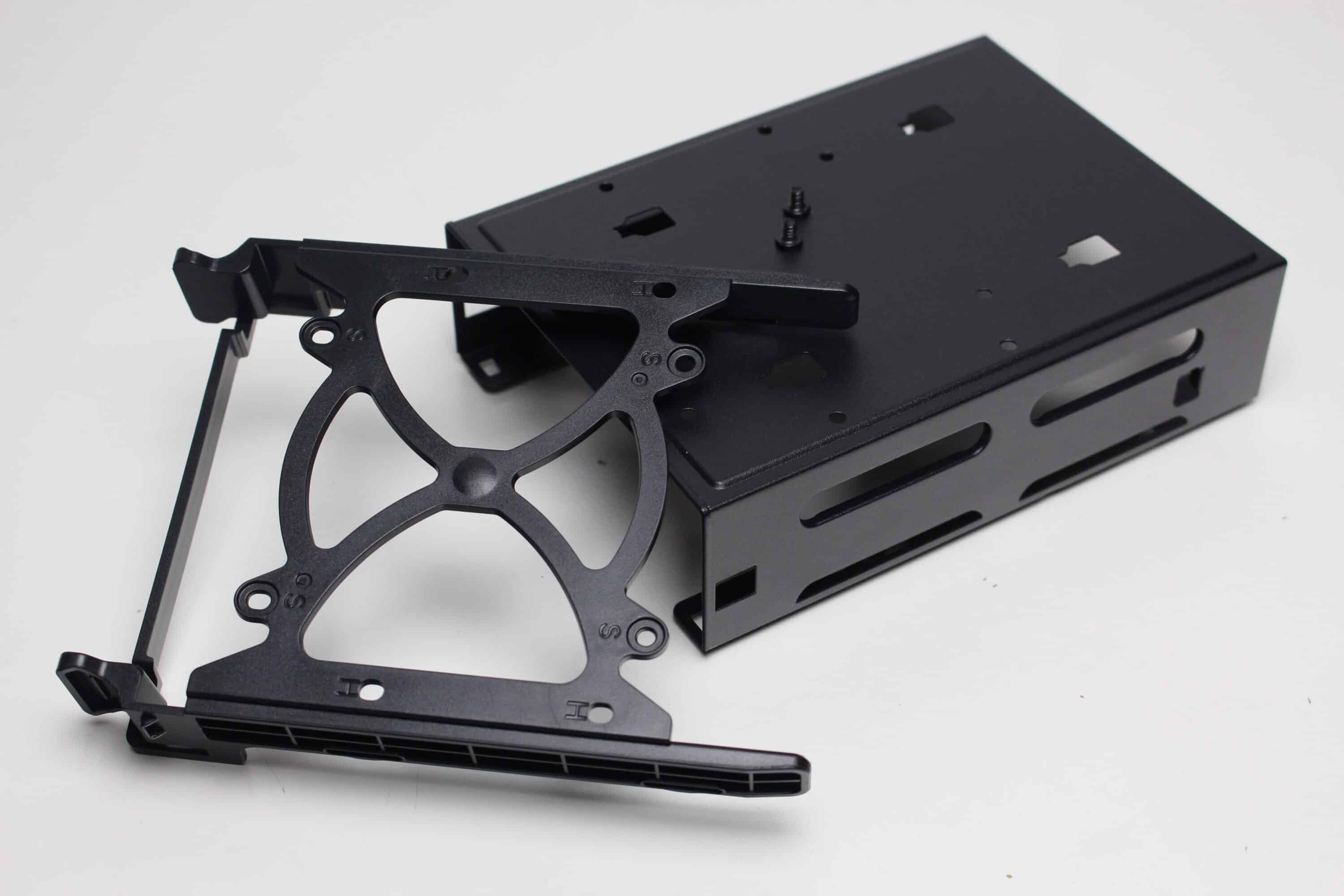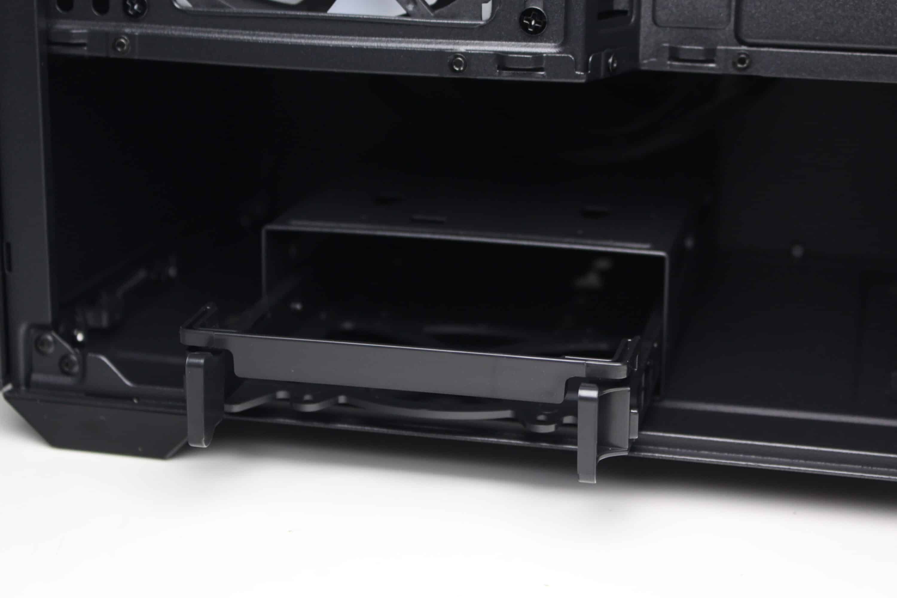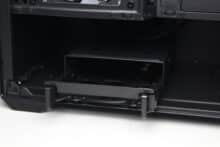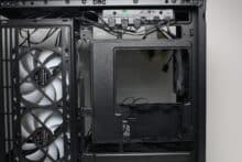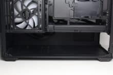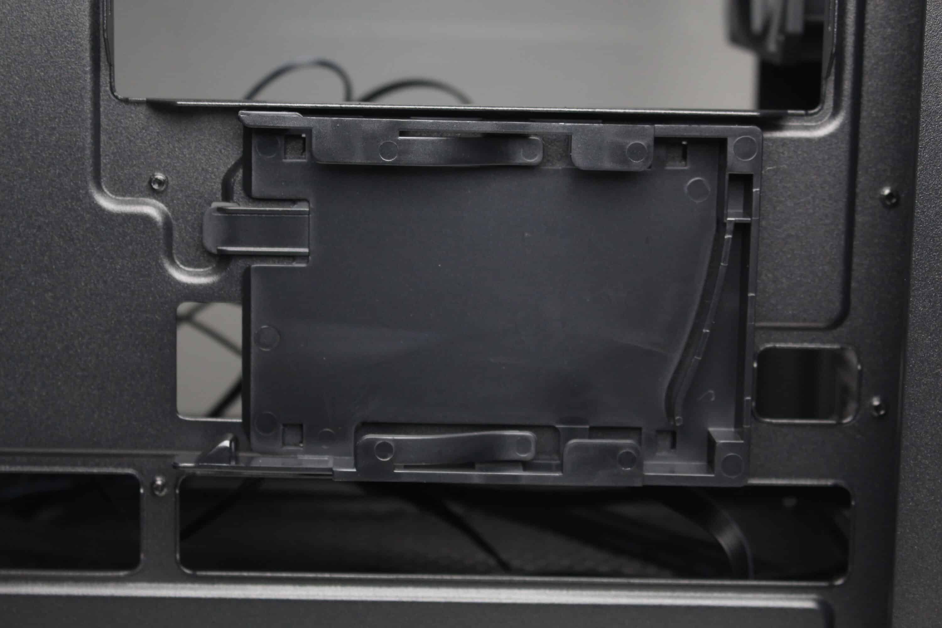 Zur Montage von Datenträgern bietet das Sharkoon MK6 RGB insgesamt drei Montagepunkte. Der modulare HDD-Käfig in der Netzteilkammer verfügt über einen Kunststoffrahmen für eine 3,5″- oder 2,5″-HDD und bietet oberhalb zusätzlich Platz für eine weitere 3,5″- oder 2,5″-HDD. Die letzte 2,5″-SSD kann hinter dem Mainboard-Tray in einem speziellen Kunststoffrahmen montiert werden. Alternativ kann dieser Rahmen auch am HDD-Käfig befestigt werden. Eine Entkopplung für die Datenträger implementiert der Hersteller generell nicht.