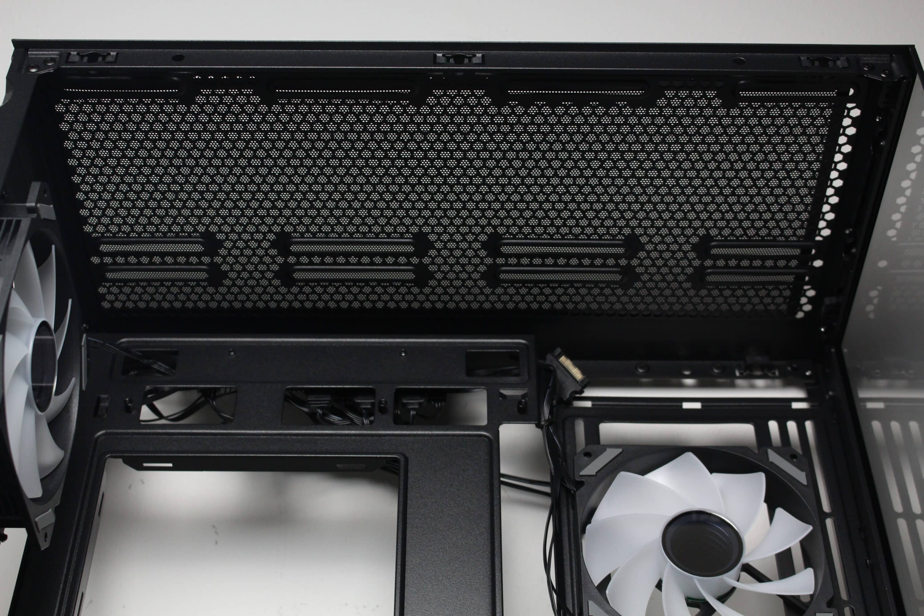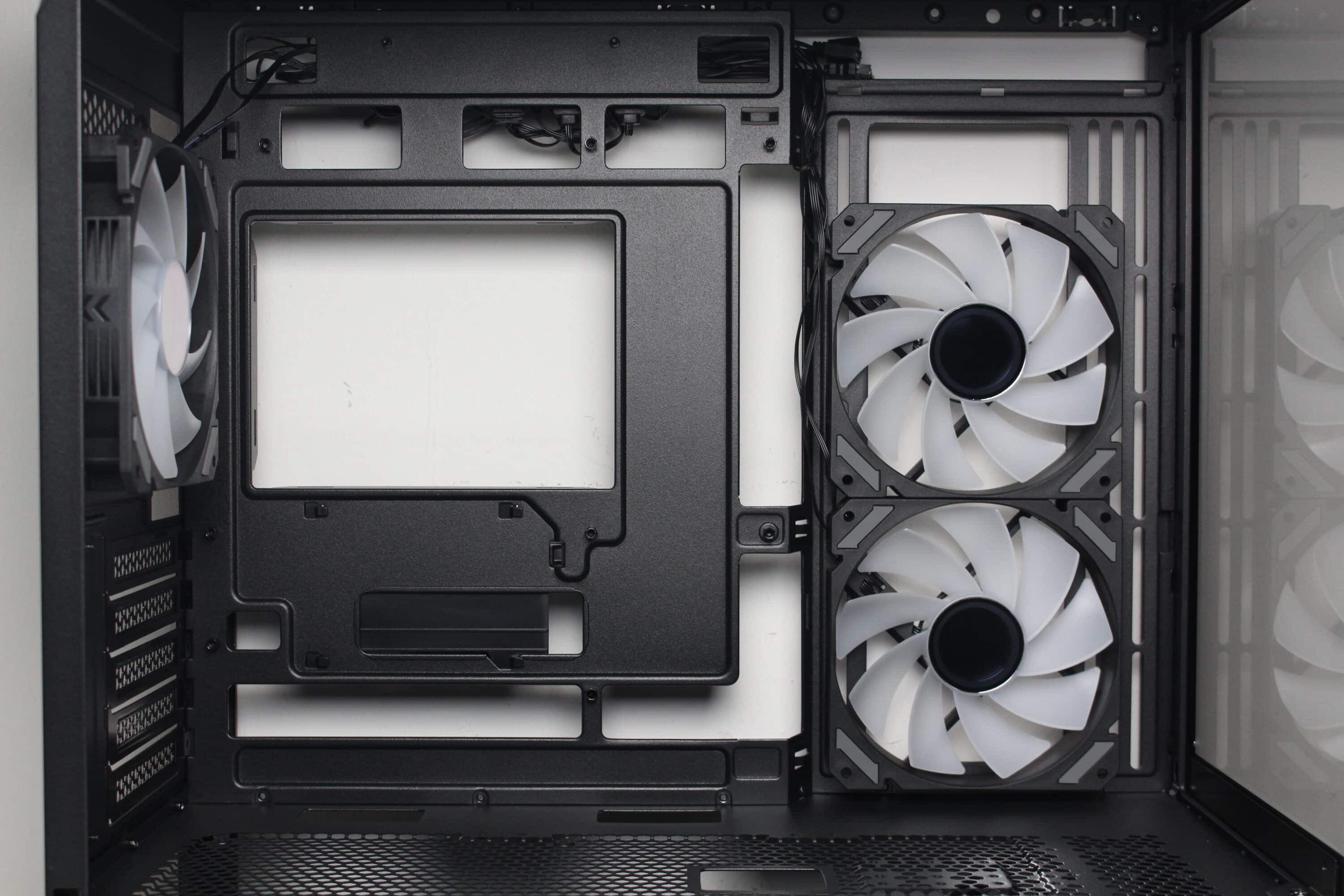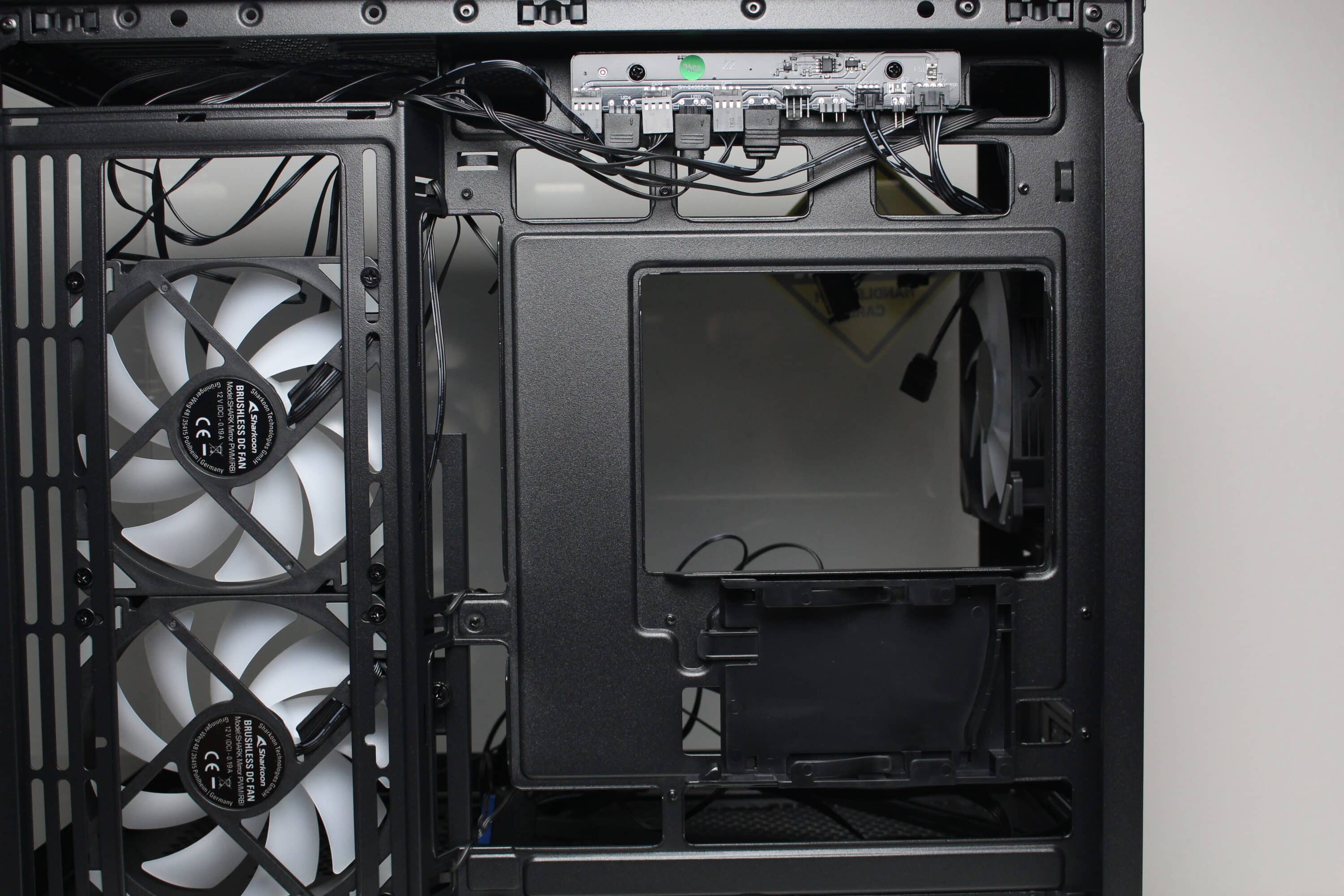 Den Innenraum unterteilt Sharkoon in zwei übereinanderliegende Kammern. Die große Hauptkammer bietet Platz für ein ATX-Mainboard, eine lange Grafikkarte bzw. einen großen CPU-Kühler oder eine Wasserkühlung. Das Mainboard-Tray ist plan gestaltet und wird an der rechten Seite durch Montageschienen für zwei 120-mm-Lüfter unterbrochen. Weiterhin verfügt das Tray über diverse Kabeldurchführungen sowie Öffnungen für Mainboards mit rückwärtigen Anschlüssen. Der obligatorische Ausschnitt zum Wechsel der Backplate eines CPU-Kühlers darf natürlich auch beim MK6 RGB nicht fehlen. Oberhalb des Mainboards ist ausreichend Platz für einen bis zu 60 Millimeter tiefen 360-mm-Radiator.