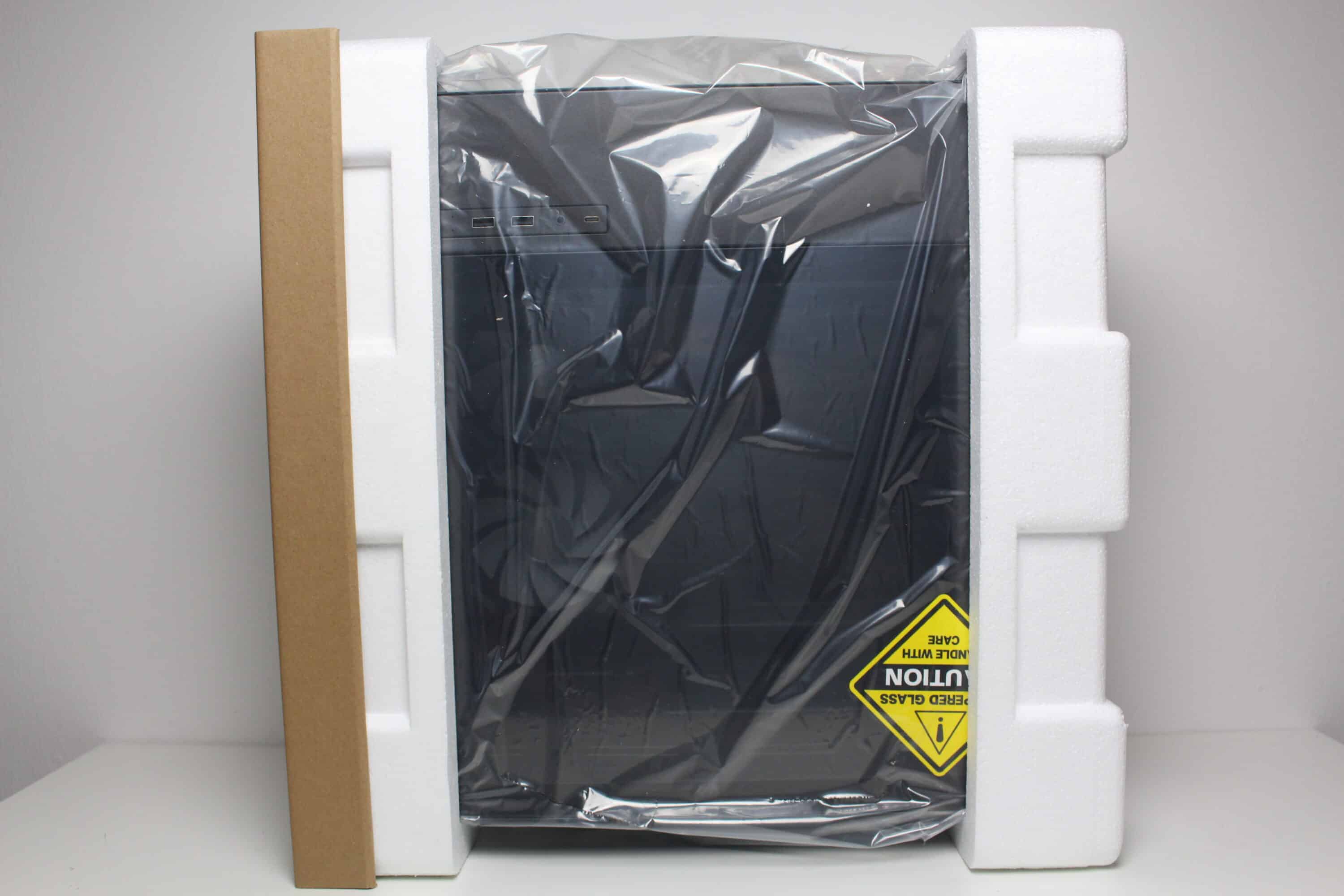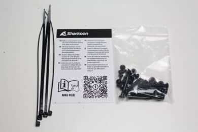 Im Inneren hüllt der Hersteller den Mini-Tower in eine Folie aus Kunststoff bzw. in zwei Blöcke aus herkömmlichem Styropor. Darüber hinaus wurde an der Ecke, wo sich die zwei Glasscheiben treffen, ein stabiler Winkel aus Pappe positioniert. Außerdem wurden alle Glaselemente mit jeweils einer Schutzfolie beklebt. Das Zubehör platziert Sharkoon im Innenraum des MK6 RGB in einer kleinen weißen Schachtel. Diese Schachtel wurde im HDD-Käfig verstaut und beinhaltet alle notwendigen Montageschrauben, eine Nuss zum Eindrehen der Abstandshalter, einige Kabelbinder sowie einen QR-Code zum Aufruf der Bedienungsanleitung.