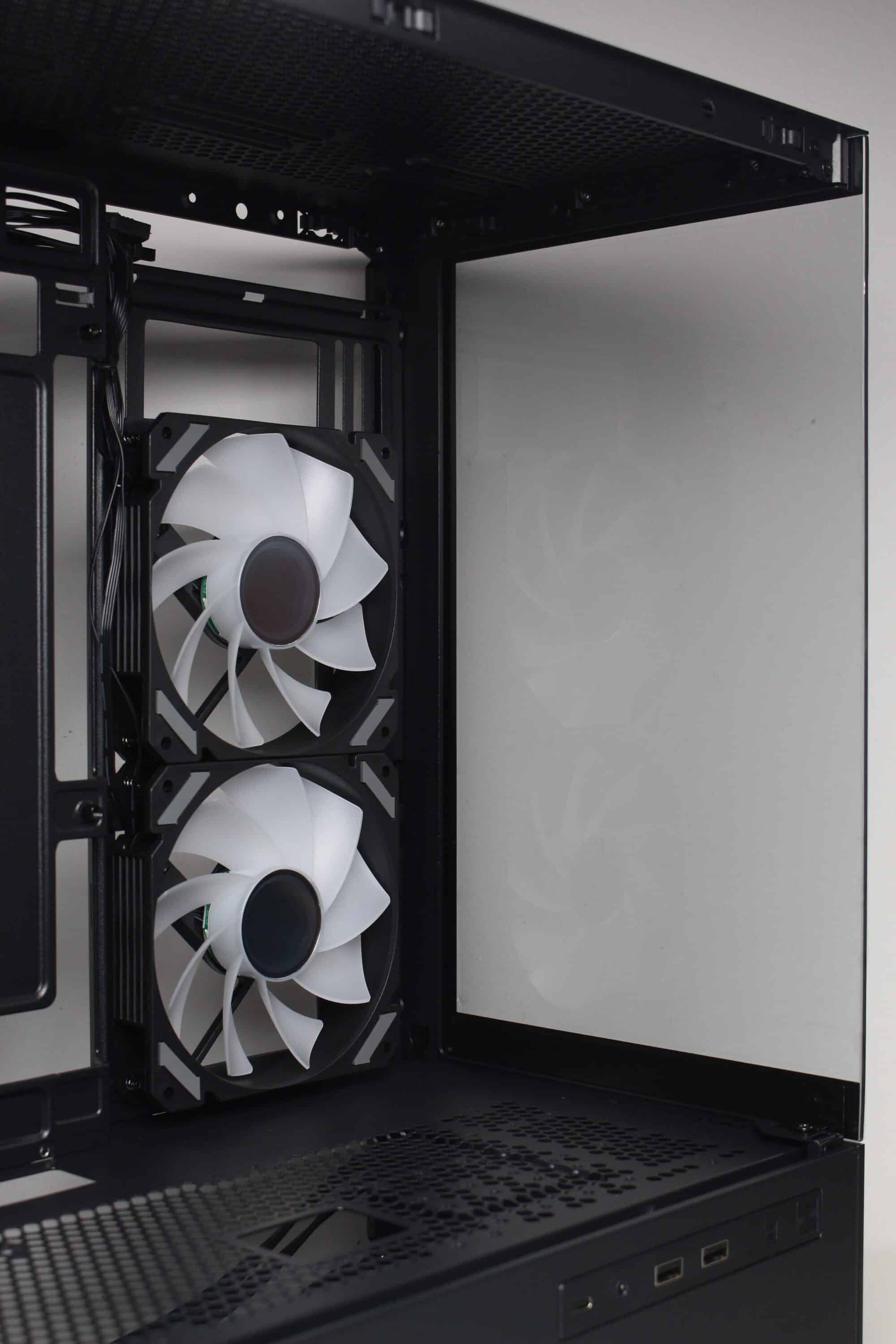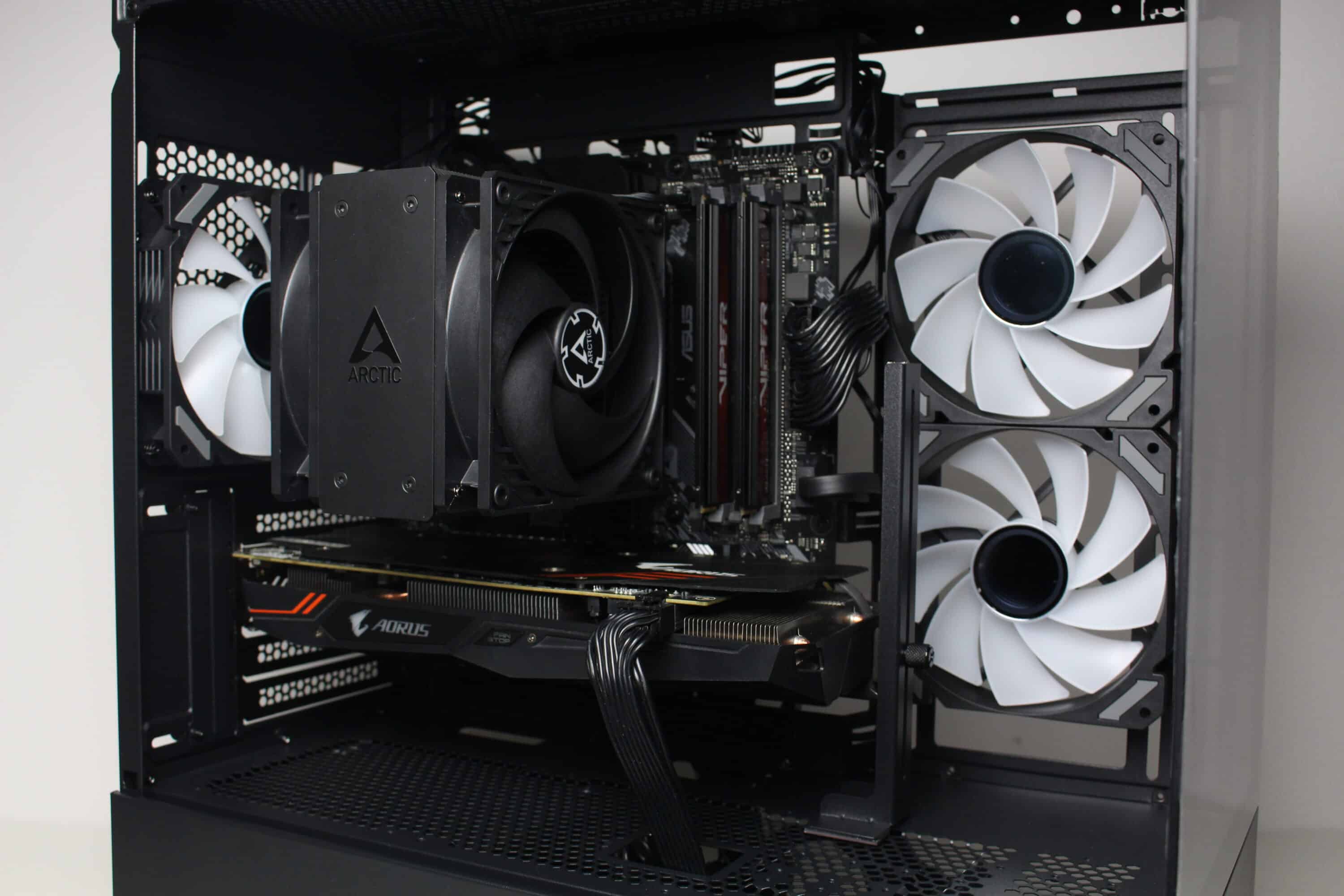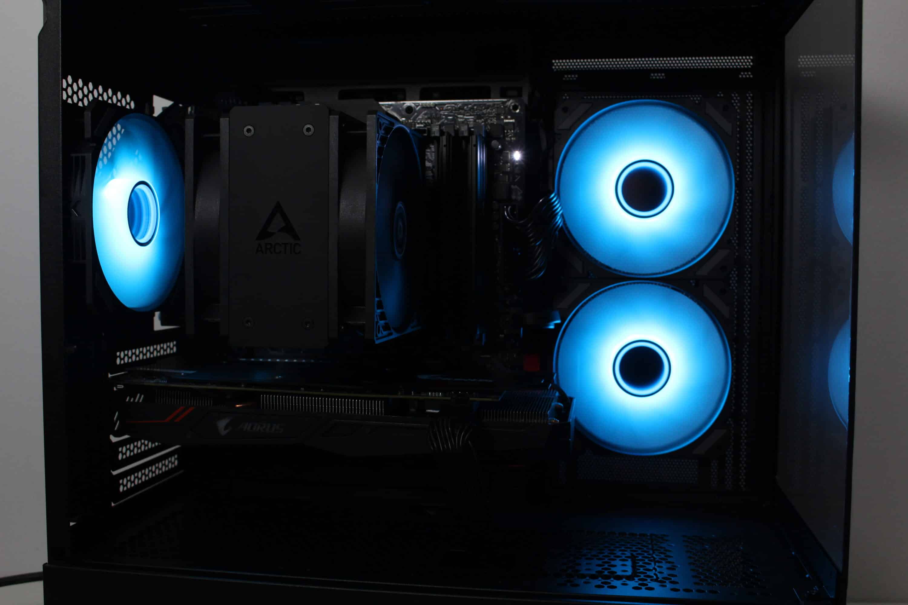 Bei voller Umdrehungszahl von fast 1800 Umdrehungen pro Minute ist es jedoch nicht verwunderlich, dass die Lüfter deutlich aus dem Gehäuse herauszuhören sind. Dennoch machen sie dabei ordentlich Wind und sorgen für eine ordentliche Kühlung des Prozessors sowie der Grafikkarte. Durch den großen Drehzahlbereich lassen sich die Lüfter aber auch deutlich leiser bzw. silent-tauglich betreiben.