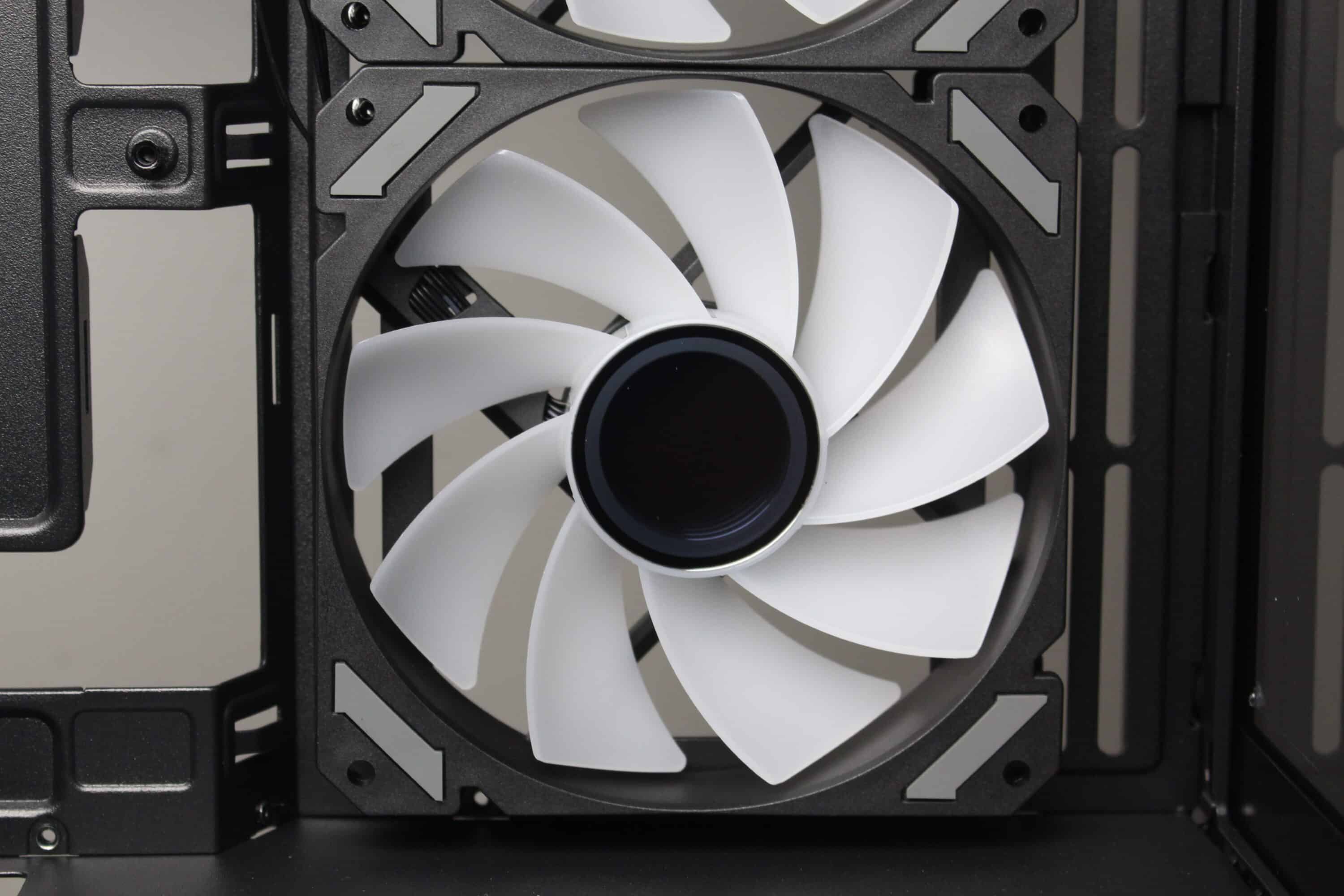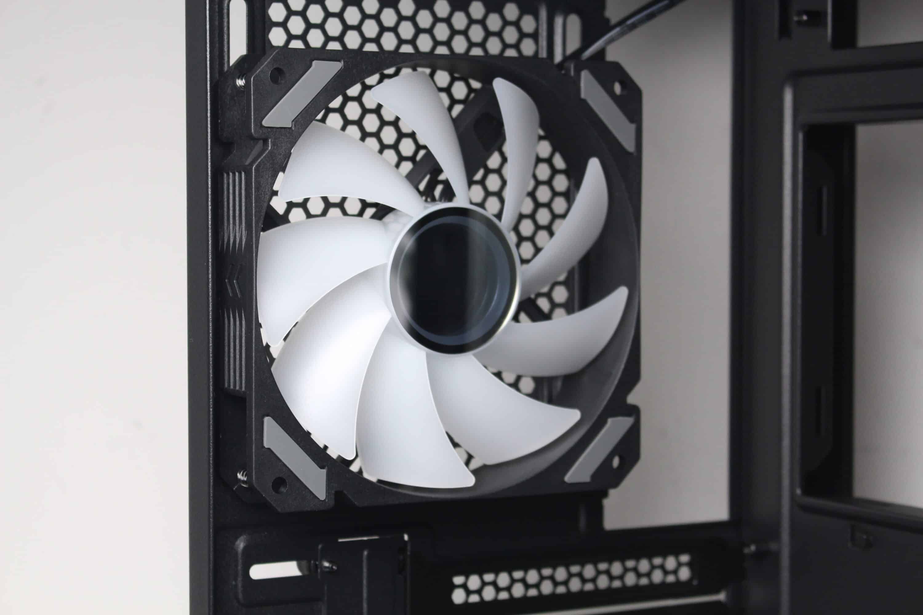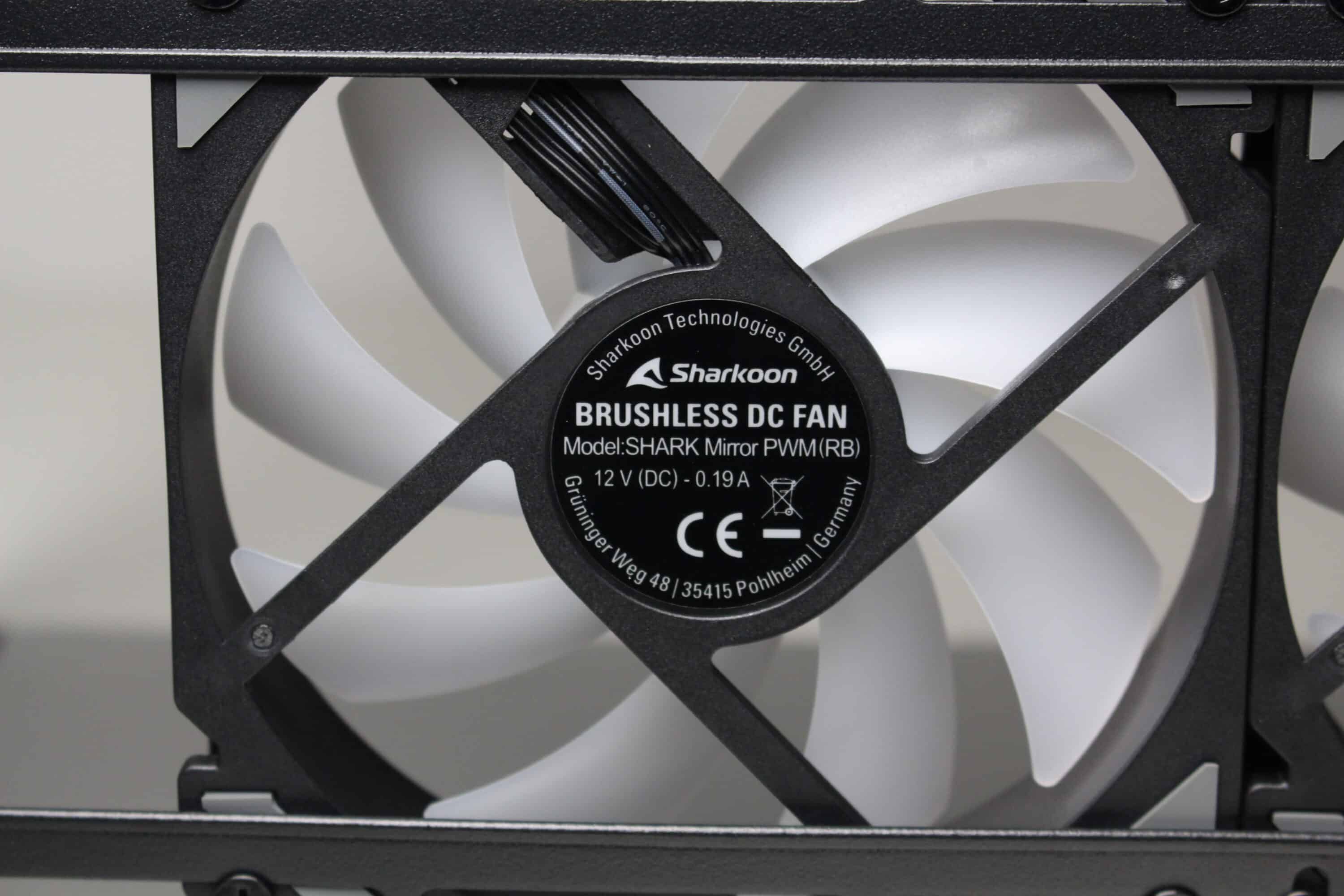 Ab Werk stattet Sharkoon das MK6 RGB mit drei ARGB-Lüftern aus. Einen normalen 120-mm-Lüfter platziert der Hersteller im Heck, zwei invertierte 120-mm-Exemplare rechts neben dem Mainboard-Tray. Alle Lüfter verfügen jeweils über einen 4-Pin PWM- bzw. einen 3-Pin 5V ARGB-Anschluss. Optisch setzt Sharkoon bei den Lüftern auf einen schwarzen Rahmen und milchig-weiße Rotoren mit neun Lüfterblättern. Der Drehzahlbereich liegt zwischen 500 und 1800 Umdrehungen pro Minute.